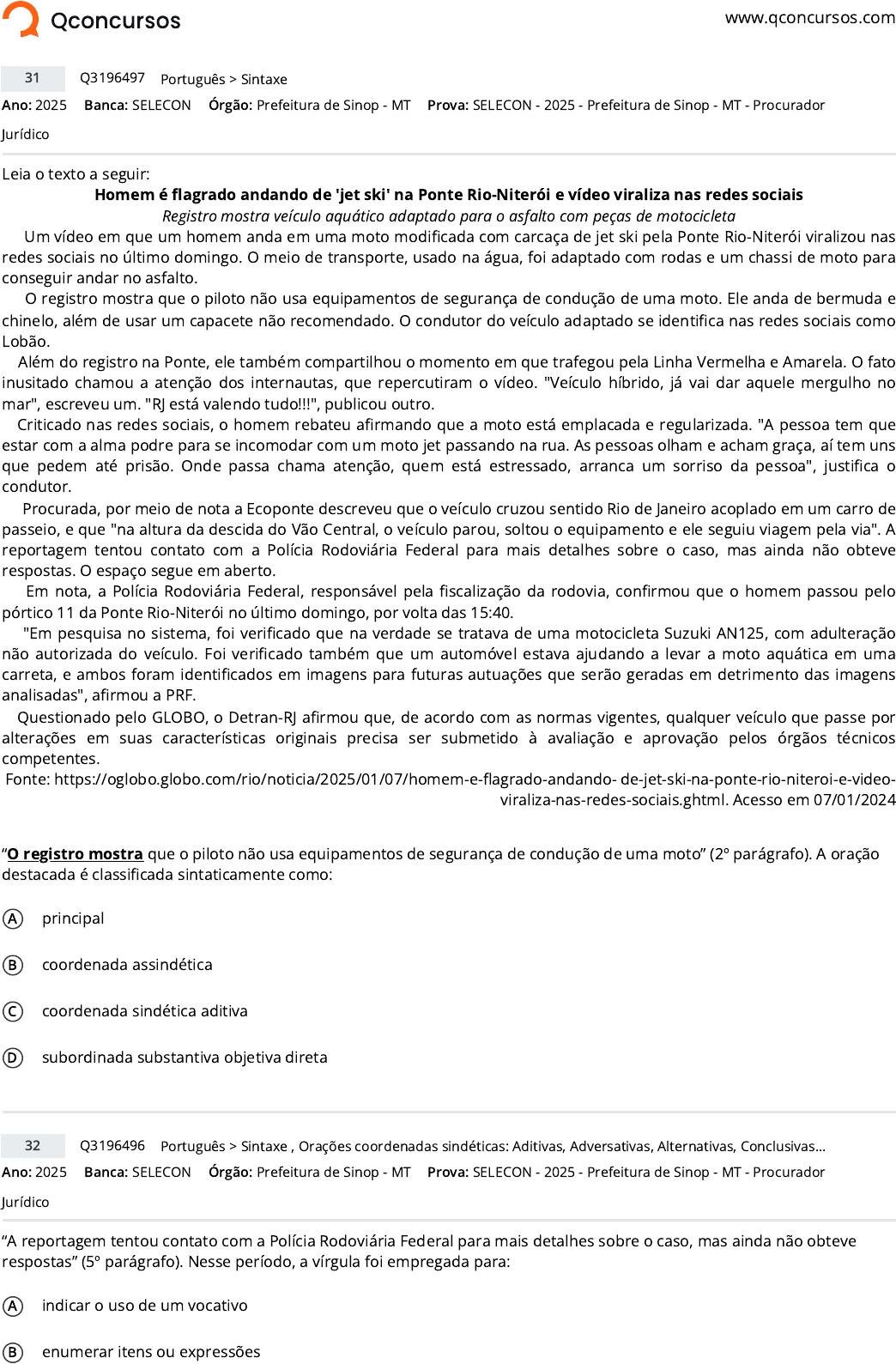www.qconcursos.com Ano: 2025 Banca: SELECON Órgão: Prefeitura de Sinop - MT Leia o texto a seguir: Homem é flagrado andando de 'jet ski' na Ponte Rio-Niterói e vídeo viraliza nas redes sociais Registro mostra veículo aquático adaptado para o asfalto com peças de motocicleta Um vídeo em que um homem anda em uma moto modificada com carcaça de jet ski pela Ponte Rio-Niterói viralizou nas redes sociais no último domingo. O meio de transporte, usado na água, foi adaptado com rodas e um chassi de moto para conseguir andar no asfalto. O registro mostra que o piloto não usa equipamentos de segurança de condução de uma moto. Ele anda de bermuda e chinelo, além de usar um capacete não recomendado. O condutor do veículo adaptado se identifica nas redes sociais como Lobão. Além do registro na Ponte, ele também compartilhou o momento em que trafegou pela Linha Vermelha e Amarela. O fato inusitado chamou a atenção dos internautas, que repercutiram o vídeo. "Veículo híbrido, já vai dar aquele mergulho no mar", escreveu um. "RJ está valendo tudo!!!", publicou outro. Criticado nas redes sociais, o homem rebateu afirmando que a moto está emplacada e regularizada. "A pessoa tem que estar com a alma podre para se incomodar com um moto jet passando na rua. As pessoas olham e acham graça, aí tem uns que pedem até prisão. Onde passa chama atenção, quem está estressado, arranca um sorriso da pessoa", justifica o condutor. Procurada, por meio de nota a Ecoponte descreveu que o veículo cruzou sentido Rio de Janeiro acoplado em um carro de passeio, e que "na altura da descida do Vão Central, o veículo parou, soltou o equipamento e ele seguiu viagem pela via". A reportagem tentou contato com a Polícia Rodoviária Federal para mais detalhes sobre o caso, mas ainda não obteve respostas. O espaço segue em aberto. Em nota, a Polícia Rodoviária Federal, responsável pela fiscalização da rodovia, confirmou que o homem passou pelo pórtico 11 da Ponte Rio-Niterói no último domingo, por volta das 15:40. "Em pesquisa no sistema, foi verificado que na verdade se tratava de uma motocicleta Suzuki AN125, com adulteração não autorizada do veículo. Foi verificado também que um automóvel estava ajudando a levar a moto aquática em uma carreta, e ambos foram identificados em imagens para futuras autuações que serão geradas em detrimento das imagens analisadas", afirmou a PRF. Questionado pelo GLOBO, o Detran-RJ afirmou que, de acordo com as normas vigentes, qualquer veículo que passe por alterações em suas características originais precisa ser submetido à avaliação e aprovação pelos órgãos técnicos competentes. Fonte: https://oglobo.globo.com/rio/noticia/2025/01/07/homem-e-flagrado-andando- de-jet-ski-na-ponte-rio-niteroi-e-video- viraliza-nas-redes-sociais.ghtml. Acesso em 07/01/2024 “O registro mostra que o piloto não usa equipamentos de segurança de condução de uma moto” (2º parágrafo). A oração destacada é classificada sintaticamente como: A principal B coordenada assindética C coordenada sindética aditiva D subordinada substantiva objetiva direta Ano: 2025 Banca: SELECON Órgão: Prefeitura de Sinop - MT “A reportagem tentou contato com a Polícia Rodoviária Federal para mais detalhes sobre o caso, mas ainda não obteve respostas” (5º parágrafo). Nesse período, a vírgula foi empregada para: A indicar o uso de um vocativo B enumerar itens ou expressões 31 Q3196497 >Português Sintaxe Prova: SELECON - 2025 - Prefeitura de Sinop - MT - Procurador Jurídico 32 Q3196496 >Português Sintaxe , Orações coordenadas sindéticas: Aditivas, Adversativas, Alternativas, Conclusivas... Prova: SELECON - 2025 - Prefeitura de Sinop - MT - Procurador Jurídico https://www.qconcursos.com/ https://www.qconcursos.com/questoes-de-concursos/bancas/selecon https://www.qconcursos.com/questoes-de-concursos/institutos/prefeitura-de-sinop-mt https://www.qconcursos.com/questoes-de-concursos/bancas/selecon https://www.qconcursos.com/questoes-de-concursos/institutos/prefeitura-de-sinop-mt https://www.qconcursos.com/questoes-de-concursos/questoes/7d6dd3bd-e9 https://www.qconcursos.com/questoes-de-concursos/disciplinas/letras-portugues https://www.qconcursos.com/questoes-de-concursos/disciplinas/letras-portugues/sintaxe https://www.qconcursos.com/questoes-de-concursos/provas/selecon-2025-prefeitura-de-sinop-mt-procurador-juridico https://www.qconcursos.com/questoes-de-concursos/provas/selecon-2025-prefeitura-de-sinop-mt-procurador-juridico https://www.qconcursos.com/questoes-de-concursos/questoes/7d6b1c05-e9 https://www.qconcursos.com/questoes-de-concursos/disciplinas/letras-portugues https://www.qconcursos.com/questoes-de-concursos/disciplinas/letras-portugues/sintaxe https://www.qconcursos.com/questoes-de-concursos/disciplinas/letras-portugues/oracoes-coordenadas-sindeticas-aditivas-adversativas-alternativas-conclusivas https://www.qconcursos.com/questoes-de-concursos/provas/selecon-2025-prefeitura-de-sinop-mt-procurador-juridico https://www.qconcursos.com/questoes-de-concursos/provas/selecon-2025-prefeitura-de-sinop-mt-procurador-juridico C apontar o uso de um aposto explicativo D separar uma oração coordenada sindética adversativa Ano: 2025 Banca: SELECON Órgão: Prefeitura de Sinop - MT No título do texto (“Homem é flagrado andando de 'jet ski' na Ponte Rio-Niterói e vídeo viraliza nas redes sociais”), o verbo em destaque é classificado como: A intransitivo B transitivo direto C transitivo indireto D transitivo direto e indireto Ano: 2025 Banca: SELECON Órgão: Prefeitura de Sinop - MT Na palavra INTERNAUTA, o elemento mórfico destacado significa pessoa que: A é viciada em redes sociais B utiliza regularmente a internet C que navega pelo espaço sideral D que navega nas ondas de rios e baías Ano: 2025 Banca: SELECON Órgão: Prefeitura de Sinop - MT Em “As pessoas olham e acham graça, aí tem uns que pedem até prisão” (4º parágrafo)