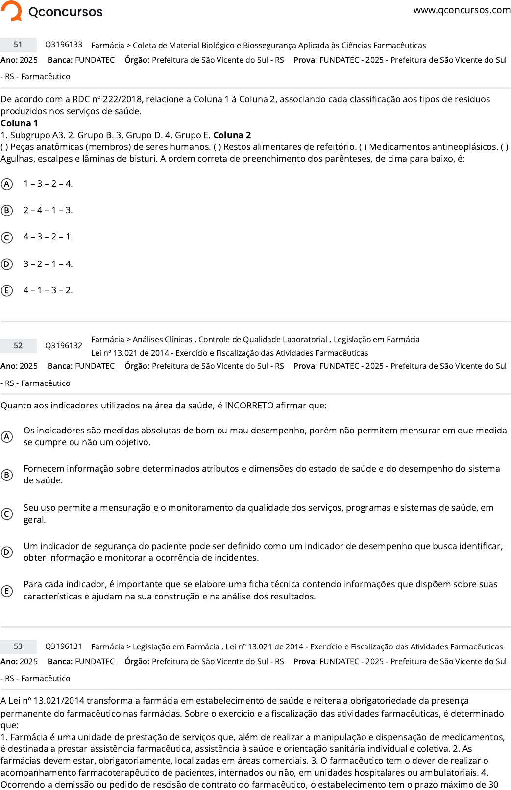 www.qconcursos.com Ano: 2025 Banca: FUNDATEC Órgão: Prefeitura de São Vicente do Sul - RS De acordo com a RDC nº 222/2018, relacione a Coluna 1 à Coluna 2, associando cada classificação aos tipos de resíduos produzidos nos serviços de saúde. Coluna 1 1. Subgrupo A3. 2. Grupo B. 3. Grupo D. 4. Grupo E. Coluna 2 ( ) Peças anatômicas (membros) de seres humanos. ( ) Restos alimentares de refeitório. ( ) Medicamentos antineoplásicos. ( ) Agulhas, escalpes e lâminas de bisturi. A ordem correta de preenchimento dos parênteses, de cima para baixo, é: A 1 – 3 – 2 – 4. B 2 – 4 – 1 – 3. C 4 – 3 – 2 – 1. D 3 – 2 – 1 – 4. E 4 – 1 – 3 – 2. Ano: 2025 Banca: FUNDATEC Órgão: Prefeitura de São Vicente do Sul - RS Quanto aos indicadores utilizados na área da saúde, é INCORRETO afirmar que: A Os indicadores são medidas absolutas de bom ou mau desempenho, porém não permitem mensurar em que medida se cumpre ou não um objetivo. B Fornecem informação sobre determinados atributos e dimensões do estado de saúde e do desempenho do sistema de saúde. C Seu uso permite a mensuração e o monitoramento da qualidade dos serviços, programas e sistemas de saúde, em geral. D Um indicador de segurança do paciente pode ser definido como um indicador de desempenho que busca identificar, obter informação e monitorar a ocorrência de incidentes. E Para cada indicador, é importante que se elabore uma ficha técnica contendo informações que dispõem sobre suas características e ajudam na sua construção e na análise dos resultados. Ano: 2025 Banca: FUNDATEC Órgão: Prefeitura de São Vicente do Sul - RS A Lei nº 13.021/2014 transforma a farmácia em estabelecimento de saúde e reitera a obrigatoriedade da presença permanente do farmacêutico nas farmácias. Sobre o exercício e a fiscalização das atividades farmacêuticas, é determinado que: 1. Farmácia é uma unidade de prestação de serviços que, além de realizar a manipulação e dispensação de medicamentos, é destinada a prestar assistência farmacêutica, assistência à saúde e orientação sanitária individual e coletiva. 2. As farmácias devem estar, obrigatoriamente, localizadas em áreas comerciais. 3. O farmacêutico tem o dever de realizar o acompanhamento farmacoterapêutico de pacientes, internados ou não, em unidades hospitalares ou ambulatoriais. 4. Ocorrendo a demissão ou pedido de rescisão de contrato do farmacêutico, o estabelecimento tem o prazo máximo de 30 51 Q3196133 >Farmácia Coleta de Material Biológico e Biossegurança Aplicada às Ciências Farmacêuticas Prova: FUNDATEC - 2025 - Prefeitura de São Vicente do Sul - RS - Farmacêutico 52 Q3196132 >Farmácia Análises Clínicas , Controle de Qualidade Laboratorial , Legislação em Farmácia Lei nº 13.021 de 2014 - Exercício e Fiscalização das Atividades Farmacêuticas Prova: FUNDATEC - 2025 - Prefeitura de São Vicente do Sul - RS - Farmacêutico 53 Q3196131 >Farmácia Legislação em Farmácia , Lei nº 13.021 de 2014 - Exercício e Fiscalização das Atividades Farmacêuticas Prova: FUNDATEC - 2025 - Prefeitura de São Vicente do Sul - RS - Farmacêutico https://www.qconcursos.com/ https://www.qconcursos.com/questoes-de-concursos/bancas/fundatec https://www.qconcursos.com/questoes-de-concursos/institutos/prefeitura-de-sao-vicente-do-sul-rs https://www.qconcursos.com/questoes-de-concursos/bancas/fundatec https://www.qconcursos.com/questoes-de-concursos/institutos/prefeitura-de-sao-vicente-do-sul-rs https://www.qconcursos.com/questoes-de-concursos/bancas/fundatec https://www.qconcursos.com/questoes-de-concursos/institutos/prefeitura-de-sao-vicente-do-sul-rs https://www.qconcursos.com/questoes-de-concursos/questoes/5c3ae445-e9 https://www.qconcursos.com/questoes-de-concursos/disciplinas/farmacia-farmacia https://www.qconcursos.com/questoes-de-concursos/disciplinas/farmacia-farmacia/coleta-de-material-biologico-e-biosseguranca-aplicada-as-ciencias-farmaceuticas https://www.qconcursos.com/questoes-de-concursos/provas/fundatec-2025-prefeitura-de-sao-vicente-do-sul-rs-farmaceutico https://www.qconcursos.com/questoes-de-concursos/provas/fundatec-2025-prefeitura-de-sao-vicente-do-sul-rs-farmaceutico https://www.qconcursos.com/questoes-de-concursos/questoes/5c37f6cc-e9 https://www.qconcursos.com/questoes-de-concursos/disciplinas/farmacia-farmacia https://www.qconcursos.com/questoes-de-concursos/disciplinas/farmacia-farmacia/analises-clinicas https://www.qconcursos.com/questoes-de-concursos/disciplinas/farmacia-farmacia/controle-de-qualidade-laboratorial https://www.qconcursos.com/questoes-de-concursos/disciplinas/farmacia-farmacia/legislacao-em-farmacia https://www.qconcursos.com/questoes-de-concursos/disciplinas/farmacia-farmacia/lei-n-13-021-de-2014-exercicio-e-fiscalizacao-das-atividades-farmaceuticas https://www.qconcursos.com/questoes-de-concursos/provas/fundatec-2025-prefeitura-de-sao-vicente-do-sul-rs-farmaceutico https://www.qconcursos.com/questoes-de-concursos/provas/fundatec-2025-prefeitura-de-sao-vicente-do-sul-rs-farmaceutico https://www.qconcursos.com/questoes-de-concursos/questoes/5c354614-e9 https://www.qconcursos.com/questoes-de-concursos/disciplinas/farmacia-farmacia https://www.qconcursos.com/questoes-de-concursos/disciplinas/farmacia-farmacia/legislacao-em-farmacia https://www.qconcursos.com/questoes-de-concursos/disciplinas/farmacia-farmacia/lei-n-13-021-de-2014-exercicio-e-fiscalizacao-das-atividades-farmaceuticas https://www.qconcursos.com/questoes-de-concursos/provas/fundatec-2025-prefeitura-de-sao-vicente-do-sul-rs-farmaceutico https://www.qconcursos.com/questoes-de-concursos/provas/fundatec-2025-prefeitura-de-sao-vicente-do-sul-rs-farmaceutico dias para a contratação de um novo profissional. O resultado da somatória dos números correspondentes às afirmações corretas é: A 04. B 06. C 08. D 09. E 10. Ano: 2025 Banca: FUNDATEC Órgão: Prefeitura de São Vicente do Sul - RS As Boas Pr