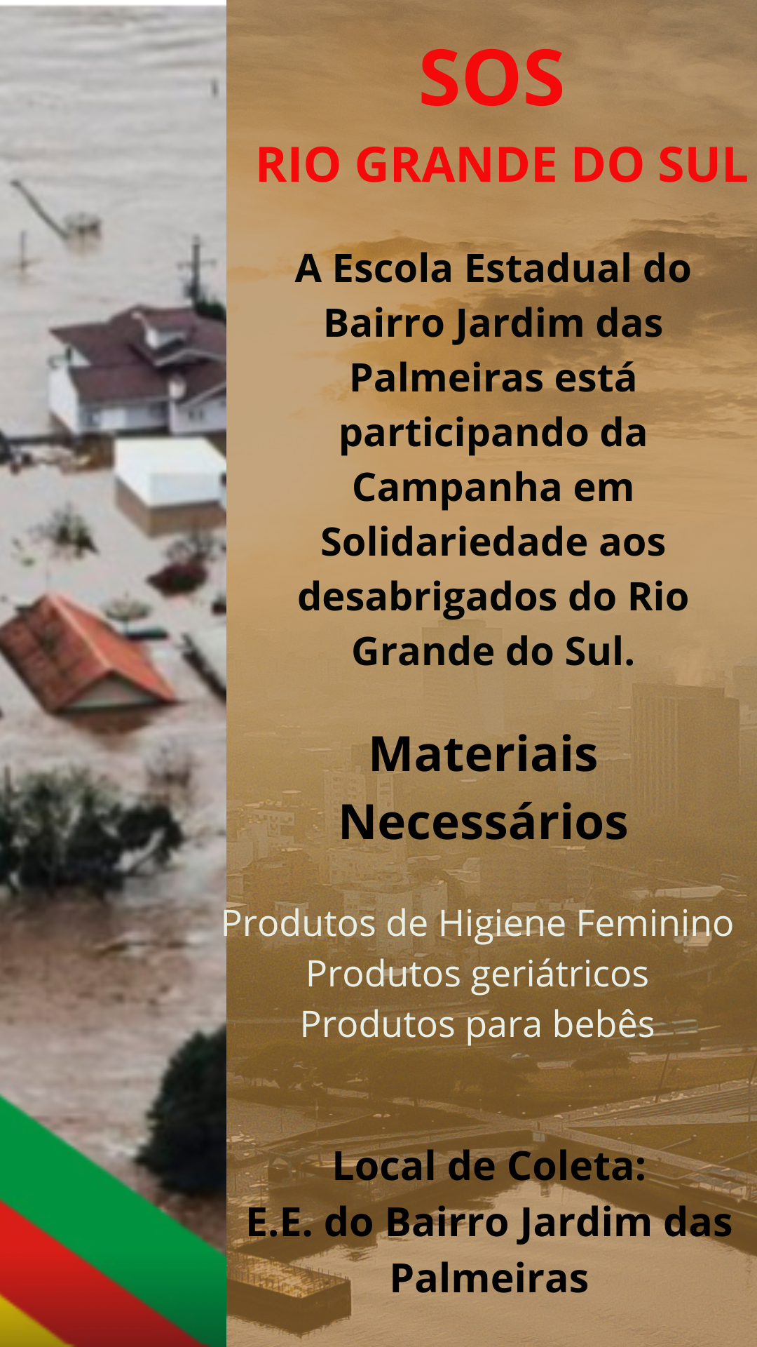 SOS RIO GRANDE DO SUL A Escola Estadual do Bairro Jardim das Palmeiras está participando da Campanha em Solidariedade aos desabrigados do Rio Grande do Sul. Materiais Necessários Produtos de Higiene Feminino Produtos geriátricos Produtos para bebês Local de Coleta: E.E. do Bairro Jardim das Palmeiras