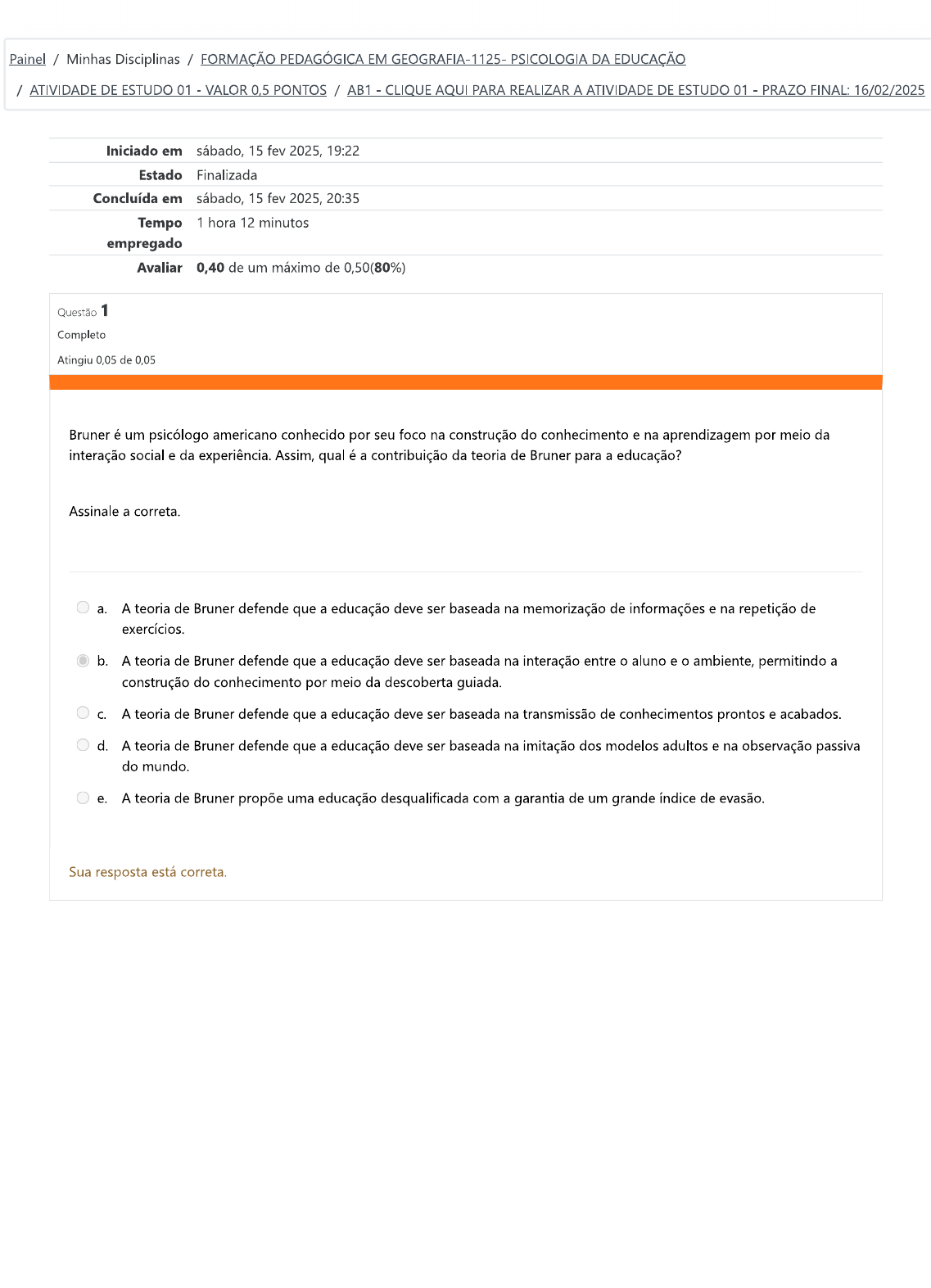 Painel / Minhas Disciplinas / FORMAÇÃO PEDAGÓGICA EM GEOGRAFIA-1125- PSICOLOGIA DA EDUCAÇÃO / ATIVIDADE DE ESTUDO 01 - VALOR 0,5 PONTOS / AB1 - CLIQUE AQUI PARA REALIZAR A ATIVIDADE DE ESTUDO 01 - PRAZO FINAL: 16/02/2025 Iniciado em sábado 15 fev 2025, 19:22 Estado Finalizada Concluída em sábado 15 fev 2025, 20:35 Tempo 1 hora 12 minutos empregado Avaliar 0,40 de um máximo de 0,50(80%) Questão 1 Completo Atingiu 0,05 de 0,05 Bruner é um psicólogo americano conhecido por seu foco na construção do conhecimento e na aprendizagem por meio da interação social e da experiência. Assim, qual é a contribuição da teoria de Bruner para a educação? Assinale a correta. a. A teoria de Bruner defende que a educação deve ser baseada na memorização de informações e na repetição de exercícios. b. A teoria de Bruner defende que a educação deve ser baseada na interação entre o aluno e o ambiente, permitindo a construção do conhecimento por meio da descoberta guiada. C. A teoria de Bruner defende que a educação deve ser baseada na transmissão de conhecimentos prontos e acabados. d. A teoria de Bruner defende que a educação deve ser baseada na imitação dos modelos adultos e na observação passiva do mundo. e. A teoria de Bruner propõe uma educação desqualificada com a garantia de um grande índice de evasão. Sua resposta está correta.Questão 2 Completo Atingiu 0,00 de 0,05 A resistência à pesquisa pode apresentar-se como um formidável obstáculo para a adoção de novas perspectivas e abordagens no campo da pesquisa em psicologia. Diante desse contexto desafiador, qual das seguintes afirmações melhor reflete a realidade da mudança de paradigma? Assinale a correta. a. Uma mudança de paradigma é uma transição puramente intelectual, minimamente afetada por influências sociais e culturais. b. Uma mudança de paradigma é geralmente saudada como um avanço positivo e raramente é percebida como uma ameaça à identidade profissional ou à metodologia de pesquisa. C. Uma mudança de paradigma pode ser percebida como uma ameaça à identidade profissional e à maneira como a pesquisa é realizada. d. A mudança de paradigma ocorre apenas em áreas específicas da psicologia, como a psicologia educacional. e. A mudança de paradigma é um fenômeno raro que ocorre apenas em áreas altamente especializadas da psicologia, como a psicologia educacional. Sua resposta está incorreta. Questão 3 Completo Atingiu 0,00 de 0,05 Em que outras áreas da psicologia têm sido aplicadas para melhorar a compreensão e a intervenção em questões relacionadas ao comportamento humano? Assinale a correta. a. Apenas na psicologia cognitiva. b. Na psicologia clínica, organizacional e cognitiva. C. Na psicologia clínica e cognitiva. d. Apenas na psicologia clínica. e. Apenas na psicologia behaviorista. Sua resposta está incorreta.Questão 4 Completo Atingiu 0,05 de 0,05 Já na teoria de Vygotsky, também que muito destacada no âmbito da psicologia, compreendemos que a teoria sócio-histórica de Vygotsky oferece uma perspectiva profundamente enraizada na interação social e no contexto cultural como pilares essenciais para a aprendizagem e o desenvolvimento humanos. Qual é a definição correta da zona de desenvolvimento proximal (ZDP) proposta por Lev Vygotsky? Assinale a correta. a. A ZDP está a distância entre o nível atual de desenvolvimento de uma criança e o nível de desenvolvimento que ela pode atingir com a ajuda de um computador ou de um dispositivo eletrônico. b. A ZDP está a distância entre o nível atual de desenvolvimento de uma criança e o nível de desenvolvimento que ela pode atingir sozinha, sem a ajuda de um adulto ou de um colega mais experiente. C. Incorreta A ZDP está a distância entre o nível atual de desenvolvimento de uma criança e o nível de desenvolvimento que ela pode atingir por meio da imitação dos modelos adultos e da observação passiva do mundo. d. Incorreta A ZDP está a distância entre o nível atual de desenvolvimento de uma criança e o nível de desenvolvimento que ela pode atingir por meio da memorização de informações e da reprodução de exercícios. e. A ZDP está a distância entre o nível atual de desenvolvimento de uma criança e o nível de desenvolvimento que ela pode atingir com a ajuda de um adulto ou de um colega mais experiente. Sua resposta está correta.Questão 5 Completo Atingiu 0,05 de 0,05 Jean Piaget foi um psicólogo suíço que desenvolveu teorias sobre o desenvolvimento cognitivo infantil. Segundo a teoria de Piaget, o desenvolvimento cognitivo ocorre por meio de processos de assimilação e acomodação, e a aprendizagem deve ser baseada na descoberta guiada, em que o professor atua como mediador entre o aluno e o conhecimento. Com base no texto acima, analise as asserções abaixo: I) Jean Piaget foi um psicólogo francês que desenvolveu teorias sobre o desenvolvimento cognitivo infantil. II) Segundo a teoria de Piaget, o desenvolvimento cognitivo ocorre por meio de processos de acomodação e adaptação. III) A teoria de Piaget defende que o desenvolvimento cognitivo ocorre em estágios sequenciais e universais. IV) A teoria de Piaget defende que a aprendizagem deve ser baseada na transmissão de conhecimentos prontos e acabados. V) A teoria de Piaget defende que a aprendizagem deve ser baseada na imitação dos modelos adultos e na observação passiva do mundo. Assinale a alternativa correta. a. Apenas I e II estão corretas. b. Apenas a alternativa está correta. C. Apenas II e III estão corretas. d. Apenas e V estão corretas. e. Apenas a IV está correta. Sua resposta está correta.Questão 6 Completo Atingiu 0,05 de 0,05 paradigma da psicologia na educação é um conceito que se refere à forma como a psicologia pode contribuir para a compreensão e aprimoramento do processo educativo. Assinale Verdadeiro (V) ou Falso (F) para as afirmações abaixo: A psicologia da educaç