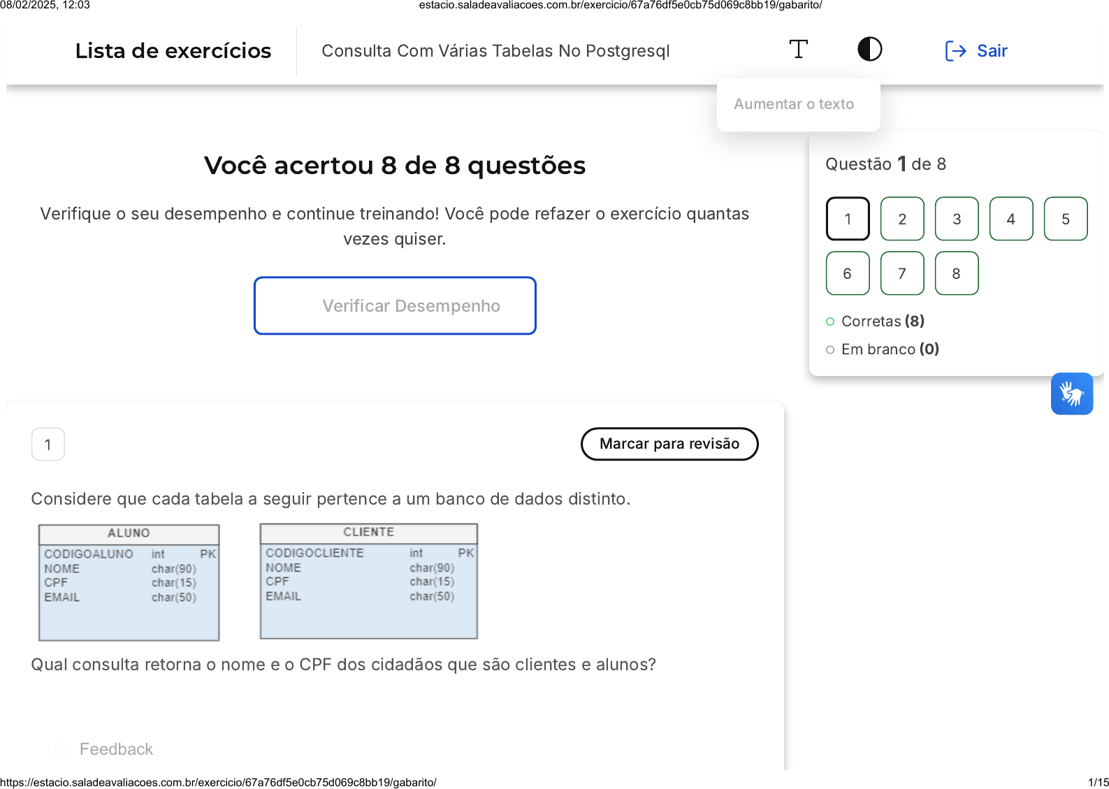 Você acertou 8 de 8 questões Verifique o seu desempenho e continue treinando! Você pode refazer o exercício quantas vezes quiser. Verificar Desempenho 1 Marcar para revisão Considere que cada tabela a seguir pertence a um banco de dados distinto. Qual consulta retorna o nome e o CPF dos cidadãos que são clientes e alunos? Questão 1 de 8 Corretas (8) Em branco (0) 1 2 3 4 5 6 7 8 Lista de exercícios Consulta Com Várias Tabelas No Postgresql Sair Aumentar o texto Feedback 08/02/2025, 12:03 estacio.saladeavaliacoes.com.br/exercicio/67a76df5e0cb75d069c8bb19/gabarito/ https://estacio.saladeavaliacoes.com.br/exercicio/67a76df5e0cb75d069c8bb19/gabarito/ 1/15 A B C D E SELECT NOME, CPF FROM ALUNO UNION SELECT NOME, CPF FROM CLIENTE; SELECT NOME, CPF FROM CLIENTE INTERSECT SELECT NOME, CPF FROM ALUNO; SELECT NOME, CPF FROM ALUNO EXCEPT SELECT NOME, CPF FROM CLIENTE; SELECT NOME, CPF FROM CLIENTE JOIN SELECT NOME, CPF FROM ALUNO; SELECT NOME, CPF FROM CLIENTE MINUS SELECT NOME, CPF FROM ALUNO; Resposta correta Parabéns, você selecionou a alternativa correta. Confira o gabarito comentado! Gabarito Comentado 08/02/2025, 12:03 estacio.saladeavaliacoes.com.br/exercicio/67a76df5e0cb75d069c8bb19/gabarito/ https://estacio.saladeavaliacoes.com.br/exercicio/67a76df5e0cb75d069c8bb19/gabarito/ 2/15 A B A resposta correta é: SELECT NOME, CPF FROM ALUNO UNION SELECT NOME, CPF FROM CLIENTE; 2 Marcar para revisão Sejam duas tabelas assim estruturadas: DEPARTAMENTO(CODIGOD, NOME) EMPREGADO(CODIGOE, NOME, ENDERECO, CODIGOD) CODIGOD REFERENCIA DEPARTAMENTO Seja a consulta a seguir: SELECT D.NOME, E.NOME FROM DEPARTAMENTO D LEFT JOIN EMPREGADO E ON (D.CODIGOD=E.CODIGOD) ORDER BY D.NOME; A consulta retorna: O nome do departamento e o nome do empregado alocado. Os departamentos sem funcionário aparecem no resultado. O nome do departamento e o nome do empregado alocado. Os departamentos sem funcionário alocado não aparecem no resultado. 08/02/2025, 12:03 estacio.saladeavaliacoes.com.br/exercicio/67a76df5e0cb75d069c8bb19/gabarito/ https://estacio.saladeavaliacoes.com.br/exercicio/67a76df5e0cb75d069c8bb19/gabarito/ 3/15 C D E O nome do departamento e o nome do empregado alocado. Os empregados sem departamento aparecem no resultado. O nome do departamento e o nome do empregado alocado. Os empregados sem departamento não aparecem no resultado. O nome do departamento e o nome do empregado alocado. Os empregados sem departamento e os departamentos sem empregado aparecem nos resultados. Resposta correta Parabéns, você selecionou a alternativa correta. Confira o gabarito comentado! Gabarito Comentado A consulta SQL apresentada realiza um LEFT JOIN entre as tabelas DEPARTAMENTO e EMPREGADO, baseando-se na coluna CODIGOD. O LEFT JOIN retorna todos os registros da tabela à esquerda (DEPARTAMENTO), mesmo que não haja correspondência na tabela à direita (EMPREGADO). Portanto, a consulta retorna o nome do departamento e o nome do empregado alocado, e os departamentos que não possuem funcionários também aparecem no resultado. Isso faz da alternativa A a resposta correta. 08/02/2025, 12:03 estacio.saladeavaliacoes.com.br/exercicio/67a76df5e0cb75d069c8bb19/gabarito/ https://estacio.saladeavaliacoes.com.br/exercicio/67a76df5e0cb75d069c8bb19/gabarito/ 4/15 A B C 3 Marcar para revisão Operadores de conjuntos em banco de dados são usados para combinar, comparar e realizar operações em conjuntos de resultados de consultas. Eles são úteis quando você deseja extrair informações de duas ou mais tabelas ou conjuntos de resultados separados e combiná-los de várias maneiras. Qual é a diferença entre o operador INTERSECT e o operador EXCEPT em SQL? O operador INTERSECT retorna todas as linhas, incluindo repetições, enquanto o operador EXCEPT exclui as repetições. O operador INTERSECT combina todas as linhas resultantes de consultas, enquanto o operador EXCEPT subtrai as linhas de uma consulta a partir das linhas de outra consulta. O operador INTERSECT retorna apenas as linhas que aparecem em ambas as consultas, enquanto o operador EXCEPT retorna apenas as linhas que não estão presentes em ambas as consultas. 08/02/2025, 12:03 estacio.saladeavaliacoes.com.br/exercicio/67a76df5e0cb75d069c8bb19/gabarito/ https://estacio.saladeavaliacoes.com.br/exercicio/67a76df5e0cb75d069c8bb19/gabarito/ 5/15 D E O operador INTERSECT é usado para operações de junção, enquanto o operador EXCEPT é usado para filtrar dados com base em uma condição O operador INTERSECT funciona apenas em bancos de dados Oracle, enquanto o operador EXCEPT funciona em todos os sistemas de gerenciamento de banco de dados. Resposta correta Parabéns, você selecionou a alternativa correta. Confira o gabarito comentado! Gabarito Comentado O operador INTERSECT encontra a sobreposição ou interseção de registros em dois conjuntos, retornando registros comuns. Enquanto isso, o operador EXCEPT (ou MINUS) encontra a diferença entre dois conjuntos, retornando registros que estão em um conjunto, mas não no outro. 4 Marcar para revisão As operações de subconsultas são uma ferramenta poderosa para manipular e recuperar dados de maneira flexível e específica. Elas desempenham um papel essencial na realização de consultas complexas em bancos de dados relacionais, permitindo a obtenção de informações detalhadas de várias fontes de dados. 08/02/2025, 12:03 estacio.saladeavaliacoes.com.br/exercicio/67a76df5e0cb75d069c8bb19/gabarito/ https://estacio.saladeavaliacoes.com.br/exercicio/67a76df5e0cb75d069c8bb19/gabarito/ 6/15 A B C D E Qual é o objetivo principal de uma consulta que utiliza subconsultas? Exibir todos os registros de uma única tabela. Realizar operações de junção entre tabelas. Apresentar o resultado de diversas consultas. Realizar uma pesquisa usando resultados de outras consultas. Atualizar os dados em mais de uma tabela ao mesmo tempo. Resposta correta Parabéns, você selecionou a alternativa correta. Confira o ga