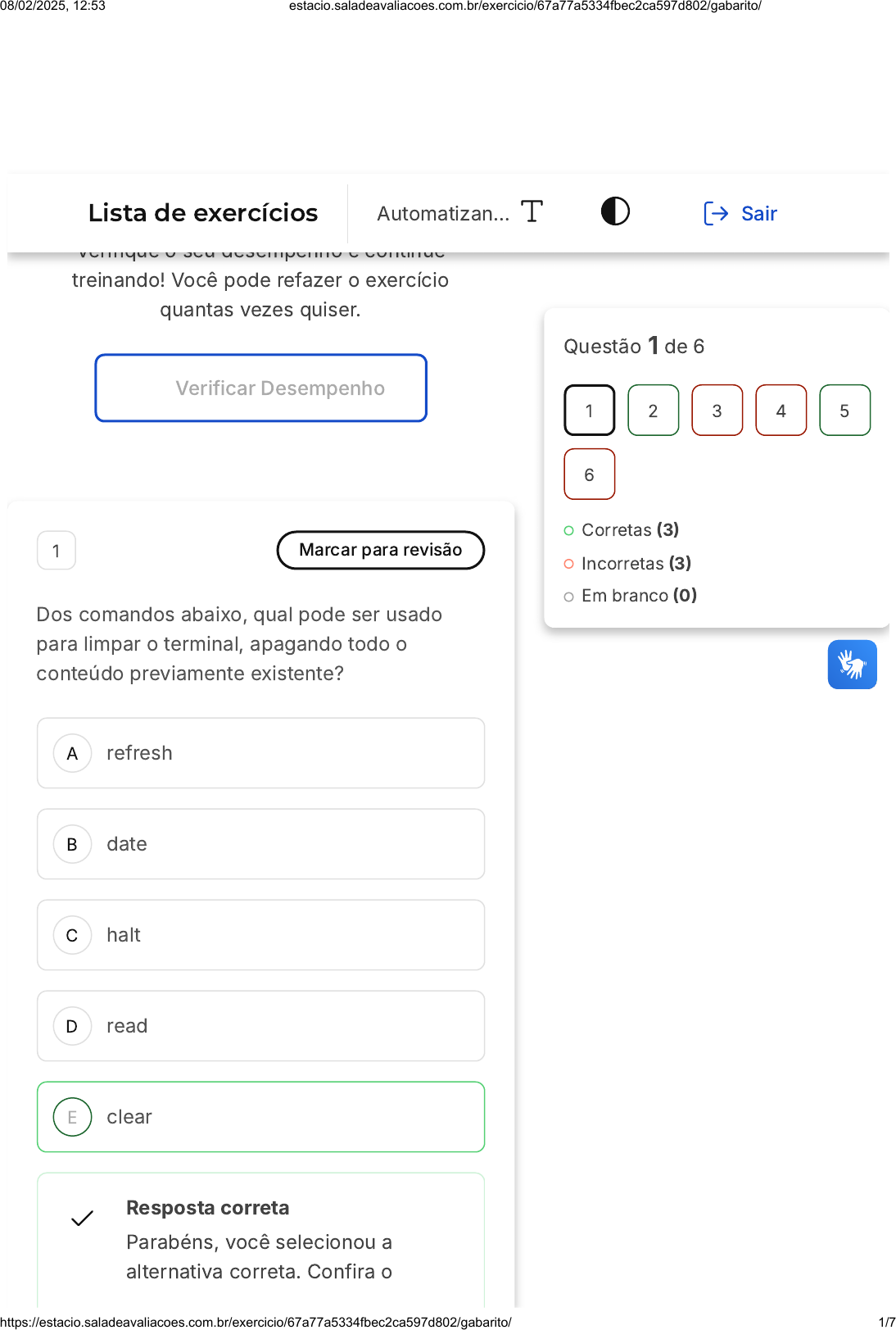 Você acertou 3 de 6 questões Verifique o seu desempenho e continue treinando! Você pode refazer o exercício quantas vezes quiser. Verificar Desempenho A B C D E 1 Marcar para revisão Dos comandos abaixo, qual pode ser usado para limpar o terminal, apagando todo o conteúdo previamente existente? refresh date halt read clear Resposta correta Parabéns, você selecionou a alternativa correta. Confira o Questão 1 de 6 Corretas (3) Incorretas (3) Em branco (0) 1 2 3 4 5 6 Lista de exercícios Automatizan… Sair 08/02/2025, 12:53 estacio.saladeavaliacoes.com.br/exercicio/67a77a5334fbec2ca597d802/gabarito/ https://estacio.saladeavaliacoes.com.br/exercicio/67a77a5334fbec2ca597d802/gabarito/ 1/7 A B C D E gabarito comentado! Gabarito Comentado O comando 'clear' é utilizado para limpar o terminal, apagando todo o conteúdo previamente existente. Os outros comandos listados não possuem essa função. 'Refresh' não é um comando padrão para limpar o terminal. 'Date' exibe a data e hora atual. 'Halt' é usado para parar o sistema e 'read' é usado para ler a entrada do usuário. Portanto, a alternativa correta é a 'clear'. 2 Marcar para revisão É um comando que permite interromper um LOOP imediatamente: loop undo while continue break Resposta correta Parabéns, você selecionou a alternativa correta. Confira o 08/02/2025, 12:53 estacio.saladeavaliacoes.com.br/exercicio/67a77a5334fbec2ca597d802/gabarito/ https://estacio.saladeavaliacoes.com.br/exercicio/67a77a5334fbec2ca597d802/gabarito/ 2/7 A B C D E gabarito comentado! Gabarito Comentado O comando break é utilizado para interromper um loop imediatamente. Ele é útil quando você deseja sair de um loop sem executar o código restante. 3 Marcar para revisão O operador "if" é usado para tomada de decisões baseadas em condições em scripts BASH. Qual é a sintaxe correta para um if que verifica se a variável NUM é igual a 10? if [ "$NUM" -eq 10 ] if "$NUM" == 10 if [$NUM -eq 10] if [NUM == 10] if [ "$NUM" = 10 ] Resposta incorreta Opa! A alternativa correta é a letra A. Confira o gabarito comentado! 08/02/2025, 12:53 estacio.saladeavaliacoes.com.br/exercicio/67a77a5334fbec2ca597d802/gabarito/ https://estacio.saladeavaliacoes.com.br/exercicio/67a77a5334fbec2ca597d802/gabarito/ 3/7 A B C D E Gabarito Comentado A resposta correta é if [ "$NUM" -eq 10 ], pois utiliza a sintaxe apropriada para a comparação numérica no BASH. 4 Marcar para revisão Você está desenvolvendo um SCRIPT em que pede ao usuário para digitar uma palavra, utilizando o comando ' read PALAVRA '. Porém, antes de prosseguir, você deseja colocar um teste para certificar-se de que o usuário efetivamente digitou alguma coisa. Qual dos comparadores abaixo podemos utilizar? if [[ -n "$PALAVRA" ]] if [[ -z "$PALAVRA" ]] if [[ ! "PALAVRA ]] if [[ $PALAVRA = "" ]] if [[ $(($PALAVRA)) ]] Resposta incorreta Opa! A alternativa correta é a letra A. Confira o gabarito comentado! Gabarito Comentado 08/02/2025, 12:53 estacio.saladeavaliacoes.com.br/exercicio/67a77a5334fbec2ca597d802/gabarito/ https://estacio.saladeavaliacoes.com.br/exercicio/67a77a5334fbec2ca597d802/gabarito/ 4/7 A B C D E A resposta correta é: if [[ -n "$PALAVRA" ]] O comando ' read PALAVRA ' lê uma linha do terminal e armazena o texto digitado pelo usuário na variável ' PALAVRA '. O comparador ' -n ' verifica se a variável ' PALAVRA ' contém algum texto. Se a variável ' PALAVRA ' estiver vazia, o comparador ' -n ' retornará o valor 0, o que fará com que o teste falhe. Se a variável ' PALAVRA ' não estiver vazia, o comparador ' -n ' retornará o valor 1, o que fará com que o teste passe. 5 Marcar para revisão Dos comandos abaixo, qual permite alterar a configuração de CRONTAB do usuário? crond vi crontab ln cron tab crontab -e service cron enable Resposta correta Parabéns, você selecionou a alternativa correta. Confira o gabarito comentado! 08/02/2025, 12:53 estacio.saladeavaliacoes.com.br/exercicio/67a77a5334fbec2ca597d802/gabarito/ https://estacio.saladeavaliacoes.com.br/exercicio/67a77a5334fbec2ca597d802/gabarito/ 5/7 A B C D E Gabarito Comentado O comando 'crontab -e' é utilizado para editar a tabela de tarefas cron do usuário atual. O cron é um agendador de tarefas utilizado em sistemas operacionais do tipo Unix, e a tabela de tarefas cron, ou crontab, é o arquivo que contém a lista de tarefas agendadas. Portanto, para alterar a configuração de CRONTAB do usuário, deve-se utilizar o comando 'crontab -e'. 6 Marcar para revisão Em uma empresa de tecnologia, o administrador de sistemas precisa automatizar a geração de relatórios diários de uso dos servidores. Para isso, ele decide usar o CRON, configurando um script que executa essa tarefa todos os dias às 3 da manhã. Qual comando o administrador deve inserir no CRON para realizar a tarefa descrita acima? 0 3 * * * /caminho/para/script.sh 3 * * * * /caminho/para/script.sh * 3 * * * /caminho/para/script.sh 0 * 3 * * /caminho/para/script.sh * * * 3 * /caminho/para/script.sh 08/02/2025, 12:53 estacio.saladeavaliacoes.com.br/exercicio/67a77a5334fbec2ca597d802/gabarito/ https://estacio.saladeavaliacoes.com.br/exercicio/67a77a5334fbec2ca597d802/gabarito/ 6/7 Resposta incorreta Opa! A alternativa correta é a letra A. Confira o gabarito comentado! Gabarito Comentado A alternativa correta é a que especifica que o script deve ser executado às 3 da manhã todos os dias. No formato do CRON, o primeiro número representa os minutos (0 para a hora exata), o segundo as horas (3 da manhã), e os asteriscos subsequentes significam "todos os dias do mês", "todos os meses" e "todos os dias da semana", respectivamente. As outras opções apresentam agendamentos incorretos para a tarefa descrita. 08/02/2025, 12:53 estacio.saladeavaliacoes.com.br/exercicio/67a77a5334fbec2ca597d802/gabarito/ https://estacio.saladeavaliacoes.com.br/exercicio/67a77a5334fbec2ca597d802/gabarito/ 7/7