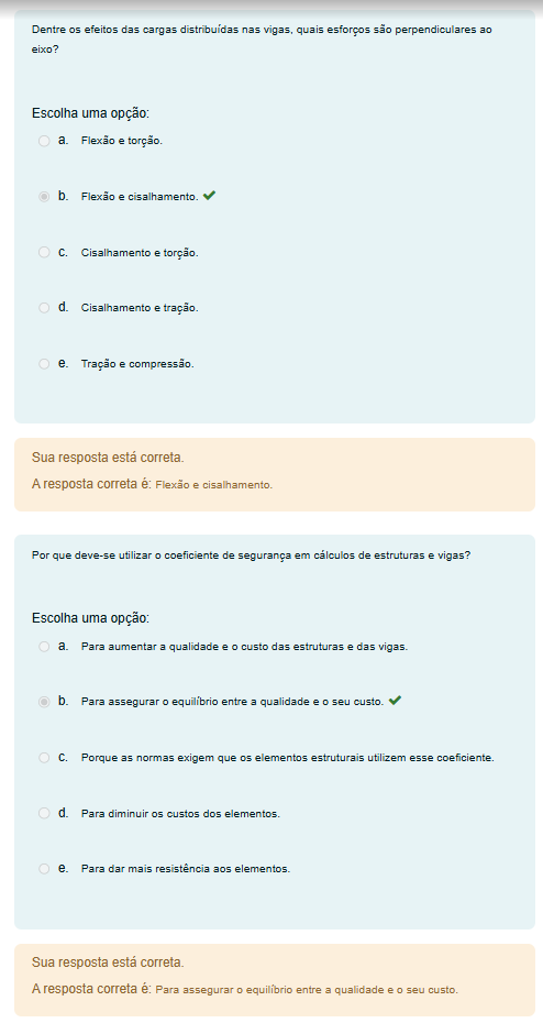 Dentre os efeitos das cargas distribuídas nas quais esforços são perpendiculares ao eixo? Escolha uma opção: a. Flexão e torção. b. Flexão e cisalhamento C. Cisalhamento e torção. d. Cisalhamento e tração. e. Tração e Sua resposta está A resposta correta é: Flexão e Por que deve-se utilizar coeficiente de segurança em cálculos de estruturas e vigas? Escolha uma opção: Para aumentar a qualidade e custo das estruturas e das vigas. b. Para assegurar entre a qualidade e seu custo. C. Porque as normas exigem que elementos estruturais utilizem esse coeficiente. d. Para diminuir os custos dos e. Para dar mais resistência aos Sua resposta está A resposta correta Para assegurar entre a qualidade e seu