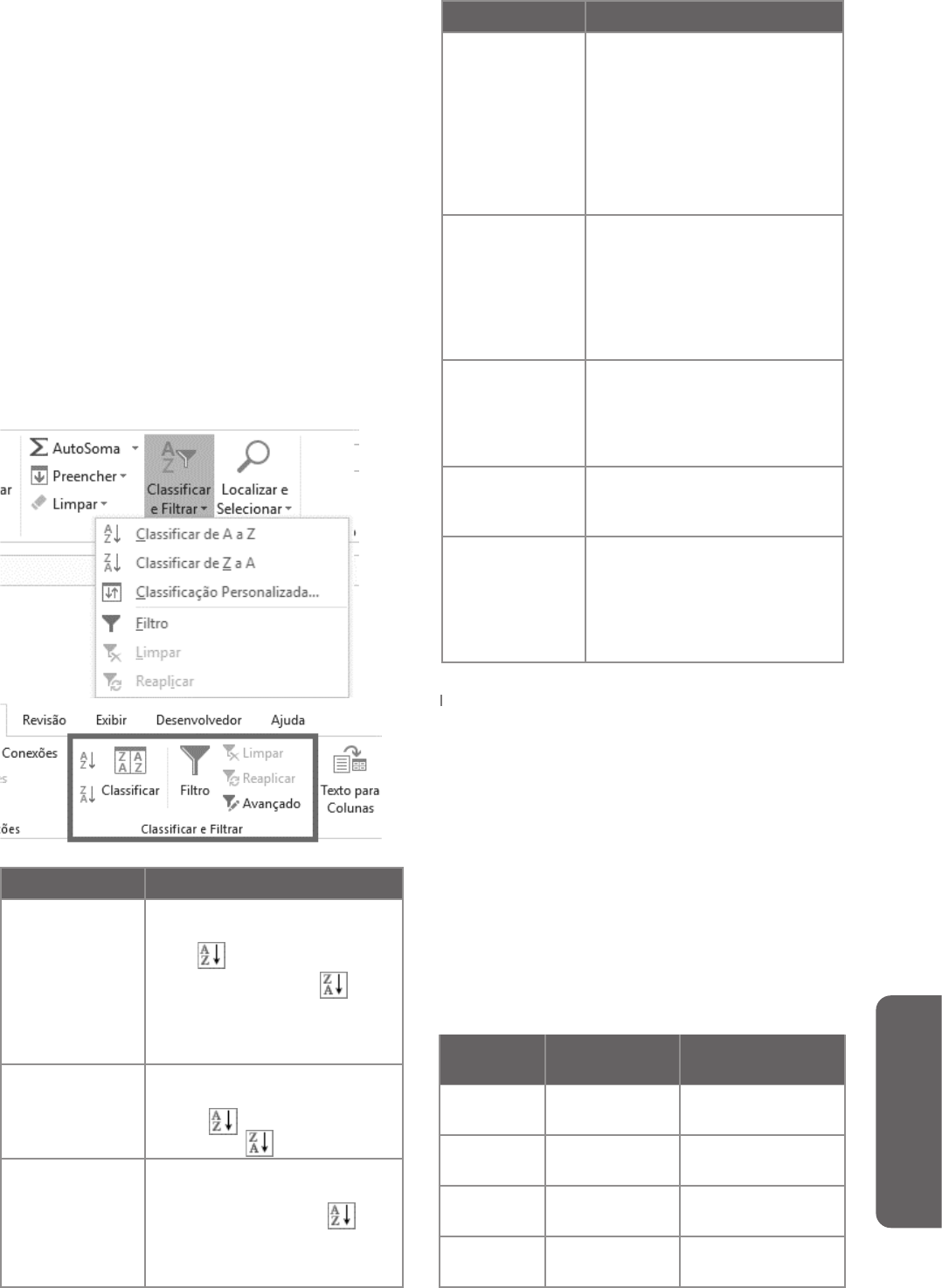 N O Ç Õ ES D E IN FO R M ÁT IC A 121 Classificação de dados A classificação de dados é uma parte importante da análise de dados. Você pode classificar dados por texto (A a Z ou Z a A), números (dos menores para os maiores ou dos maiores para os menores) e datas e horas (da mais antiga para a mais nova e da mais nova para a mais antiga) em uma ou mais colunas. Você também poderá classificar por uma lista de clientes (como Grande, Médio e Pequeno) ou por formato, incluindo a cor da célula, a cor da fonte ou o conjunto de ícones. A maioria das operações de classificação é identificada por coluna, mas você tam- bém poderá identificar por linhas. Disponível na guia Dados, e na guia Página Inicial, a classificação poderá ser de texto, números, datas ou horas, por cor da célula, cor da fonte ou ícones, por uma lista personalizada, linhas, por mais de uma colu- na ou linha, ou por uma coluna sem afetar as demais. CLASSIFICAÇÃO COMENTÁRIOS Classificar texto A classificação de dados alfanu- méricos poderá ser ‘Classificar de A a Z’ em ordem crescente, ou ‘Classificar de Z a A’ em ordem decrescente. É possível diferenciar letras maiúsculas e minúsculas. Classificar números Quando a coluna possui números, podemos ‘Classificar do menor para o maior’ ou ‘Classificar do maior para o menor’ Classificar datas ou horas Se houver datas ou horas, po- demos ‘Classificar da mais antiga para a mais nova’ ou ‘Classificar da mais nova para a mais antiga’, resumindo, cronologicamente. CLASSIFICAÇÃO COMENTÁRIOS Classificar por cor de célula, cor de fonte ou ícones Se você tiver formatado manual ou condicionalmente um interva- lo de células ou uma coluna de tabela, por cor de célula ou cor de fonte, poderá classificar por essas cores. Também será pos- sível classificar por um conjunto de ícones criados ao aplicar uma formatação condicional. Classificar por uma lista personalizada Você pode usar uma lista perso- nalizada para classificar em uma ordem definida pelo usuário. Por exemplo, uma coluna pode conter valores pelos quais você deseja classificar, como Alta, Média e Baixa. Classificar linhas Na caixa de diálogo Opções de Classificação, em Orientação, clique em Classificar da esquerda para a direita e, em seguida, cli- que em OK. Classificar por mais de uma coluna ou linha Na caixa de diálogo Classificar, adicione mais de um critério para ordenação. Classificar uma coluna em um intervalo de célu- las sem afetar as demais Basta selecionar a coluna deseja- da, e na janela de diálogo, manter o item “Continuar com a seleção atual”. MICROSOFT POWERPOINT As apresentações de slides criadas pelo Microsoft PowerPoint 2010/2013/2016/2019 são arquivos de extensão .PPTX. Caso contenham macros (comandos para automatização de tarefas) será atribuída a exten- são .PPTM. E ainda podemos trabalhar com os mode- los (extensão .POTX e POTM). Apesar de ser um aplicativo com finalidade dife- rente do editor de textos, ele possui muitas semelhan- ças que acabam ajudando quem está iniciando nele. Da mesma forma que o editor de textos, é possível tra- balhar com seções (divisões), é possível inserir núme- ros de slides, é possível comparar apresentações, etc. EXTENSÃO TIPO DE ARQUIVO CARACTERÍSTICAS PPT Apresentação editável. Versão 2003 ou anterior. PPS Apresentação executável. Versão 2003 ou anterior. POT Modelo de apresentação. Versão 2003 ou anterior. PPTX Apresentação editável. Versão 2007 ou superior. 122 EXTENSÃO TIPO DE ARQUIVO CARACTERÍSTICAS PPSX Apresentação executável. Versão 2007 ou superior, que não necessita de pro- gramas para ser visualizada. POTX Modelo de apresentação. Recursos para pa- dronização de novas apresentações. POTM Modelo de apre- sentação com macros. Recursos para pa- dronização e auto- matização de novas apresentações. ODP Open Document Presentation. Formato do LibreOf- fice Impress, que pode ser editado e salvo pelo Microsoft PowerPoint. PDF/XPS Portable Docu- ment Format. Formato de docu- mento portável, sem alguns recursos multimídia inseridos na apresentação de slide. Importante! Apresentações de slides é um tópico pouco questionado em provas de concursos. Conhe- cendo os conceitos do Microsoft PowerPoint, você poderá aproveitá-los quando estudar LibreOffice Impress. As apresentações de slides podem ser gravadas em formato de imagens (JPG, PNG), slide por slide, e até transformadas em vídeo (extensão MP4). Os recursos do PowerPoint, como animações, tran- sições, narração, serão inseridos no vídeo, que poderá ser reproduzido em outros dispositivos, como Smart TV em totens de propagandas. Figura 1. Para produzir um vídeo da apresentação, acessar o botão Arquivo, menu Exportar, item Criar Vídeo. Vamos conhecer alguns termos usados no aplicati- vo de edição de apresentações de slides. z Slide – unidade de edição, como uma página da apresentação. z Slide Mestre – slide com o modelo de formatação que será usado pelos slides da apresentação atual. z Design – aparência do slide ou de toda a apresen- tação. O design combina cores, estilos e padrões para que a aparência tenha um visual harmoniza- do. O PowerPoint oferece “Ideias de Design” a cada objeto inserido no slide. z Layout – disposição dos elementos dentro do slide. Quando a apresentação é iniciada, o slide de sli- de de título é apresentado. O usuário poderá alte- rar para outro layout. Cada slide da apresentação poderá ter um layout diferente. Somente Título Em Branco Conteúdo com Legenda Imagem com Legenda ComparaçãoDuas Partes de Conteúdo Cabeçalho da Seção Título e ConteúdoSlide de Título Figura 2. Layout de slide z Seção – divisão de formatação dentro da apresen- tação (usadas para Apresentações Personalizadas). Poderá ter ‘duas apresentações’ dentro de uma, e no início, escolher