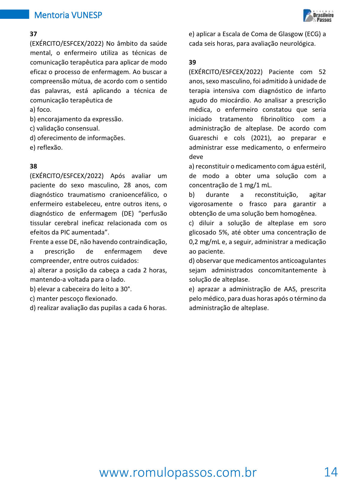 www.romulopassos.com.br 14 Mentoria VUNESP 37 (EXÉRCITO/ESFCEX/2022) No âmbito da saúde mental, o enfermeiro utiliza as técnicas de comunicação terapêutica para aplicar de modo eficaz o processo de enfermagem. Ao buscar a compreensão mútua, de acordo com o sentido das palavras, está aplicando a técnica de comunicação terapêutica de a) foco. b) encorajamento da expressão. c) validação consensual. d) oferecimento de informações. e) reflexão. 38 (EXÉRCITO/ESFCEX/2022) Após avaliar um paciente do sexo masculino, 28 anos, com diagnóstico traumatismo cranioencefálico, o enfermeiro estabeleceu, entre outros itens, o diagnóstic de enfermagem (DE) “perfusã tissular cerebral ineficaz relacionada com os efeits da PIC aumentada”. Frente a esse DE, não havendo contraindicação, a prescrição de enfermagem deve compreender, entre outros cuidados: a) alterar a posição da cabeça a cada 2 horas, mantendo-a voltada para o lado. b) elevar a cabeceira do leito a 30°. c) manter pescoço flexionado. d) realizar avaliação das pupilas a cada 6 horas. e) aplicar a Escala de Coma de Glasgow (ECG) a cada seis horas, para avaliação neurológica. 39 (EXÉRCITO/ESFCEX/2022) Paciente com 52 anos, sexomasculino, foi admitido à unidade de terapia intensiva com diagnóstico de infarto agudo do miocárdio. Ao analisar a prescrição médica, o enfermeiro constatou que seria iniciado tratamento fibrinolítico com a administração de alteplase. De acordo com Guareschi e cols (2021), ao preparar e administrar esse medicamento, o enfermeiro deve a) reconstituir omedicamento com água estéril, de modo a obter uma solução com a concentração de 1 mg/1 mL. b) durante a reconstituição, agitar vigorosamente o frasco para garantir a obtenção de uma solução bem homogênea. c) diluir a solução de alteplase em soro glicosado 5%, até obter uma concentração de 0,2 mg/mL e, a seguir, administrar a medicação ao paciente. d) observar quemedicamentos anticoagulantes sejam administrados concomitantemente à solução de alteplase. e) aprazar a administração de AAS, prescrita pelomédico, para duas horas após o término da administração de alteplase. www.romulopassos.com.br 15 Mentoria VUNESP 2. Enfermeiro/Exército/VUNESP/2021 1 (Exército/Vunesp/2021) Observe a figura a seguir, em que estão representados focos de ausculta cardíaca. A primeira bulha cardíaca – B1 é mais audível com o diafragma do estetoscópio colocado sobre os pontos: a) B e D. c) B e C. e) A e B. b) A e C. d) C e D. 2 (Exército/Vunesp/2021) Ao receber o plantão, o enfermeiro foi informado de que A.C., sexo masculino, 73 anos, 1º dia pós-operatório de gastrectomia, estava recebendo infusão de papa de hemácias há 20 minutos, por via periférica exclusiva, sem apresentar alterações. Ao verificar os sinais vitais do paciente cerca de 30 minutos após iniciada a transfusão, o enfermeiro constatou: temperatura axilar = 38,4 °C, frequência cardíaca = 102 batimentos por minuto, frequência respiratória = 22 respirações por minuto, pressão arterial = 92 X 60 mmHg. Frente a esta situação, considerando que o paciente se queixou de dor lombar e calafrios, e que há alteração nos sinais vitais quando comparados aos valores anteriormente obtidos, o enfermeiro deve, prioritariamente, a) administrar medicação antitérmica prescrita para uso se necessário e coletar amostra de urina para exame. b) suspender a transfusão e manter o acesso venoso com soro fisiológico 0,9%. c) suspender a transfusão e manter o acesso venoso com soro glicosado 5%. d) comunicar ao médico e ao banco de sangue as alterações observadas nos sinais vitais. e) repetir a avaliação dos sinais vitais em 15 minutos para confirmação das alterações obtidas anteriormente. 3 (Exército/Vunesp/2021) Frente a um paciente recebendo nutrição enteral com fórmula de alta osmolaridade, o enfermeiro deve estar atento à ocorrência da síndrome do esvaziamento rápido (dumping). Os sinais e sintomas (SS) que caracterizam esta síndrome e, entre outras ações, a medida de prevenção (P) a ser adotada são: a) SS = sensação de plenitude, náuseas, cólica, tontura, diaforese e diarreia osmótica; P = iniciar a administração da fórmula de alta osmolaridade em baixa velocidade/hora, com aumento lento da taxa de infusão. b) SS = náuseas, vômitos, distensão abdominal, eructação, constipação, sensação de plenitude gástrica; P = iniciar a administração da fórmula de alta osmolaridade lentamente, com aumento lento da taxa de infusão. c) SS = diarreia osmótica, sensação de plenitude, náuseas, cólica, tontura, náuseas, sudorese; P = administrar a fórmula em bolus. d) SS = náuseas, vômitos, distensão abdominal, eructação, constipação, sensação de plenitude; P = administrar a fórmula em temperatura ambiente. e) SS = desidratação, sudorese, diarreia osmótica, hipertermia, oligúria, confusão mental, hiperglicemia; P = administrar a fórmula em bolus, por gravidade. 4 (Exército/Vunesp/2021) A.S., 58 anos, sexo feminino, submetida a mastectomia D, com esvaziamento axilar, portando dreno de sucção portátil posicionado na mama, recebeu alta hospitalar. Ao ser orientada pelo enfermeiro a respeito dos cuidados a serem observados no www.romulopassos.com.br 16 Mentoria VUNESP domicílio, mostrou-se muito preocupada com os cuidados com o dreno e o tempo que deveria permanecer com ele. Frente a essa situação, considerando o recomendado em Brunner & Suddarth: tratado de enfermagem médico- cirúrgica (2016), o enfermeiro deve, entre outras orientações, esclarecer que, habitualmente, o dreno é removido: a) quando o líquido de drenagem passar a apresentar aspecto seroso. b) dez dias após a cirurgia, independentemente do volume de exsudato observado. c) quando o débito é inferior a 30 ml, em um período de 24 horas. d) catorze dias após a cirurgia, independentemente do volume de exsudato observa