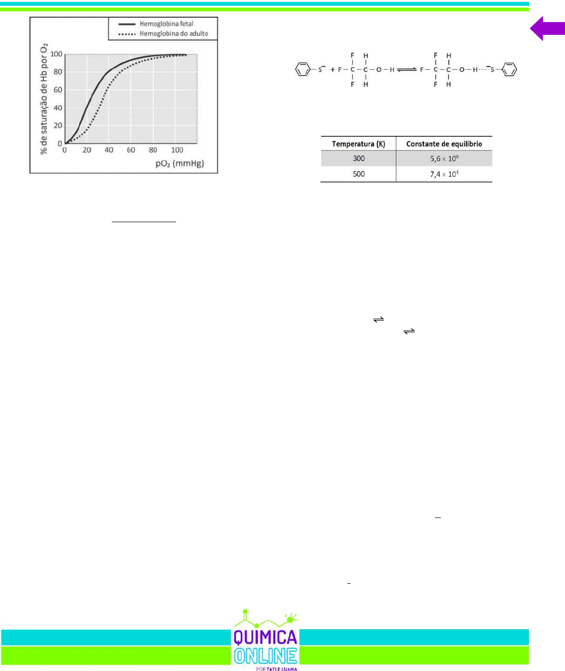 3000 QUESTÕES DE QUÍMICA 440 A porcentagem de saturação pode ser entendida como: Com base nessas informações, um estudante fez as seguintes afirmações: I. Para uma pressão parcial de O2 de 30 mmHg, a hemoglobina fetal transporta mais oxigênio do que a hemoglobina do adulto. II. Considerando o equilíbrio de transporte de oxigênio, no caso de um adulto viajar do litoral para um local de grande altitude, a concentração de Hb em seu sangue deverá aumentar, após certo tempo, para que a concentração de Hb(O2)n seja mantida. III. Nos adultos, a concentração de hemoglobina associada a oxigênio é menor no pulmão do que nos tecidos. É correto apenas o que o estudante afirmou em a) I. b) II. c) I e II. d) I e III. e) II e III. Note e adote: pO2 (pulmão) > pO2 (tecidos). 42 - (FUVEST SP) Uma das formas de se medir temperaturas em fase gasosa é por meio de reações com constantes de equilíbrio muito bem conhecidas, chamadas de reações-termômetro. Uma dessas reações, que ocorre entre o ânion tiofenolato e o 2,2,2- trifluoroetanol, está representada pela equação química Para essa reação, foram determinados os valores da constante de equilíbrio em duas temperaturas distintas. a) Essa reação é exotérmica ou endotérmica? Explique, utilizando os dados de constante de equilíbrio apresentados. b) Explique por que, no produto dessa reação, há uma forte interação entre o átomo de hidrogênio do álcool e o átomo de enxofre do ânion. 43 - (UFJF MG) Considere os seguintes equilíbrios que envolvem CO2(g) e suas constantes de equilíbrio correspondentes: CO2(g) CO(g) + ½ O2(g) K1 2 CO(g) + O2(g) 2 CO2(g) K2 Marque a alternativa que correlaciona as duas constantes de equilíbrio das duas reações anteriores. a) K2 = 1/(K1)2 b) K2 = (K1)2 c) K2 = K1 d) K2 = 1/K1 e) K2 = (K1)1/2 44 - (UEA AM) Considere o equilíbrio químico que ocorre em um frasco fechado contendo água oxigenada à temperatura constante: H2O2 (aq) H2O (l) + O2 (g) A constante Kc desse equilíbrio é calculada pela expressão: a) [H2O (l)] / [H2O2 (aq)] b) [O2 (g)] / [H2O2 (aq)] 100 ]Hb[])O(Hb[ ])O(Hb[ saturação de % n2 n2 + = → 2 1 2 1 3000 QUESTÕES DE QUÍMICA 441 c) [O2 (g) x [H2O2 (aq)] d) [O2 (g)] – [H2O2 (aq)] e) [H2O (l)] + (H2O2 (aq)] 45 - (Fac. Direito de São Bernardo do Campo SP) A síntese da amônia (NH3) a partir dos gases nitrogênio (N2) e hidrogênio (H2) é uma reação de grande importância para a indústria de fertilizantes e explosivos. O processo adotado ainda hoje foi desenvolvido pelos alemães Haber e Bosch no início do século XX, diminuindo a dependência da Alemanha do salitre (KNO3) importado principalmente do Chile. A reação pode ser representada pelo equilíbrio N2(g) + 3 H2(g) 2 NH3(g) O rendimento de formação de amônia em função da temperatura e da pressão está representado no gráfico a seguir. Industrialmente, a amônia é obtida sob pressão de 100 a 250 atm e temperatura entre 400 e 500 ºC. Sobre a síntese da amônia foram feitas as seguintes afirmações: I. Trata-se de um processo exotérmico. II. Em uma mesma temperatura, o aumento da pressão aumenta a constante de equilíbrio de formação da amônia. III. Nas condições adotadas pela indústria, a porcentagem de amônia presente na mistura em equilíbrio é de aproximadamente 60 %. IV. Em temperaturas baixas, a reação é muito lenta devido à alta energia de ativação do processo, tornando a condição desvantajosa financeiramente. Estão corretas apenas as afirmações: a) I e III. b) II e III. c) I e IV. d) II e IV. 46 - (PUC SP) Durante uma transformação química as concentrações das substâncias participantes foram determinadas ao longo do tempo. O gráfico a seguir resume os dados obtidos ao longo do experimento. A respeito do experimento, foram feitas algumas afirmações: I. A e B são reagentes e C é o produto da reação estudada. II. A reação química estudada é corretamente representada pela equação: B + 2 C A III. Não houve consumo completo dos reagentes, sendo atingido o equilíbrio químico. IV. A constante de equilíbrio dessa reação, no sentido da formação de A, nas condições do experimento é menor do que 1. Estão corretas apenas as afirmações: a) I e IV. b) II e III. c) II e IV. d) III e IV. 47 - (Fac. Israelita de C. da Saúde Albert Einstein SP) 2 1 2 1 → 3000 QUESTÕES DE QUÍMICA 442 O trióxido de enxofre (SO3) é obtido a partir da reação do dióxido de enxofre (SO2) com o gás oxigênio (O2), representada pelo equilíbrio a seguir. 2 SO2(g) + O2(g) 2 SO3(g) A constante de equilíbrio, KC, para esse processo a 1000ºC é igual a 280. A respeito dessa reação, foram feitas as seguintes afirmações: I. A constante de equilíbrio da síntese do SO3 a 200ºC deve ser menor que 280. II. Se na condição de equilíbrio a 1000ºC a concentração de O2 é de 0,1 mol.L–1 e a concentração de SO2 é de 0,01 mol.L– 1, então a concentração de SO3 é de 2,8 mol.L–1. III. Se, atingida a condição de equilíbrio, o volume do recipiente for reduzido sem alteração na temperatura, não haverá alteração no valor da constante de equilíbrio, mas haverá aumento no rendimento de formação do SO3. IV. Essa é uma reação de oxirredução, em que o dióxido de enxofre é o agente redutor. Estão corretas apenas as afirmações: a) II e IV. b) I e III. c) I e IV. d) III e IV. 48 - (FCM MG) Os seguintes desenhos representam o estado de equilíbrio para 4 sistemas químicos diferentes do tipo A + B ⎯⎯→⎯⎯ AB numa mesma temperatura. Indique o sistema que apresenta um maior valor para a constante de equilíbrio na temperatura relacionada. a) b) c) d) 49 - (FCM MG) Em um balão de 2,0 litros foram colocados 8,0 mols de A; 12,0 mols de B e 4,0 mols de C. Em uma dada temperatura, o equilíbrio homogêneo gasoso foi atingido quando a concentração de D ficou em 6,0 mol/L. A equação do sistema químico em equilíbrio pode ser ass