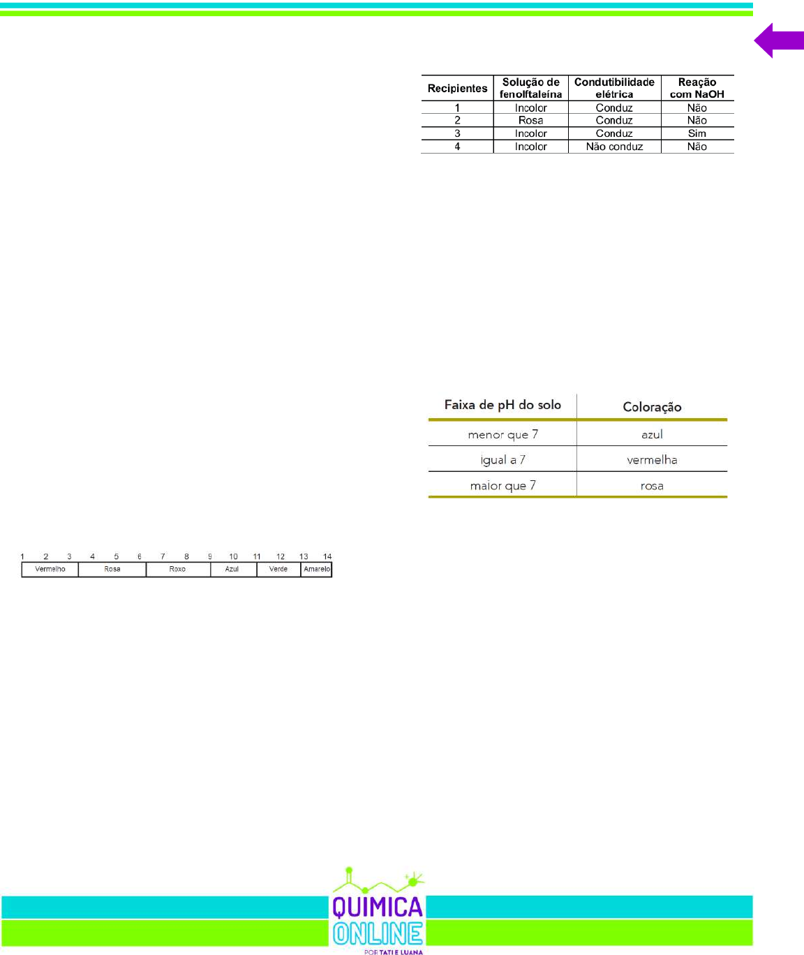3000 QUESTÕES DE QUÍMICA 482 b) Soluções aquosas das duas substâncias cujas fórmulas foram citadas no enunciado apresentam [OH–] menor que [H+]; c) A equação química Mg(OH)2(s) + 2HCl(aq) MgCl2(aq) + 2H2O(l) ilustra como a hipercloridria pode ser neutralizada pelo leite de magnésia; d) A solução aquosa de nenhuma das duas substâncias cujas fórmulas foram citadas no enunciado exibe alteração de cor para rosa após adição de duas gotas de solução alcoólica de fenolftaleína e posterior homogeneização. 63 - (ITA SP) Sobre indicadores de pH, é ERRADO afirmar que a) são ácidos ou bases fracas. b) em solução aquosa são usados como tampão. c) geralmente possuem anéis aromáticos em sua estrutura molecular. d) devem apresentar mínima interferência no sistema químico de interesse. e) respondem à presença de íons hidrogênio em solução aquosa por deslocamento de equilíbrio entre as formas associada e ionizada. 64 - (ENEM) O suco de repolho-roxo pode ser utilizado como indicador ácido-base em diferentes soluções. Para isso, basta misturar um pouco desse suco à solução desejada e comparar a coloração final com a escala indicadora de pH, com valores de 1 a 14, mostrada a seguir. Utilizando-se o indicador ácido-base e a escala para determinar o pH da soliva humana e do suco gástrico, têm-se, respectivamente, as cores a) vermelha e vermelha. b) vermelha e azul. c) rosa e roxa. d) roxa e amarela. e) roxa e vermelha. 65 - (Unievangélica GO) Em um laboratório de química, determinado professor entrega a um aluno quatro recipientes que contêm soluções aquosas incolores de açúcar, K2SO4, H2SO4 e KOH, não necessariamente nessa ordem. O aluno, para identificar as referidas soluções, se dispôs a realizar experimentos simples, e obteve os seguintes resultados: De acordo com os experimentos do aluno, verifica-se que as soluções contidas nos recipientes 1, 2, 3 e 4 são, respectivamente: a) H2SO4, açúcar, K2SO4 KOH b) KOH, K2SO4, H2SO4, açúcar c) açúcar, H2SO4, KOH, K2SO4 d) K2SO4, KOH, H2SO4, açúcar 66 - (UERJ) Hortênsias são flores cujas cores variam de acordo com o pH do solo, conforme indica a tabela: Considere os seguintes aditivos utilizados na plantação de hortênsias em um solo neutro: NaHCO3 CaO Al2(SO4)3 KNO3 Indique a cor das flores produzidas quando se adiciona KNO3 a esse solo e a fórmula química do aditivo que deve ser acrescentado, em quantidade adequada, para produzir hortênsias azuis. Em seguida, dentre os aditivos, nomeie o óxido e apresente a equação química completa e balanceada da sua reação com a água. 67 - (UFJF MG) Um estudante foi ao laboratório e realizou uma série de experimentos para identificar um determinado composto químico. As observações sobre esse composto estão descritas abaixo: Observação 1 Possuía propriedades corrosivas. → 3000 QUESTÕES DE QUÍMICA 483 Observação 2 Possuía alta solubilidade em água. Observação 3 O papel de tornassol ficou vermelho em contato com ele. Observação 4 Apresentou condução de corrente elétrica quando dissolvido em água. Baseado nas observações feitas pelo estudante, pode-se afirmar que o composto analisado é: a) HCl b) NaOH c) NaCl d) I2 e) CH4 68 - (UNESP SP) Considere a tabela, que apresenta indicadores ácido-base e seus respectivos intervalos de pH de viragem de cor. Para distinguir uma solução aquosa 0,0001 mol/L de HNO3 (ácido forte) de outra solução aquosa do mesmo ácido 0,1 mol/L, usando somente um desses indicadores, deve-se escolher o indicador a) 1. b) 4. c) 2. d) 3. e) 5. 69 - (PUC SP) Dados: Constante de ionização (Ka) do H2CO3 = 4 10–7 Constante de ionização (Kb) do NH3 = 2 10–5 Constante de ionização (Kw) do H2O = 1 10–14 Os indicadores ácido base são substâncias cuja cor se altera em uma faixa específica de pH. A tabela a seguir apresenta a faixa de viragem (mudança de cor) de alguns indicadores ácido base. A partir da análise dessa tabela, um técnico executou um procedimento para distinguir algumas soluções. Para diferenciar uma solução de HCl de concentração 1,0 mol.L–1 de uma solução de HCl de concentração 0,01 mol.L–1 ele utilizou o indicador X. Para diferenciar uma solução de bicarbonato de sódio (NaHCO3) de concentração 0,01 mol.L–1 de uma solução de cloreto de amônio (NH4Cl) de concentração 0,01 mol.L–1 ele utilizou o indicador Y. Para diferenciar uma solução de amoníaco (NH3) de concentração 1,0 10–3 mol.L–1 de uma solução de hidróxido de sódio (NaOH) de concentração 0,1 mol.L–1 ele utilizou o indicador Z. A alternativa que apresenta os indicadores X, Y e Z adequados para cada um dos procedimentos propostos pelo técnico é 70 - (UFPR) Folhas de repolho-roxo exibem cor intensa devido à presença de pigmentos. Processando-se algumas folhas num liquidificador com um pouco de água, extrai-se um líquido de cor roxa, que, posteriormente, passa por uma peneira. Foram realizados os seguintes experimentos, seguidos das observações: • Sobre volume de meio copo (~100 mL) do extrato líquido, adicionaram-se 20 mL de solução salina de cloreto de sódio (1 mol L–1). A cor roxa do extrato foi mantida. • Sobre volume de meio copo do extrato líquido, adicionou-se suco de um limão. A cor do extrato líquido se tornou vermelha. Foi observado aspecto opaco (turvo) no extrato líquido logo em seguida à sua separação das folhas de repolho, e esse aspecto se manteve durante todos os experimentos. 3000 QUESTÕES DE QUÍMICA 484 Sobre esse experimento, considere as seguintes afirmativas: 1. A mudança de cor de roxa para vermelha no segundo experimento é evidência de que ocorreu uma transformação química no extrato. 2. O extrato líquido é uma mistura homogênea. 3. Nos 20 mL de solução salina existem 1,2 1022 íons Na+ e 1,2 1022 íons Cl–. Assinale a alternativa correta. a) Somente a afirmativa 1 é verdadeira. b) Somente a afirmativa 2 
