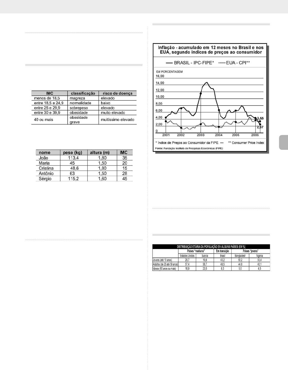 Matemática e suas Tecnologias205 B (e) 2002-2003. O gráfico mostra uma queda abrupta no consumo em todos os setores entre 2000 e 2001, contrária à tendência de crescimento no consumo em todos os setores, o que permite concluir que o “apagão” aconteceu neste período. Veja que nos períodos seguintes a tendência de crescimento no consumo continua em todos os setores.Gabarito “C” 224. (eneM 2008) O índice de massa corpórea (IMC) é uma medida que permite aos médicos fazer uma avaliação preli- minar das condições físicas e do risco de uma pessoa desen- volver certas doenças, conforme mostra a tabela abaixo. Internet: . Considere as seguintes informações a respeito de João, Maria, Cristina, Antônio e Sérgio. Os dados das tabelas indicam que (a) Cristina está dentro dos padrões de normalidade. (B) Maria está magra, mas não corre risco de desenvolver doenças. (C) João está obeso e o risco de desenvolver doenças é muito elevado. (d) Antônio está com sobrepeso e o risco de desenvolver doen- ças é muito elevado. (e) Sérgio está com sobrepeso, mas não corre risco de desen- volver doenças. Pelo IMC de cada um temos: João com obesidade e risco muito elevado, Maria com normalidade e risco baixo, Cristina com magreza e risco alto, Antônio com sobrepeso e risco elevado e Sérgio com obesidade grave e risco muitíssimo elevado. Gabarito “C” 225. (eneM 2006) O gráfico abaixo foi extraído de matéria publicada no caderno economia & negócios do jornal o estado de s. Paulo, em 11/6/2006. É um titulo adequado para a matéria jornalística em que esse gráfico foi apresentado: (a) Brasil: inflação acumulada em 12 meses menor que a dos EUA (B) Inflação do terceiro mundo supera pela sétima vez a do pri- meiro mundo (C) Inflação brasileira estável no período de 2001 a 2006 (d) Queda no índice de preços ao consumidor no período 2001-2005 (e) EUA: ataques terroristas causam hiperinflação Como após 2006, segundo o gráfico publicado em 11/6/2006, a inflação acumulada em 12 meses no Brasil foi menor do que a acumulada em 12 me- ses nos EUA, temos que o título adequado seria “Brasil: inflação acumulada em 12 meses menor que a dos EUA”. Gabarito “A” 226. (eneM 2005) Os brasileiros tiveram, em junho, o maior tempo de navegação residencial na internet entre 11 países monitorados pelo Ibope/NetRatings: média mensal de 16 horas e 54 minutos por pessoa. O país ficou à frente de nações como a França, Japão, Estados Unidos e Espanha. (Adaptado. Folha de s.Paulo, 23/07/2005.) Com base na tabela e no texto acima, analise os possíveis motivos para a liderança do Brasil no tempo de uso da internet. I. O país tem uma estrutura populacional com maior percen- tual de jovens do que os países da Europa e os EUA. II. O uso de internet em casa se distribui igualmente entre as clas- ses A, B e C, o que demonstra iniciativas de inclusão digital. III. A adesão ao sistema de internet por banda larga ocorre, porque essa tecnologia promove a mudança de comporta- mento dos usuários. Como se dar muito bem no EnEm – quEstõEs COmEntADAs 206 B Está correto apenas o que se afirma em (a) I. (B) II. (C) III. (d) I e II. (e) II e III. Nota-se pela tabela que o Brasil tem uma estrutura populacional com maior percentual de jovens do que os EUA e os países Europeus, o que pode ser o possível motivo de acordo com o texto e a tabela apresentadas. Veja que nenhuma das informações apresentadas traz dados sobre a distribuição en- tre as classes ou adesão ao sistema de internet banda larga.Gabarito “A” 227. (eneM 2008) O gráfico abaixo mostra a área desmatada da Amazônia, em km2, a cada ano, no período de 1988 a 2008. Fonte: MMA. As informações do gráfico indicam que (a) o maior desmatamento ocorreu em 2004. (B) a área desmatada foi menor em 1997 que em 2007. (C) a área desmatada a cada ano manteve-se constante entre 1998 e 2001. (d) a área desmatada por ano foi maior entre 1994 e 1995 que entre 1997 e 1998. (e) o total de área desmatada em 1992, 1993 e 1994 é maior que 60.000 km2. Pelo gráfico, podemos concluir que a única alternativa correta é a que apon- ta que a área desmatada por ano entre 1994 e 1995 foi maior do que entre 1997 e 1998. Gabarito “D” Texto para as duas questões seguintes. No gráfico a seguir, estão especificados a produção bra- sileira de café, em toneladas; a área plantada, em hecta- res (ha); e o rendimento médio do plantio, em kg/ha, no período de 2001 a 2008. Fonte: IBGE 228. (eneM 2008) A análise dos dados mostrados no gráfico revela que (a) a produção em 2003 foi superior a 2.100.000 toneladas de grãos. (B) a produção brasileira foi crescente ao longo de todo o período observado. (C) a área plantada decresceu a cada ano no período de 2001 a 2008. (d) os aumentos na produção correspondem a aumentos no rendimento médio do plantio. (e) a área plantada em 2007 foi maior que a de 2001. Em todos os anos nos quais há um aumento na produção, representado por barras maiores, há também um aumento no rendimento médio (ponto re- presentado por um triângulo que fica acima dos outros anos em que houve diminuição da produção), bem como vice-versa. Gabarito “D” 229. (eneM 2008) Se a tendência de rendimento observada no gráfico, no período de 2001 a 2008, for mantida nos pró- ximos anos, então o rendimento médio do plantio do café, em 2012, será aproximadamente de (a) 500 kg/ha. (B) 750 kg/ha. (C) 850 kg/ha. (d) 950 kg/ha. (e) 1.250 kg/ha. O rendimento médio oscilou de forma mais ou menos de forma simétrica, e nos anos pares ele tem ficado em torno de 1.250 kg/ha, portanto, se a tendência observada no gráfico for mantida, em 2012 o mesmo será de 1.250 kg/ha. Gabarito “E” Matemática e suas Tecnologias207 B 230. (eneM 2007) Os gráficos abaixo, extraídos do sítio ele- trônico do IBGE, apresentam a distribuição da população brasileira por sexo e faixa etá