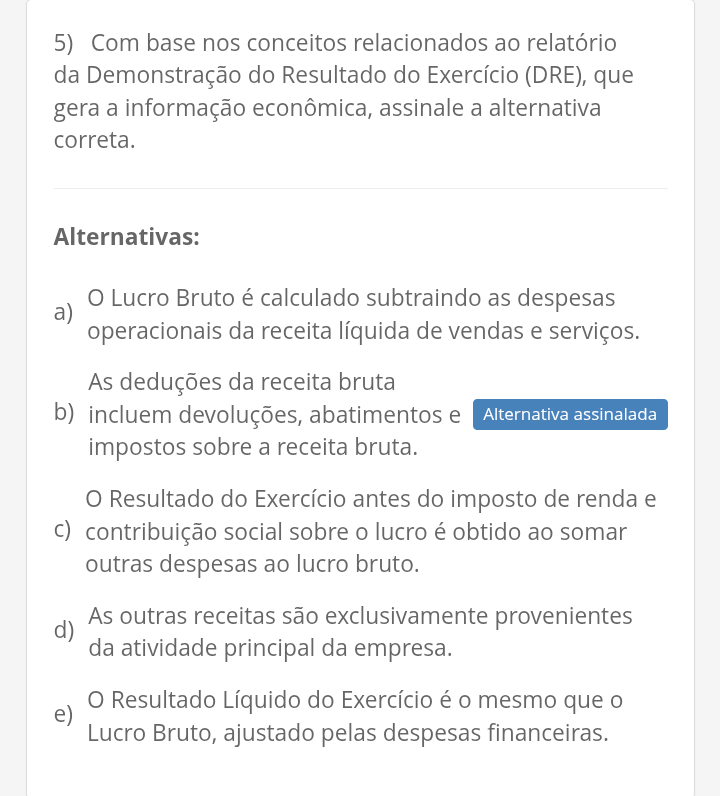 5) Com base nos conceitos relacionados ao relatório da Demonstração do Resultado do Exercício (DRE), que gera a informação econômica, assinale a alternativa correta. Alternativas: a) Lucro Bruto é calculado subtraindo as despesas operacionais da receita líquida de vendas e serviços. As deduções da receita bruta b) incluem devoluções, abatimentos e Alternativa assinalada impostos sobre a receita bruta. Resultado do Exercício antes do imposto de renda e c) contribuição social sobre o lucro é obtido ao somar outras despesas ao lucro bruto. d) As outras receitas são exclusivamente provenientes da atividade principal da empresa. e) Resultado Líquido do Exercício é o mesmo que o Lucro Bruto, ajustado pelas despesas financeiras.