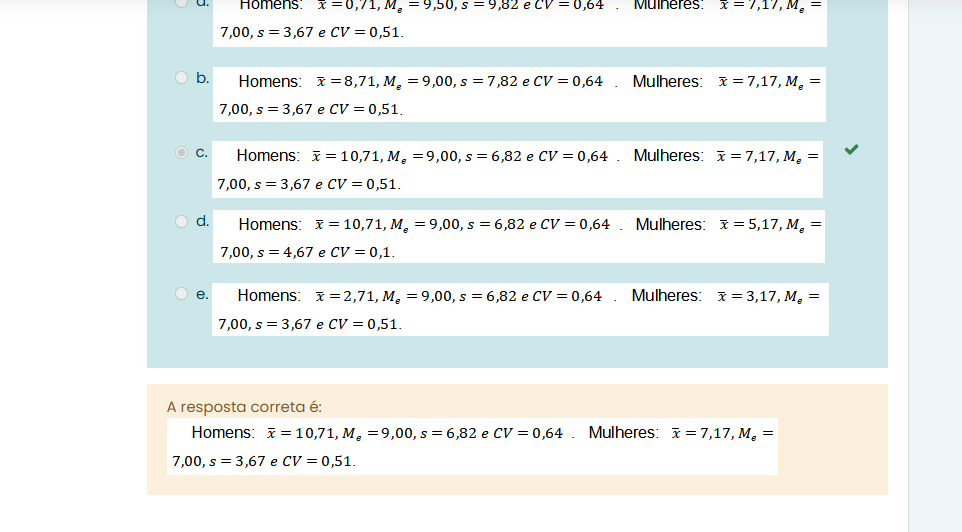 Homens =9,50,s = eCV=0,64 = b. Homens: =8,71, =9,00, = 7,82 e CV = 0,64 Mulheres: = e C. Homens: = e CV = d. Homens: = 10,71, e CV=0,64 = e e. Homens: = e CV = 0,51. A resposta correta é: Homens: = 10,71, M, = 9,00, S = 6,82 e CV=0,64 = CV = 0,51.