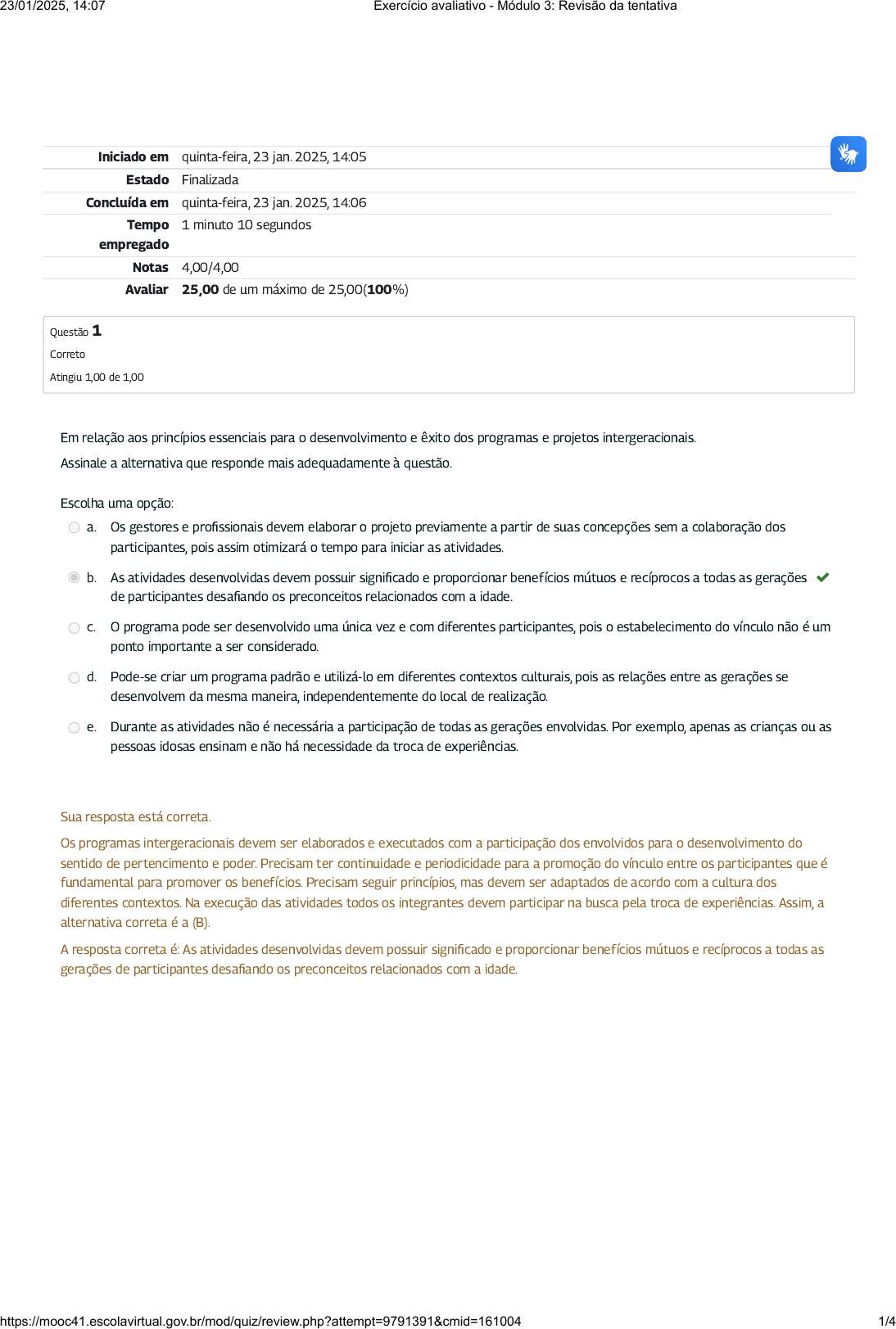 Iniciado em quinta-feira, 23 jan. 2025, 14:05 Estado Finalizada Concluída em quinta-feira, 23 jan. 2025, 14:06 Tempo empregado 1 minuto 10 segundos Notas 4,00/4,00 Avaliar 25,00 de um máximo de 25,00(100%) Questão 1 Correto Atingiu 1,00 de 1,00 Em relação aos princípios essenciais para o desenvolvimento e êxito dos programas e projetos intergeracionais. Assinale a alternativa que responde mais adequadamente à questão. Escolha uma opção: a. Os gestores e pro�ssionais devem elaborar o projeto previamente a partir de suas concepções sem a colaboração dos participantes, pois assim otimizará o tempo para iniciar as atividades. b. As atividades desenvolvidas devem possuir signi�cado e proporcionar benefícios mútuos e recíprocos a todas as gerações de participantes desa�ando os preconceitos relacionados com a idade. c. O programa pode ser desenvolvido uma única vez e com diferentes participantes, pois o estabelecimento do vínculo não é um ponto importante a ser considerado. d. Pode-se criar um programa padrão e utilizá-lo em diferentes contextos culturais, pois as relações entre as gerações se desenvolvem da mesma maneira, independentemente do local de realização. e. Durante as atividades não é necessária a participação de todas as gerações envolvidas. Por exemplo, apenas as crianças ou as pessoas idosas ensinam e não há necessidade da troca de experiências. Sua resposta está correta. Os programas intergeracionais devem ser elaborados e executados com a participação dos envolvidos para o desenvolvimento do sentido de pertencimento e poder. Precisam ter continuidade e periodicidade para a promoção do vínculo entre os participantes que é fundamental para promover os benefícios. Precisam seguir princípios, mas devem ser adaptados de acordo com a cultura dos diferentes contextos. Na execução das atividades todos os integrantes devem participar na busca pela troca de experiências. Assim, a alternativa correta é a (B). A resposta correta é: As atividades desenvolvidas devem possuir signi�cado e proporcionar benefícios mútuos e recíprocos a todas as gerações de participantes desa�ando os preconceitos relacionados com a idade. 23/01/2025, 14:07 Exercício avaliativo - Módulo 3: Revisão da tentativa https://mooc41.escolavirtual.gov.br/mod/quiz/review.php?attempt=9791391&cmid=161004 1/4 Questão 2 Correto Atingiu 1,00 de 1,00 Em relação aos diferentes mecanismos para promoção da participação social das pessoas idosas que você aprendeu nesta unidade (empregabilidade, trabalho voluntário e inclusão digital). Assinale a alternativa que responde mais adequadamente à questão. Escolha uma opção: a. A empregabilidade do trabalhador maduro (a partir de 50 anos) deve ser estimulada em condições de igualdade de oportunidades e de recursos para evitar a cultura de sua substituição. Além de outras políticas públicas, uma das alternativas é o fomento à educação continuada voltada ao aprimoramento de suas habilidades, técnicas ou acadêmicas. b. Os programas de inclusão digital precisam ter um conteúdo programático básico e �xo para desenvolver as habilidades necessárias nas pessoas idosas. Portanto, é essencial que recebam informações sobre word, excel, power point, e-mail). Somente depois é que podem ter acesso a atividades envolvendo tecnologias que são necessárias para a sua independência no cotidiano. c. Devem ser criadas estratégias de divulgação sobre as oportunidades de trabalho voluntário para a população idosa. Porém, logo após a adaptação devem suprir a demanda de recursos humanos do local para que possam receber um pagamento simbólico. d. A maioria das pessoas idosas utiliza sem di�culdades os aparelhos celulares, pois seus familiares possuem paciência para ensinar a manusear e compreender suas funções devido aos programas intergeracionais serem amplamente divulgados. e. A inserção das pessoas idosas no mercado de trabalho não auxiliará na complementação da força de trabalho no futuro (proveniente da diminuição da população economicamente ativa), pois somente conseguem auxiliar em trabalhos voluntários leves. Sua resposta está correta. Os conteúdos dos programas de inclusão digital não devem ter um conteúdo �xo, podendo ser adaptados conforme a necessidade e preferências de cada aluno. Ainda, é importante abordar temas e atividades que façam parte do cotidiano e auxiliem as pessoas idosas na integração com a sociedade. O trabalho voluntário não visa suprir os recursos humanos e sim oportunizar o engajamento das pessoas idosas por meio da solidariedade e cidadania tornando-se uma ferramenta terapêutica importante para aquele que pratica e trazendo benefícios para os locais que recebem os voluntários. Muitas pessoas idosas possuem aparelhos celulares, mas tem di�culdade de utilização, pois geralmente os familiares não têm paciência, tempo e disposição para ensinar. A integração das pessoas idosas no mercado de trabalho auxiliará o sistema produtivo e econômico a superar o dé�cit de mão de obra, principalmente quali�cada, que se projeta no futuro em função da transição demográ�ca. Assim, a resposta correta é a letra A. A resposta correta é: A empregabilidade do trabalhador maduro (a partir de 50 anos) deve ser estimulada em condições de igualdade de oportunidades e de recursos para evitar a cultura de sua substituição. Além de outras políticas públicas, uma das alternativas é o fomento à educação continuada voltada ao aprimoramento de suas habilidades, técnicas ou acadêmicas. 23/01/2025, 14:07 Exercício avaliativo - Módulo 3: Revisão da tentativa https://mooc41.escolavirtual.gov.br/mod/quiz/review.php?attempt=9791391&cmid=161004 2/4 Questão 3 Correto Atingiu 1,00 de 1,00 Em relação à temática da sexualidade e longevidade. Assinale a alternativa que responde mais adequadamente à questão. Escolha uma opç