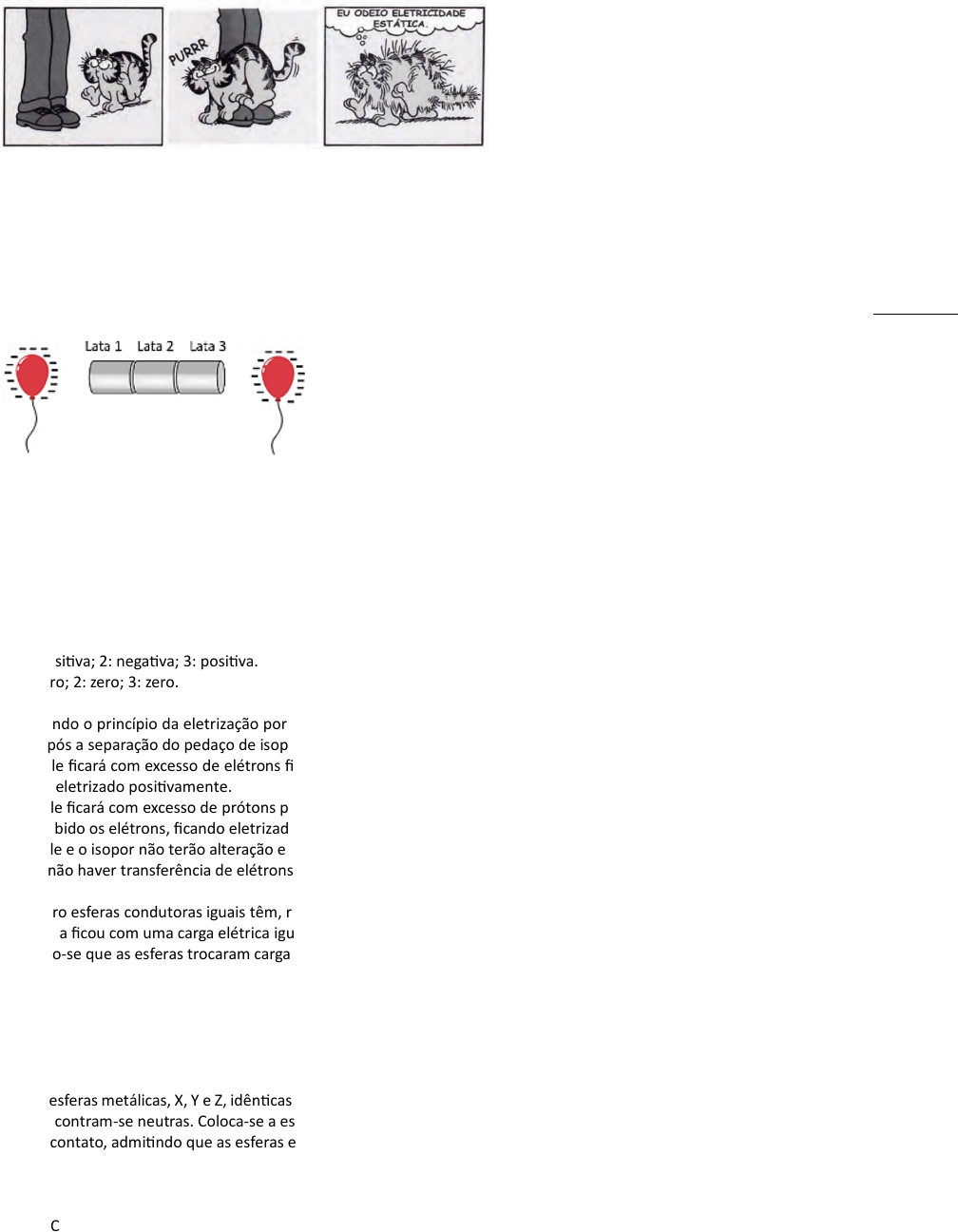 Exercícios eletrização Prof.ª Larissa Frinhani 1- Por qual motivo ocorre a eletrização ilustrada na tirinha? A) Troca de átomos entre a calça e os pelos do gato. B) Diminuição do número de prótons nos pelos do gato. C) Criação de novas partículas eletrizadas nos pelos do gato. D) Movimentação de elétrons entre a calça e os pelos do gato. E) Repulsão entre partículas elétricas da calça e dos pelos do gato. 2- Dois balões negativamente carregados são utilizados para induzir cargas em latas metálicas, alinhadas e em contato, que, inicialmente, estavam eletricamente neutras. Conforme mostrado na figura, os balões estão próximos, mas jamais chegam a tocar as latas. Nessa configuração, as latas 1, 2 e 3 terão, respectivamente, carga total: Note e adote: O contato entre dois objetos metálicos permite a passagem de cargas elétricas entre um e outro. Suponha que o ar no entorno seja um isolante perfeito. A) 1: zero; 2: negativa; 3: zero. B) 1: positiva; 2: zero; 3: positiva. C) 1: zero; 2: positiva; 3: zero. D) 1: positiva; 2: negativa; 3: positiva. E) 1: zero; 2: zero; 3: zero. 3- Segundo o princípio da eletrização por atrito, ao atritarmos um pedaço de isopor na pele pode haver transferência de elétrons entre eles. Neste caso, após a separação do pedaço de isopor da pele é correto afirmar que: A) A pele ficará com excesso de elétrons ficando, assim, eletrizada negativamente e o isopor ficará com excesso de prótons por ter cedido elétrons, ficando eletrizado positivamente. B) A pele ficará com excesso de prótons por ter cedido elétrons, ficando, assim, eletrizada positivamente e o isopor ficará com excesso de carga por ter recebido os elétrons, ficando eletrizado negativamente. C) A pele e o isopor não terão alteração em suas cargas devido ao isopor apresentar características isolantes. D) Por não haver transferência de elétrons, ambos serão eletrizados positivamente. 4- Quatro esferas condutoras iguais têm, respectivamente, cargas elétricas Y, Q, Q /2 e 2Q. Colocando-se todas em contato e, depois, separando-as, cada uma ficou com uma carga elétrica igual a 5Q/4. Sabendo-se que as esferas trocaram cargas elétricas apenas entre si, é correto afirmar que a carga elétrica Y, da primeira carga elétrica, era igual a A) Q/2 B) Q C) 3Q/2 D) 2Q E) 5Q/2 5- Três esferas metálicas, X, Y e Z, idênticas e condutoras, estão isoladas entre si. A esfera X está carregada com carga elétrica igual a 24 µC e as esferas Y e Z encontram-se neutras. Coloca-se a esfera X em contato simultâneo com Y e Z, separando-as em seguida. Determine a carga elétrica da esfera X após o contato, admitindo que as esferas encontram-se em um sistema eletricamente isolado. A) 6 µC B) 4 µC C) 2 µC D) 12 µC E) 8 µC 6- Três corpos eletrizados inicialmente com carga Q1 = -2 µC, Q2 = 5 µC e Q3 = -4 µC, localizam-se em um sistema eletricamente isolado. Após trocarem cargas entre si, os corpos 1 e 2 apresentam as cargas Q`1 = 1 µC e Q`2 = 3 µC, respectivamente. Qual a carga final do corpo 3 (Q`3)? Qual o número de elétrons cedidos ou recebidos pelo corpo 2? (Dado 1 µC = 10-6 C.) A) -2 µC e 1,50 . 1013 elétrons. B) -5 µC e 1,25 . 1013 elétrons. C) 2 µC e 1,25 . 1013 elétrons. D) -3 µC e 1,75 . 1013 elétrons. Mobile User E) 1 µC e 1,25 . 1013 elétrons. 7- Num experimento realizado no laboratório de eletricidade, os alunos dispunham de duas esferas condutoras iguais, A, inicialmente neutra, e B, com uma carga +Q, apoiadas em suportes isolantes e separadas por uma distância muito maior que o raio das mesmas, de modo que a força eletrostática entre elas pudesse ser desprezada. Foram realizados os seguintes procedimentos: (1) As esferas foram colocadas em contato e, em seguida, dispostas em suas posições iniciais. (2) Sem alterar a disposição das esferas, a esfera B foi momentaneamente aterrada e, em seguida, a ligação com a terra foi desfeita. Podemos afirmar que: I. As duas esferas condutoras terminaram o procedimento (1) com cargas de mesmo sinal e mesmo valor absoluto. II. A transferência de carga entre as esferas, durante o procedimento (1), cessou quando a carga da esfera A aumentou para +Q /2, devido à transferência da carga –Q /2 da esfera A para a esfera B. III. No procedimento (2), quando a esfera B foi aterrada, elétrons com carga total igual a – Q/2 migraram da terra para a esfera B, deixando-a neutra. IV. Quando a ligação com a terra foi removida no procedimento (2), a força eletrostática entre as esferas voltou a ser desprezível, por conta da distância entre as mesmas. Assinale a alternativa correta: A) Somente as afirmativas I, II e III estão corretas. B) Somente as afirmativas I e III estão corretas. C) Somente as afirmativas I e IV estão corretas. D) Somente as afirmativas II e III estão corretas. E) Todas as afirmativas estão corretas. 8- A força elétrica que age entre dois corpos, ou entre partículas carregadas eletricamente, depende do valor das cargas e da distância entre os dois objetos. Essa força foi chamada de Lei de Coulomb. De acordo com a lei de Coulomb, se dois corpos eletrizados são colocados em uma região de vácuo e a distância entre eles aumenta de d para 3d, pode-se afirmar que a força elétrica fica: A) aumentada de 3 vezes B) aumentada de 9 vezes C) diminuída de 3 vezes D) diminuída de 9 vezes 9- A força de interação elétrica entre duas cargas de intensidades Q e 2Q, mantidas a uma distância d uma da outra, é igual a 1 N. Se a distância entre essas cargas elétricas for reduzida à metade, a relação entre a intensidade da força elétrica entre as cargas quando a distância era d e da força elétrica entre as mesmas cargas após a distância ter sido reduzida à metade é A) 4:1. B) 2:1. C) 1:1. D) 1:2. E) 1:4. 10- Sejam duas cargas pontuais, com mesma carga Q em módulo. A força atrativa entre elas é 0,010 N quando estão separadas por uma distância D. Ao m