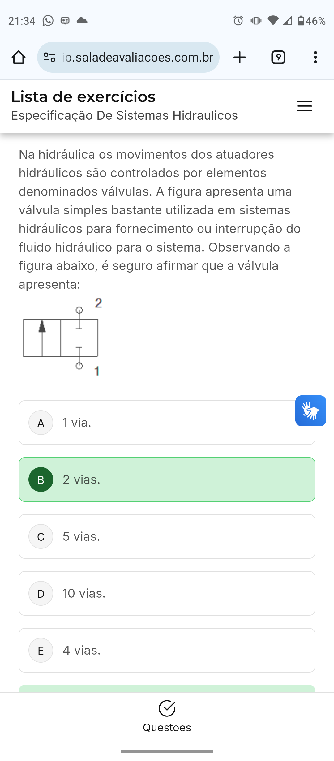 21:34 46% + 9 Lista de exercícios Especificação De Sistemas Hidraulicos Na hidráulica os movimentos dos atuadores hidráulicos são controlados por elementos denominados válvulas. A figura apresenta uma válvula simples bastante utilizada em sistemas hidráulicos para fornecimento ou interrupção do fluido hidráulico para sistema. Observando a figura abaixo, é seguro afirmar que a válvula apresenta: 2 1 A 1 via. 2 vias. C 5 vias. D 10 vias. E 4 vias. Questões