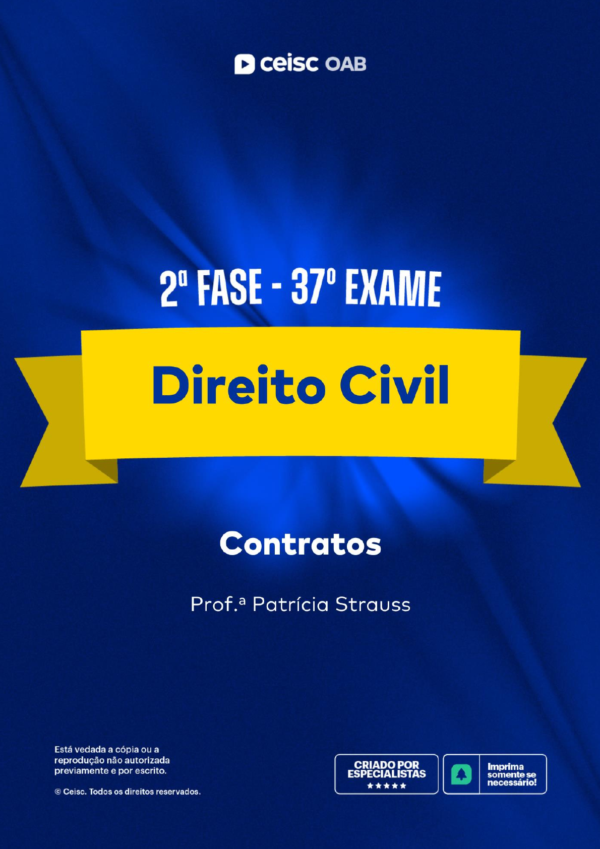 2ª Fase Civil 37º Exame de Ordem Direito dos Contratos | Prof.ª Patrícia Strauss 1 2ª Fase Civil 37º Exame de Ordem Direito dos Contratos | Prof.ª Patrícia Strauss 2 2ª FASE OAB | CIVIL | 37º EXAME Direito dos Contratos Prof.ª Patrícia Strauss SUMÁRIO 01. Organização.................................................................................................. 3 02. Formação dos Contratos............................................................................... 4 03. Estipulação em Favor de Terceiro: artigos 436 – 438...................................5 04. Promessa de Fato de Terceiro: artigos 439 – 440........................................6 05. Vícios Redibitórios: artigos 441 – 446........................................................... 6 06. Evicção: artigos 447 – 457............................................................................ 8 07. Contratos Aleatórios: artigos 458 – 461......................................................10 08. Contrato Preliminar: artigos 462 a 466 do CC............................................10 09. Contrato com Pessoa a Declarar: artigos 467 a 471 do CC.......................11 10. Extinção do Contrato: artigos 472 a 480 do CC..........................................11 11. Contratos em Espécie: Compra e Venda....................................................13 12. Troca ou Permuta........................................................................................18 13. Contrato Estimatório....................................................................................19 14. Contrato de Doação.....................................................................................19 15. Da Locação de Coisas.................................................................................22 16. Contrato de Empréstimo..............................................................................24 17. Prestação de Serviços.................................................................................27 18. Empreitada...................................................................................................28 19. Contrato de Depósito...................................................................................31 20. Contrato de Mandato...................................................................................32 21. Contrato de Comissão.................................................................................35 22. Contratos de Agência e Distribuição...........................................................36 23. Contrato de Corretagem..............................................................................37 24. Contrato de Transporte...............................................................................38 25. Contrato de Seguro.....................................................................................40 26. Contrato de Constituição de Renda............................................................45 27. Do Jogo e da Aposta...................................................................................45 28. Contrato de Fiança......................................................................................46 29. Transação....................................................................................................48 30. Compromisso e Arbitragem.........................................................................49 31. Atos Unilaterais de Vontade........................................................................49 Olá, aluno(a). Este material de apoio foi organizado com base nas aulas do curso preparatório para a 2ª Fase OAB e deve ser utilizado como um roteiro para as respectivas aulas. Além disso, recomenda-se que o aluno assista as aulas acompanhado da legislação pertinente. Bons estudos, Equipe Ceisc. Atualizado em dezembro de 2022. 2ª Fase Civil 37º Exame de Ordem Direito dos Contratos | Prof.ª Patrícia Strauss 3 01. Organização Prof.ª Patrícia Strauss @prof.patriciastrauss → Parte Geral: artigos 421 até 480. → Parte Especial: artigos 481 até 853. → Atos Unilaterais: artigos 854 até 886. 1 – PRELIMINARES: Artigos 421 – 426. 1.1 Princípios Contratuais Há diversos princípios que embasam o Direito Contratual, como o Princípio da Função Social do Contrato, da Boa-fé Objetiva, do “Pacta sunt servanda” e do Consensualismo. Art. 421 – Função Social do Contrato: É um princípio que limita a própria autonomia da vontade, já que impede que o contrato prevaleça se estiver em desacordo com o interesse social. Como exemplos de aplicações do princípio, temos os institutos do estado de perigo (art. 156 do CC) e lesão (art. 157 do CC). Em 2019, houve uma alteração legislativa, e o art. 421 sofreu o acréscimo de um parágrafo, determinando que, como regra, não haja intervenção do Estado nos contratos entre iguais e que possível revisão seja feita em caráter excepcional. Art. 422 – Princípio da Boa‑Fé Objetiva: Pode ser definido como uma regra geral de conduta em que as partes contratantes devem observar desde a fase preliminar dos contratos até o próprio cumprimento e execução. Possui como um de seus mais importantes corolários a aplicação da “proibição do comportamento contraditório”. 2ª Fase Civil 37º Exame de Ordem Direito dos Contratos | Prof.ª Patrícia Strauss 4 Art. 482 – Princípio do Consensualismo: Como regra, os contratos são perfeitos com a aceitação. Há, no entanto, contratos que são perfeitos com a tradição, que é o caso do contrato de comodato (art. 579 do CC), por exemplo. 1.2 – “Pacto corvina” e demais artigos. O Código Civil veda a contratação sobre herança de pessoa vida. Tal proibição está no art. 426. Caso haja tal contratação, tal negócio jurídico seria nulo, por força dos Arts. 166, II, e 166, VII (2ª parte). Artigos 423 e 424 falam sobre contrato de adesão e privilegiam a par