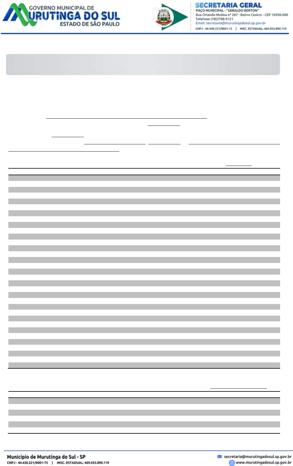 1 EDITAL DE CONVOCAÇÃO PARA PROVA PRÁTICA CONCURSO PÚBLICO Nº 01/24 O MUNICÍPIO DE MURUTINGA DO SUL, pessoa jurídica de direito público interno, inscrita no CNPJ/MF sob nº 44.430.221/0001-75 , com sede administrativa na Rua Orlando Molina, nº 267, Centro, Município de Murutinga do Sul, Estado de São Paulo, neste ato representado por seu Prefeito Municipal Sr. CRISTIANO ELEUTERIO SOARES DA SILVA, no uso de suas atribuições legais, em atendimento ao Concurso Público nº 01/24, após a aplicação da prova objetiva em 26 de janeiro de 2025, TORNA PÚBLICA A CONVOCAÇÃO PARA APLICAÇÃO DA PROVA PRÁTICA dos cargos públicos de Motorista e Operador de máquinas, os quais os abaixo relacionados ficam CONVOCADOS: 1. Ficam CONVOCADOS para a aplicação da prova prática para os cargos públicos de MOTORISTA e OPERADOR DE MÁQUINAS, que será realizada no dia 16 de fevereiro de 2025, às 08:00 horas no VELÓRIO MUNICIPAL, localizado à Via de Acesso Idílio Romio nº 270 – Murutinga do Sul/SP. LISTA DE CLASSIFICADOS NA PRIMEIRA FASE E CONVOCADOS PARA A PROVA PRÁTICA DE MOTORISTA: Nº INSC CANDIDATO Data Nasc Prova Objetiva Colocação 3676 IEDA MARIA DUARTE DOS REIS 28/01/1989 85,00 1º 3793 RODRIGO ROCHA BARBOSA DO NASCIMENTO 22/03/1975 77,50 2º 3718 BENJAMIM DE SANTANA SANTOS 11/02/1992 77,50 3º 3687 LEANDRO FRANCO GASPARELLI 27/01/1976 75,00 4º 3762 DARLETE DIAS DE SOUZA 31/03/1984 75,00 5º 3720 JOSÉ ROBERTO DOS SANTOS 21/03/1975 72,50 6º 3814 LEANDRO HIROSHI MURAI 14/08/1983 72,50 7º 3954 CAIO CESAR XAVIER BRUSCHI 21/03/1987 72,50 8º 3973 JULIANO TETSUO KOGA 04/07/1990 72,50 9º 3686 RICHARD ANDRÉ DE SOUZA 24/02/1981 70,00 10º 3734 MARCO ANTÔNIO LOPES SANTANA 28/02/1998 70,00 11º 3926 ANDRÉ PEREIRA DE SOUSA 09/05/1977 67,50 12º 3825 REGINALDO DE ALMEIDA FIGUEIRA 13/10/1982 67,50 13º 3670 DAVID OLIVEIRA DOS SANTOS 24/04/1995 67,50 14º 3833 DIEGO AUGUSTO PANDO BESSELI 28/08/1996 67,50 15º 3920 ADRIANO MARCHES OLIVEIRA 21/04/1970 65,00 16º 3827 ALEXANDRE ACACIO THEODORO CORREA 27/10/1978 65,00 17º 3765 ERICO SOARES BRAGA 11/05/1981 65,00 18º 3748 CLAUDEMIR BIALON OROSCO 17/12/1961 62,50 19º 3890 ANDRÉ FRANCISCO XAVIER 15/03/1984 62,50 20º 3972 GABRIEL MORAIS GALBIATI 02/03/1996 62,50 21º 3712 ADELIO ALVES DOS ANJOS 31/10/1968 60,00 22º 3977 PAULO SERGIO PEREIRA CAVALCANTE 07/01/1974 60,00 23º 3678 JEFERSON SANTOS TAVARES 10/11/2000 60,00 24º 3874 GUILHERME FABIANO FERREIRA NEVES 15/08/1982 57,50 25º 3803 TIAGO SOARES FERREIRA 09/08/1984 57,50 26º 3752 MILTON CEZAR EUGÊNIO 03/11/1973 55,00 27º 3666 ANDRE DA SILVA SANTANA 21/01/1989 55,00 28º 3753 FABIO DA SILVA VALENTIM 21/05/1993 55,00 29º 3955 MARCELO AMORIM BEZERRA 19/04/1976 52,50 30º 3919 JONATHAN GOMES DOS SANTOS 06/12/1987 52,50 31º 3790 JOSÉ FAUSTINO RODRIGUES DA SILVA 10/07/1962 50,00 32º 3799 BRUNO YOSHIO NISHIDA 02/12/1993 50,00 33º LISTA DE CLASSIFICADOS NA PRIMEIRA FASE E CONVOCADOS PARA A PROVA PRÁTICA DE OPERADOR DE MÁQUINAS: Nº INSC CANDIDATO Data Nasc Total Colocação 3834 VALCIR APARECIDO MALAMAN 21/11/1973 75,00 1º 3681 RENAN PEREIRA DE SOUZA 06/11/1998 72,50 2º 3839 FRANCISCO GUSTAVO DE MOURA ANDRADE 01/03/2002 70,00 3º 3831 ÉRICO ATHAYDE DA SILVA 14/01/1979 62,50 4º 3812 ALAN APARECIDO DA SILVA VIEIRA 21/02/1978 57,50 5º 3689 LUCIANO PEREIRA DE SOUZA 20/02/1979 55,00 6º 2 2. Solicitamos ao candidato convocado que releia muito atentamente e observe os dispostos procedimentais constantes do Edital de Concurso Público, especialmente os dispostos no item 5.1.2. e seus subitens, entre os quais que deverá comparecer ao local de prova com pelo menos uma hora de antecedência, munido de documento oficial de identidade com foto e no original, e também que deverá apresentar laudo ou atestado de capacidade física original, emitido por médico devidamente registrado emitido em no máximo 60 (sessenta) dias da realização da prova prática, conforme os itens 5.2.3. e 5.2.4. Além dessa documentação, será necessária a apresentação de carteira de habilitação original na categoria exigida, dentro do prazo de validade para realização da prova, bem como, assinar termo de ciência e concordância das condições estabelecidas em Edital, e termo de responsabilidade perante a Prefeitura e a terceiros pela condução de veículos. 2.1. Relembramos o item 5.2.5. do Edital de Concurso Público esclarece que o candidato que deixar de apresentar laudo ou atestado de capacidade física emitido por médico regularmente inscrito no CRM para realização da prova, nos termos deste, fica automaticamente desclassificado, bem como impedido de realizá-la, não havendo pretexto que supra tal lacuna. 2.2. Relembramos ainda que segundo o item 5.2.6. do Edital de Concurso Público, o candidato somente terá 01 (uma) tentativa para realização da prova, que será aplicada por avaliadores certificados, e acompanhada por fiscais da empresa organizadora e da Prefeitura Municipal, reservando-se às mesmas a filmagem integral do procedimento e o uso das imagens, caso necessário. 2.3. Os critérios existentes nas planilhas estão dispostos no anexo, e os candidatos ao cargo público deverão tomar completa ciência, e, em caso de dúvida efetuar os questionamentos necessários pelos meios legitimados de requerimento e recurso, com antecedência mínima de 03 (três) dias sob pena de preclusão. 2.4. Lembramos ainda que os candidatos que devam usar lentes corretoras, o deverão fazer, bem como deverão comparecer trajados em trajes condignos com a profissão que supostamente poderão exercer, não sendo aceitos candidatos de bermudas, camisetas cavadas, ou qualquer outra veste que não se coadune com a dignidade da Administração Pública, bem como devidamente calçados com calçado apropriado para efetuar a função, sendo inadmissíveis candidatos com chinelos, sandálias ou afins que possam acarretar em insegurança ou descumprimento de normas regulamentares. 3. Ficam todos os exa