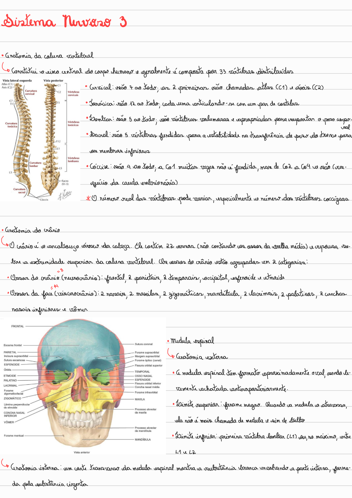 Sistema Nervaso 3 Anatomia da vertebral w central do corpo human i 33 vertibras Vista lateral esquerda Vista posterior Atlas C1 Áxis (C2) Curvatura 7 as 2 atlas (C1) ((2) cervical cervicais T1 12 todo cada uma wm par de cestelar Curvatura Vértebras sao 5 para torácica toracicas sao 5 para a estabilidade na de do para T12 lombares Curvatura lombar : 4 a muitar veges i fundida, de a w L5 Sacro (S1-5) quicio da cauda embrionaria) Curvatura sacral real das pode especialmente w das do i w da Ele 22 contando da wrelha u bre a extremidade superior da Us do um 2 categorian: do cranio 2 2 da face : 2 2 2 2 2 palatinas, 2 inferiores FRONTAL Escama frontal Sutura coronal espinal PARIETAL Forame supraorbital Incisura supraorbital Margem supraorbital Anatomia externa Sutura escamosa Forame optico (canal) ESFENOIDE Fissura orbital superior Órbita TEMPORAL ETMOIDE NASAL medula espinal usendo le- PALATINO ESFENOIDE Fissura orbital inferior LACRIMAL Concha nasal média Forame achatada zigomaticofacial Forame infraorbital ZIGOMÁTICO MAXILA perpendicular do etmoide Laimite superior : Quando va medula w Processo alveolar CONCHA NASAL da maxila INFERIOR VÔMER ela nao i chamada de medula sim de bulbo Processo alveolar da Forame mentual Limite (L1) no Vista anterior L1 u L2 interna : write da medula espinal a substancia branca a parte interna, da pelade de H de i composta corpos não u Raiz posterior do Gânglio sensitivo nervo espinal do nervo espinal Vista Sulco mediano posteriores Nervo espinal posterior Como posterior Funículo lateral Sulco mediano posterior Como lateral Funículo posterior Raiz anterior do Funículo posterior Corno posterior nervo espinal Canal central Como anterior Axônio de um neurônio Funículo lateral sensitivo Comissura cinzenta Plano transverso Corpo celular de um Comissura cinzenta Axônio de um interneurônio interneurônio Corpo celular de um Corno lateral Comissura branca anterior neurônio motor autônomo Funículo anterior Canal central Corpo celular de um Corpo celular de um neurônio sensitivo Corno anterior neurônio motor somático Impulsos nervosos Fissura mediana anterior sensitivos Funículo anterior anteriores Impulsos nervosos para Fissura mediana músculos Axônios de neurônios motores músculos lisos e anterior A. Corte transverso alto da medula espinal lombar Impulsos nervosos glândulas MO 5x para músculos esqueléticos B. Corte transverso alto da medula espinal lombar Carno contim de de sensitives corpies celulares de * Carno lateral celulares de motores anterior contin celulares de somaticos anteriorer dividem a substancia branca um 3 funi- who de com you chamades transmitem you dem use estender distancias na medula No SNC, no de nerves. (ascendentes) conduzem impulsor uncifals, (dercendenter) le- vam impulsor do Or sensitives da medula espinal saw do interna da medula espinal permite as sensitivas as processadas Trato Trato Trato sensitivo motor sensitivo do seguinte (ascendente) (descendente) (ascendente) Receptores sensitivos detectam um estímulo sensitivo. Neurônios sensitivos transmitem esta aferência (influxo) sensitiva, na forma de impulsos nervosos, por seus axônios, sensitivo 6 que se estendem dos receptores sensitivos até o nervo espinal e então até a raiz posterior. A partir da raiz posterior, os do nervo espinal axônios dos neurônios sensitivos podem seguir três caminhos diferentes (ver as etapas Raiz posterior do Nervo espinal nervo espinal Os axônios dos neurônios sensitivos podem se projetar para a substância branca da medula espinal e ascender até o encéfalo como parte de um trato sensitivo. Corno lateral posterior Os axônios dos neurônios sensitivos penetram no corno posterior e realizam sinapse com interneurônios, cujos Corno anterior axônios se estendem até a substância branca, e então ascendem até o encéfalo como parte de um trato sensitivo. Raiz anterior do Os axônios dos neurônios sensitivos podem entrar no corno posterior e realizar sinapse com interneurônios que, por nervo espinal sua vez, se comunicam com os neurônios motores sinapticos envolvidos com as vias espinais reflexas. Os reflexos Interneurônio medulares são descritos detalhadamente mais adiante. As eferências motoras da medula espinal para os músculos esqueléticos envolvem neurônios motores somaticos do Neurônio motor somático Neurônio motor autônomo corno anterior. Muitos destes neurônios são regulados pelo encéfalo. Os axônios de centros encefálicos superiores Neurônio sensitivo formam tratos motores que descem do encéfalo em direção à substância branca da medula Neste local, eles realizam sinapses com neurônios motores direta ou indiretamente (neste caso, realizando sinapse com interneurônios que, na sequência, se comunicam com neurônios motores Quando ativados, os neurônios motores transmitem as eferências motoras, na forma de impulsos nervosos, por seus axônios, os quais sequencialmente passam pelo corno anterior e pela raiz anterior para depois entrar no nervo Do nervo espinal, estes axônios se projetam até os vários músculos esqueléticos do corpo. As eferências motoras para músculo músculo liso e glândulas envolvem neurônios motores do corno Receptores sensitivos lateral. Quando ativados, os neurônios motores autônomos transmitem estas eferências, na forma de impulsos da pele nervosos, por seus axônios, os quais passam sequencialmente pelo corno lateral, pelo corno anterior e pela raiz anterior para depois entrar no nervo espinal. A partir da medula espinal, os axônios dos neurônios motores autônomos realizam sinapse com outro grupo de neurônios motores autônomos, localizado no sistema nervoso periférico (SNP). Os axônios deste segundo grupo de g Neurônio motor neurônios autônomos, por sua vez, realizam sinapses com os músculos cardiaco, liso e com as Músculo esquelético cardiaco, músculo liso e glândulasCamadar do manto marginal de um neural fechado consiste cilular Essas est