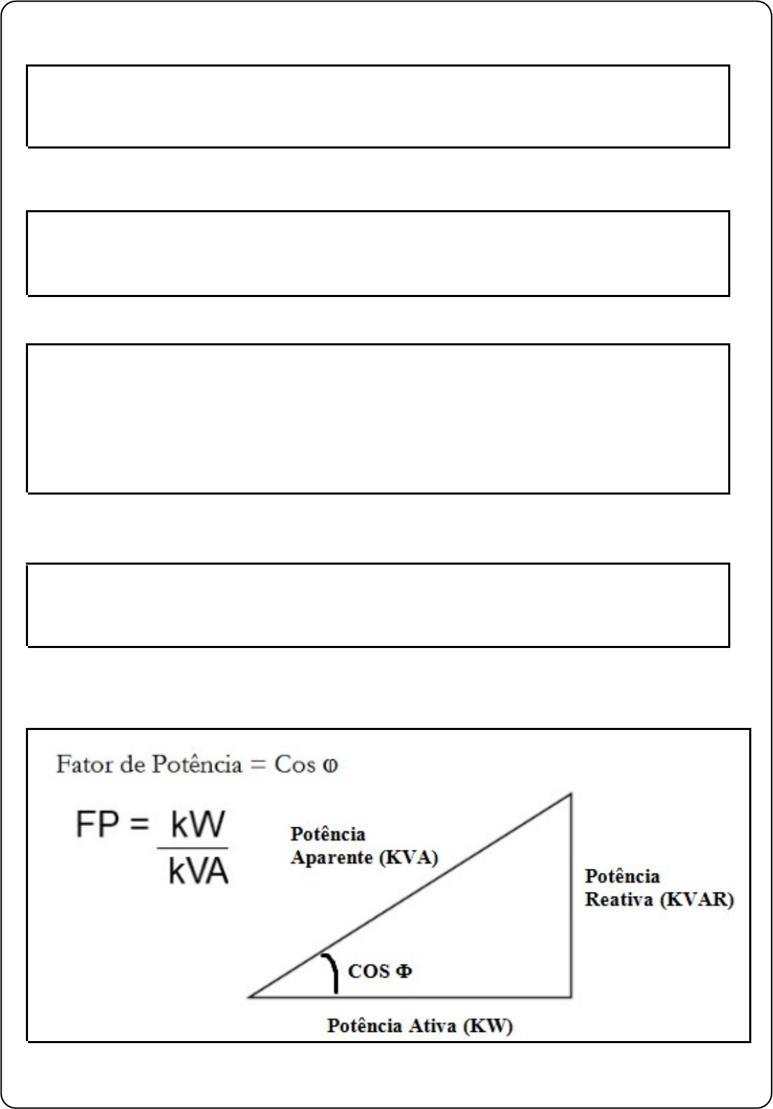 Fator de Potência = Cos O FP = kW Potência kVA Aparente (KVA) Potência Reativa (KVAR) Potência Ativa (KW)