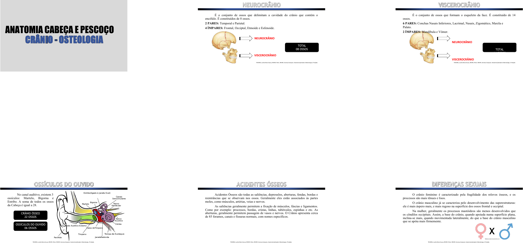 ANATOMIA CABEÇA E PESCOÇO É o conjunto de ossos que delimitam a cavidade do crânio que contém o encéfalo. É constituídos de 8 ossos. 2 PARES: Temporal e Parietal. 4 ÍMPARES: Frontal, Occiptal, Etmoide e Esfenoide. NEUROCRÂNIO VISCEROCRÂNIO TOTAL 08 OSSOS TEIXEIRA, Lucilia Maria Souza, REHER, Peter, REHER, Vanessa Sampaio. Anatomia Aplicada à Odontologia, 2ª edição. É o conjunto de ossos que formam o esqueleto da face. É constituído de 14 ossos. 6 PARES: Conchas Nasais Inferiores, Lacrimal, Nasais, Zigomático, Maxila e Palato. 2 ÍMPARES: Mandíbula e Vômer. NEUROCRÂNIO TOTAL 14 OSSOS VISCEROCRÂNIO TEIXEIRA, Lucilia Maria Souza, REHER, Peter, REHER, Vanessa Sampaio. Anatomia Aplicada à Odontologia, 2ª edição. TEIXEIRA, Lucilia Maria Souza, REHER, Peter, REHER, Vanessa Sampaio. Anatomia Aplicada à Odontologia, 2ª edição. No canal auditivo, existem 3 ossículos: Martelo, Bigorna e Estribo. A soma de todos os ossos da Cabeça é igual a 28. CRÂNIO ÓSSEO 22 OSSOS OSSÍCULOS DO OUVIDO 06 OSSOS Acidentes Ósseos são todas as saliências, depressões, aberturas, fendas, bordas e reentrâncias que se observam nos ossos. Geralmente eles estão associados às partes moles, como músculos, artérias, veias e nervos. As saliências geralmente permitem a fixação de músculos, fáscias e ligamentos. Como por exemplo: processos, bordas, cristas, linhas, tubérculos, espinhas e etc. As aberturas, geralmente permitem passagem de vasos e nervos. O Crânio apresenta cerca de 85 forames, canais e fissuras normais, com nomes específicos. TEIXEIRA, Lucilia Maria Souza, REHER, Peter, REHER, Vanessa Sampaio. Anatomia Aplicada à Odontologia, 2ª edição. O crânio feminino é caracterizado pela fragilidade dos relevos ósseos, e os processos são mais tênues e lisos. O crânio masculino já se caracteriza pelo desenvolvimento das superestruturas: ele é mais áspero mais, e mais rugoso na superfície dos ossos frontal e occiptal. Na mulher, geralmente os processos mastóideos são menos desenvolvidos que os côndilos occipitais. Assim, a base do crânio, quando apoiada numa superfície plana, inclina-se mais, quando movimentada lateralmente, do que a base do crânio masculino que se apóia mais firmemente. X Fonte: prosadeumaesteticista.net TEIXEIRA, Lucilia Maria Souza, REHER, Peter, REHER, Vanessa Sampaio. Anatomia Aplicada à Odontologia, 2ª edição. TEIXEIRA, Lucilia Maria Souza, REHER, Peter, REHER, Vanessa Sampaio. Anatomia Aplicada à Odontologia, 2ª edição. Ao nascer, a criança possui praticamente todo o encéfalo, olhos e ouvido formados, e estes não irão crescer muito com o desenvolvimento normal. Assim, o neurocrânio apresenta uma dimensão praticamente definida, em quanto o viscerocrânio ainda está pouco desenvolvido, tendo a seguinte proporção: 7/8 (Neurocrânio) e 1/8 (Viscerocrânio). O início das atividades respiratórias e digestivas exerce papel importante no crescimento inicial do Viscerocrânio. A expansão dos seios paranasais e a erupção dos dentes, também produzem grandes surtos de crescimento. Durante a vida, existem períodos onde o desenvolvimento é mais frequente. Podemos dividir em 3 picos: DENTIÇÃO DECÍDUA: 1º surto associado à erupção dos dentes decíduos até os 2 anos de idade. DENTIÇÃO PERMANENTE: 2º surto associado à erupção dos dentes permanentes entre os 6 e 12 anos de idade. TRAÇÕES MUSCULARES E PUBERDADE: 3º surto associado à maior frequência das trações musculares e o alto índice de produção de hormônios na puberdade. TEIXEIRA, Lucilia Maria Souza, REHER, Peter, REHER, Vanessa Sampaio. Anatomia Aplicada à Odontologia, 2ª edição. TEIXEIRA, Lucilia Maria Souza, REHER, Peter, REHER, Vanessa Sampaio. Anatomia Aplicada à Odontologia, 2ª edição. Na vista superior, o crânio é bastante liso e uniforme, pois não à inserções musculares importantes e também não há a necessidade de ele ser perfurado para a passagem de vasos ou nervos. Nesta vista ele possui um formato ovoide e constitui a calota craniana. TEIXEIRA, Lucilia Maria Souza, REHER, Peter, REHER, Vanessa Sampaio. Anatomia Aplicada à Odontologia, 2ª edição. SUTURA SAGITAL: une os parietais entre si; SUTURA CORONAL: une o frontal aos parietais; SUTURA LAMBDÓIDE: une os parietais ao occipital; BREGMA: ponto craniométrico localizado na intersecção das suturas coronal e sagital; LAMBDA: ponto craniométrico localizado na intersecção das suturas sagital e lambdóide; VÉRTICE: ponto mais alto do crânio 2cm posteriormente ao bregma; EMINÊNCIA PARIETAL: porção mais convexa do osso parietal; FORAMES PARIETAIS: podem aparecer próximo ao lámbda e dão passagem a uma veia emissária que drena a díploe; OSSOS SUTURAIS: variação anatômica que pode ocorrer nas junções ósseas da calota do crânio. sendo mais frequente entre os parietais com os occipitais. Esta vista continua sendo lisa como a vista superior, mas à medida que caminhamos em direção inferior, ela se torna mais acidentada, devido a inserção dos músculos do pescoço que irão sustentar a cabeça. TEIXEIRA, Lucilia Maria Souza, REHER, Peter, REHER, Vanessa Sampaio. Anatomia Aplicada à Odontologia, 2ª edição. TEIXEIRA, Lucilia Maria Souza, REHER, Peter, REHER, Vanessa Sampaio. Anatomia Aplicada à Odontologia, 2ª edição. SUTURA SAGITAL: une os parietais entre si; SUTURA LAMBDÓIDE: une os parietais ao occipital; LAMBDA: ponto craniométrico localizado na intersecção das suturas sagital e lambdóide; SUTURA OCCIPITOMASTÓIDEA: une o occipital ao processo mastóideo do temporal. SUTURA PARIETOMASTÓIDEA: une o parietal ao processo mastóideo do temporal. ASTÉRIO: ponto craniométrico que se localiza na intersecção entre as suturas parietomastóidea, occipitomastóidea e lambdóide. FORAME MASTÓIDE: dá passagem a uma veia emissária. PROTUBERÂNCIA OCCIPITAL EXTERNA: projeção mediana facilmente palpável in vivo, um pouco abaixo do lambda. LINHA
