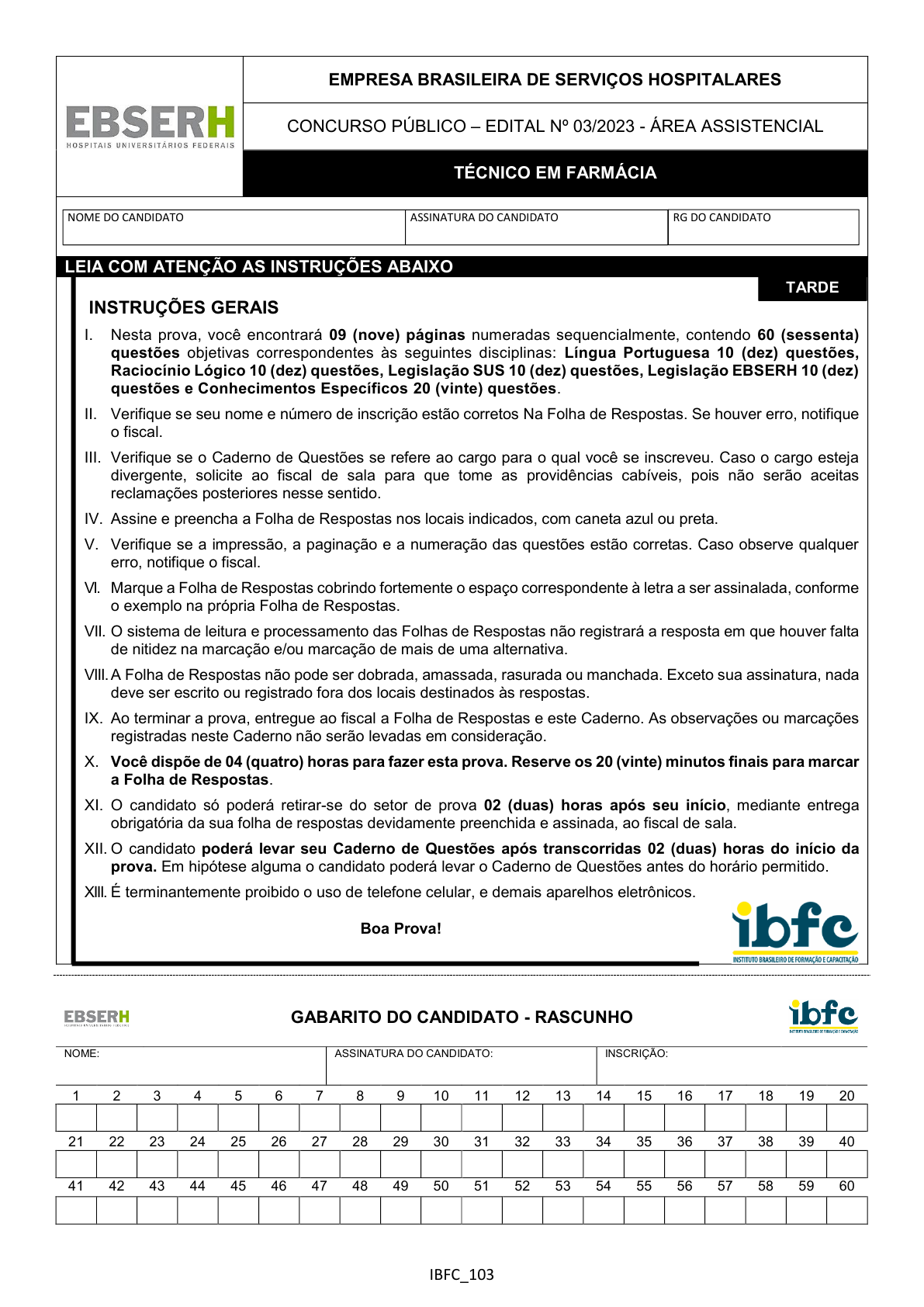 IBFC_103 EMPRESA BRASILEIRA DE SERVIÇOS HOSPITALARES CONCURSO PÚBLICO – EDITAL Nº 03/2023 - ÁREA ASSISTENCIAL TÉCNICO EM FARMÁCIA LEIA COM ATENÇÃO AS INSTRUÇÕES ABAIXO INSTRUÇÕES GERAIS I. Nesta prova, você encontrará 09 (nove) páginas numeradas sequencialmente, contendo 60 (sessenta) questões objetivas correspondentes às seguintes disciplinas: Língua Portuguesa 10 (dez) questões, Raciocínio Lógico 10 (dez) questões, Legislação SUS 10 (dez) questões, Legislação EBSERH 10 (dez) questões e Conhecimentos Específicos 20 (vinte) questões. II. Verifique se seu nome e número de inscrição estão corretos Na Folha de Respostas. Se houver erro, notifique o fiscal. III. Verifique se o Caderno de Questões se refere ao cargo para o qual você se inscreveu. Caso o cargo esteja divergente, solicite ao fiscal de sala para que tome as providências cabíveis, pois não serão aceitas reclamações posteriores nesse sentido. IV. Assine e preencha a Folha de Respostas nos locais indicados, com caneta azul ou preta. V. Verifique se a impressão, a paginação e a numeração das questões estão corretas. Caso observe qualquer erro, notifique o fiscal. VI. Marque a Folha de Respostas cobrindo fortemente o espaço correspondente à letra a ser assinalada, conforme o exemplo na própria Folha de Respostas. VII. O sistema de leitura e processamento das Folhas de Respostas não registrará a resposta em que houver falta de nitidez na marcação e/ou marcação de mais de uma alternativa. VIII. A Folha de Respostas não pode ser dobrada, amassada, rasurada ou manchada. Exceto sua assinatura, nada deve ser escrito ou registrado fora dos locais destinados às respostas. IX. Ao terminar a prova, entregue ao fiscal a Folha de Respostas e este Caderno. As observações ou marcações registradas neste Caderno não serão levadas em consideração. X. Você dispõe de 04 (quatro) horas para fazer esta prova. Reserve os 20 (vinte) minutos finais para marcar a Folha de Respostas. XI. O candidato só poderá retirar-se do setor de prova 02 (duas) horas após seu início, mediante entrega obrigatória da sua folha de respostas devidamente preenchida e assinada, ao fiscal de sala. XII. O candidato poderá levar seu Caderno de Questões após transcorridas 02 (duas) horas do início da prova. Em hipótese alguma o candidato poderá levar o Caderno de Questões antes do horário permitido. XIII. É terminantemente proibido o uso de telefone celular, e demais aparelhos eletrônicos. Boa Prova! GABARITO DO CANDIDATO - RASCUNHO NOME: ASSINATURA DO CANDIDATO: INSCRIÇÃO: 1 2 3 4 5 6 7 8 9 10 11 12 13 14 15 16 17 18 19 20 21 22 23 24 25 26 27 28 29 30 31 32 33 34 35 36 37 38 39 40 41 42 43 44 45 46 47 48 49 50 51 52 53 54 55 56 57 58 59 60 NOME DO CANDIDATO ASSINATURA DO CANDIDATO RG DO CANDIDATO TARDE RASCUNHO