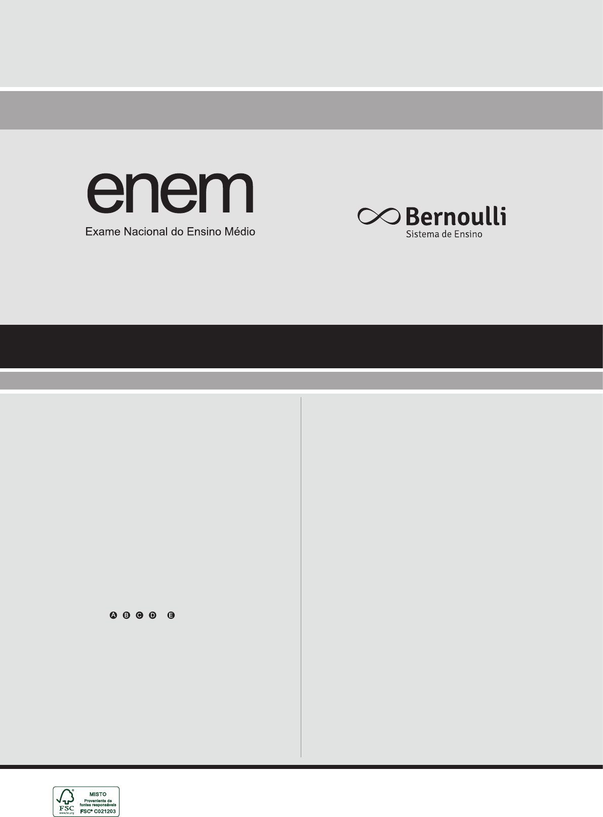 PROVA DE CIÊNCIAS DA NATUREZA E SUAS TECNOLOGIAS PROVA DE MATEMÁTICA E SUAS TECNOLOGIAS 1 Este CADERNO DE QUESTÕES contém 90 questões numeradas de 91 a 180, dispostas da seguinte maneira: a. as questões de número 91 a 135 são relativas à área de Ciências da Natureza e suas Tecnologias; b. as questões de número 136 a 180 são relativas à área de Matemática e suas Tecnologias. 2 Confira se o seu CADERNO DE QUESTÕES contém a quantidade de questões e se essas questões estão na ordem mencionada na instrução anterior. Caso o caderno esteja incompleto, tenha qualquer defeito ou apresente divergência, comunique ao aplicador da sala para que ele tome as providências cabíveis. 3 Escreva e assine seu nome nos espaços próprios do CARTÃO-RESPOSTA com caneta esferográfica de tinta preta. 4 Não dobre, não amasse nem rasure o CARTÃO-RESPOSTA, pois ele não poderá ser substituído. 5 Para cada uma das questões objetivas, são apresentadas 5 opções identificadas com as letras , , , e . Apenas uma responde corretamente à questão. 6 Use o código presente nesta capa para preencher o campo correspondente no CARTÃO-RESPOSTA. 7 Com seu RA (Registro Acadêmico), preencha o campo correspondente ao código do aluno. Se o seu RA não apresentar 7 dígitos, preencha os primeiros espaços e deixe os demais em branco. 8 No CARTÃO-RESPOSTA, preencha todo o espaço destinado à opção escolhida para a resposta. A marcação em mais de uma opção anula a questão, mesmo que uma das respostas esteja correta. 9 O tempo disponível para estas provas é de cinco horas. 10 Reserve os 30 minutos finais para marcar seu CARTÃO-RESPOSTA. Os rascunhos e as marcações assinaladas no CADERNO DE QUESTÕES não serão considerados na avaliação. 11 Quando terminar as provas, acene para chamar o aplicador e entregue este CADERNO DE QUESTÕES e o CARTÃO-RESPOSTA. 12 Você poderá deixar o local de prova somente após decorridas duas horas do início da aplicação e poderá levar seu CADERNO DE QUESTÕES ao deixar em definitivo a sala de provas nos últimos 30 minutos que antecedem o término das provas. 13 Você será excluído do Exame, a qualquer tempo, no caso de: a. prestar, em qualquer documento, declaração falsa ou inexata; b. agir com incorreção ou descortesia para com qualquer participante ou pessoa envolvida no processo de aplicação das provas; c. perturbar, de qualquer modo, a ordem no local de aplicação das provas, incorrendo em comportamento indevido durante a realização do Exame; d. se comunicar, durante as provas, com outro participante verbalmente, por escrito ou por qualquer outra forma; e. portar qualquer tipo de equipamento eletrônico e de comunicação durante a realização do Exame; f. utilizar ou tentar utilizar meio fraudulento, em benefício próprio ou de terceiros, em qualquer etapa do Exame; g. utilizar livros, notas ou impressos durante a realização do Exame; h. se ausentar da sala de provas levando consigo o CADERNO DE QUESTÕES antes do prazo estabelecido e / ou o CARTÃO-RESPOSTA a qualquer tempo. LEIA ATENTAMENTE AS INSTRUÇÕES SEGUINTES *de acordo com o horário de Brasília 2021 ESTA PROVA SOMENTE PODERÁ SER APLICADA A PARTIR DO DIA 27/03/2021, ÀS 13H00*. Simulado 1 – Prova II EXAME NACIONAL DO ENSINO MÉDIO CIÊNCIAS DA NATUREZA E SUAS TECNOLOGIAS Questões de 91 a 135 QUESTÃO 91 Remdesivir é um profármaco análogo de nucleosídeo com atividade antiviral direta contra vários vírus de RNA. Ele é convertido dentro da célula em seu metabólito ativo – trifosfato de nucleosídeo. Os análogos de nucleosídeos são compostos sintéticos que funcionam por competição com os naturais endógenos. Embora esses compostos imitem suas contrapartes fisiológicas, a incorporação da molécula análoga interrompe os processos moleculares subsequentes. O mecanismo de ação desse fármaco é mostrado a seguir. MALIN, J. J. et al. Remdesivir against COVID-19 and other viral diseases. Clinical Microbiology Reviews, v. 34, out. 2020 (Adaptação). Esse fármaco impede a replicação viral, pois bloqueia a etapa de A. transcrição reversa das moléculas de RNA viral em DNA. B. liberação das partículas virais formadas dentro da célula. C. integração do DNA viral no genoma da célula hospedeira. D. tradução da proteína viral responsável pela replicação do RNA. E. produção do material genético constituinte das partículas virais. QUESTÃO 92 No “anda e para” do trânsito das grandes cidades, algumas vezes já tivemos a seguinte sensação: nosso veículo está parado, mas o que está ao lado começa a se movimentar, dando a sensação de que nos deslocamos para trás. Com o olhar um pouco mais atento, quando estamos em uma rodovia reta e plana a uma velocidade constante, praticamente não sentimos o movimento do carro. Porém, ao olhar para fora, temos a impressão de que árvores, prédios e demais objetos que estão à margem da rodovia se deslocam no sentido contrário ao do nosso movimento. Disponível em: . Acesso em: 30 nov. 2020. Cientificamente, o conceito tratado no texto é o de A. sentido. B. posição. C. direção. D. repouso. E. referencial. QUESTÃO 93 Para Leucipo e Demócrito, os átomos eram inquebráveis, tinham peso e participavam da constituição de todos os corpos, os quais tinham cada qual seu tipo de átomo. No entanto, Aristóteles (384-322 a.C.) não aceitava o atomismo de Leucipo e Demócrito, pois, em sua concepção, os corpos eram constituídos de matéria, mas também de atributos imateriais. A principal objeção de Aristóteles à teoria atômica de Leucipo e Demócrito estaria relacionada à sua incapacidade de explicar a mudança nas substâncias, as transformações químicas, como diríamos hoje. Para Aristóteles, se existissem átomos para cada tipo de substância, não haveria possibilidade de transformações químicas, o que se chocava com a evidência. FILGUEIRAS, C. A. L. Duzentos ano