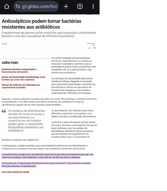 Curso: Enfermagem/3º período. Nomes: Carla Cristina, Vitória Souza. https://g1.globo.com/Noticias/Ciencia/0,,MUL1427934-5 A bactéria Pseudomonas aeruginosa é uma bactéria gram-negativa, baciliforme e aeróbia. É um microrganismo de origem ambiental, é comum de se desenvolver em solo, mas também é capaz de viver mesmo em ambientes hostis. Se desenvolve com facilidade em ambientes úmidos, mesmo com carência nutricional. Esse tipo de bactéria pode causar uma variedade de infecções, como pneumonia, infecções do trato urinário, infecções de feridas, sepse, endocardite e outras, e sua transmissão pode ocorrer por contato com superfícies ou água contaminadas, ou por inalação de aerossóis. Veja alguns exemplos: · Contato com solo ou água contaminados; · Contato com superfícies contaminadas, como banheiros, cozinhas, pias, umidificadores, banheiras de hidromassagem e piscinas; · Contato com equipamentos médicos mal esterilizados, como cateteres e ventiladores; · Contato com soluções antissépticas vencidas; · Contato com alimentos contaminados, como frutas e vegetais; · Contato de pessoa para pessoa, por meio de mãos contaminadas; · Inalação de aerossóis. Todavia, a bactéria Pseudomonas aeruginosa raramente infecta indivíduos saudáveis. O risco de infecção é maior para pessoas com sistemas imunológicos comprometidos. image1.jpg
