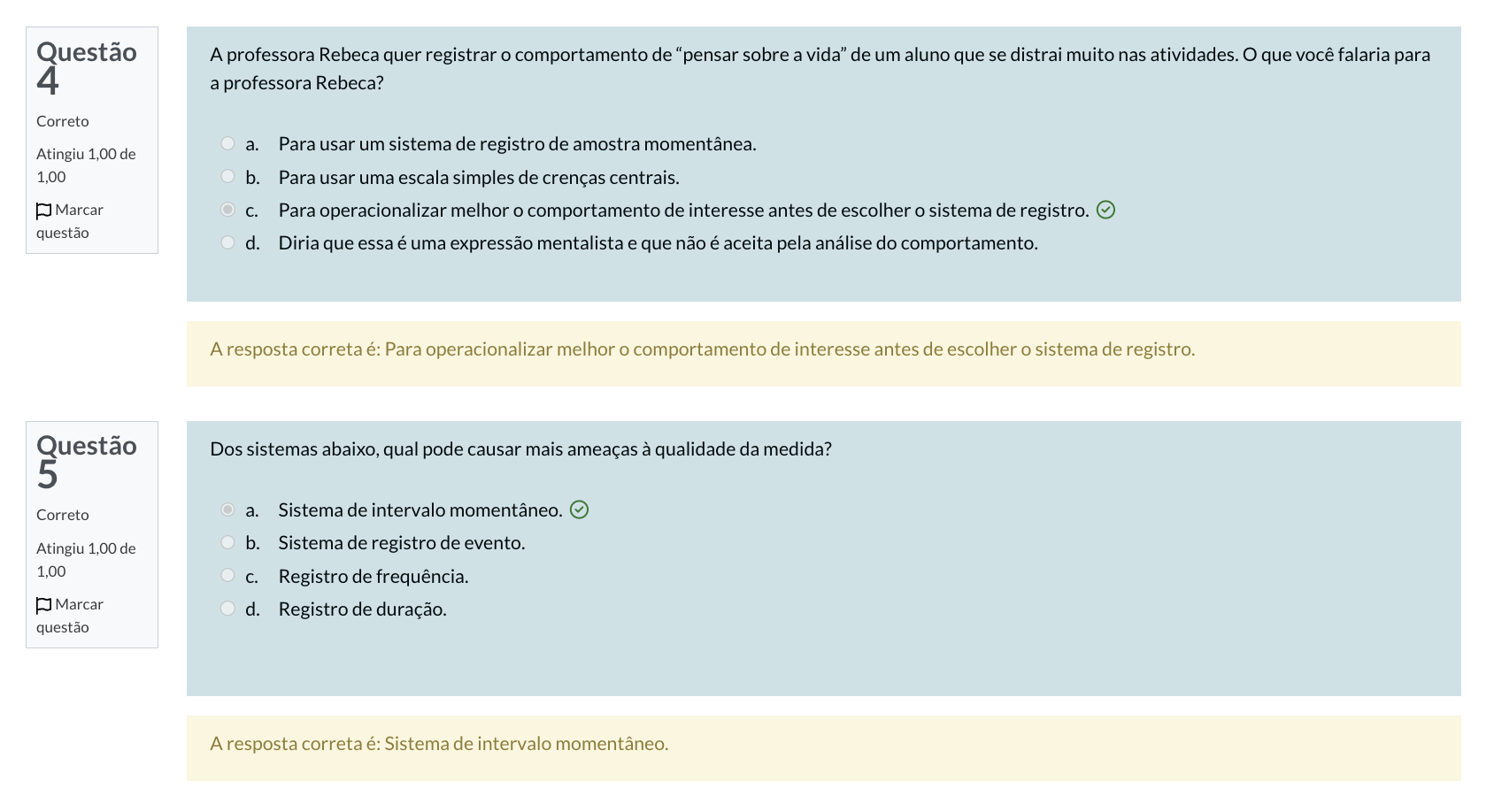 Questão A professora Rebeca quer registrar o comportamento de "pensar sobre a vida" de um aluno que se distrai muito nas atividades. que você falaria para 4 a professora Rebeca? Correto a. Para usar um sistema de registro de amostra momentânea. Atingiu 1,00 de 1,00 b. Para usar uma escala simples de crenças centrais. Marcar C. Para operacionalizar melhor o comportamento de interesse antes de escolher o sistema de registro. questão d. Diria que essa é uma expressão mentalista e que não é aceita pela análise do comportamento. A resposta correta é: Para operacionalizar melhor o comportamento de interesse antes de escolher o sistema de registro. Questão Dos sistemas abaixo, qual pode causar mais ameaças à qualidade da medida? 5 Correto a. Sistema de intervalo momentâneo. Atingiu 1,00 de b. Sistema de registro de evento. 1,00 C. Registro de frequência. Marcar d. Registro de duração. questão A resposta correta é: Sistema de intervalo momentâneo.