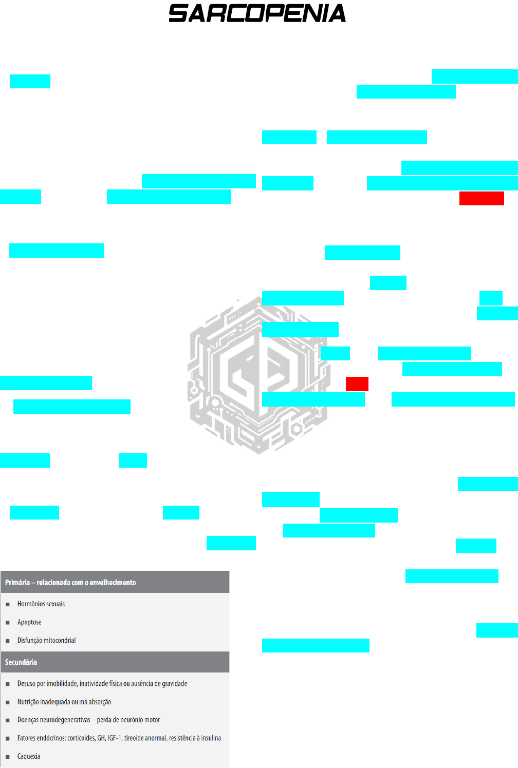 Gustavo Penna Introdução A definição de sarcopenia mais aceita mundialmente é a do European Working Group of Sarcopenia in Older People (EWGSOP), apoiada pelo Asian Working Group on Sarcopenia e atualizada pelo EWGSOP2 em janeiro de 2019. O EWGSOP define sarcopenia como uma síndrome caracterizada por progressiva perda de massa e força muscular esquelética e comprometimento funcional, com risco de desfechos negativos, como incapacidade física, piora da qualidade de vida e morte. A definição operacional de sarcopenia (Cruz-Jentoft et al., 2019) ocorre segundo os critérios: 1.Baixa força muscular. 2.Baixa massa muscular. 3.Baixo desempenho físico. Em que: Provável sarcopenia é identificada pelo critério 1 O diagnóstico é confirmado pelo registro adicional do critério 2 Se todos os critérios forem cumpridos (1, 2 e 3), a sarcopenia é considerada grave. Fisiopatologia A sarcopenia pode ser considerada primária quando não se encontra nenhuma causa identificável, além do próprio envelhecimento pode ser considerada secundária quando uma ou mais causas são evidentes. A fisiopatologia da sarcopenia envolve: Senescência das células satélites: As células satélites são pequenas células miogênicas, dispostas paralelamente às fibras musculares dentro da lâmina basal que envolve as fibras, são responsáveis pelo crescimento e regeneração muscular, contribuindo para o crescimento muscular pós-natal, o reparo de fibras musculares danificadas e a manutenção do músculo esquelético adulto. Células satélites senescentes reduzem sua habilidade de proliferar, reduzindo a reparação da musculatura esquelética Disfunção Mitocondrial: A função mitocondrial pode ser afetada pelo dano cumulativo ao DNA mitocondrial do músculo que é observado com o envelhecimento. Esse fato pode resultar em redução da taxa de síntese de proteína muscular e de trifosfato de adenosina (ATP) e, finalmente, na morte das fibras musculares e perda de massa muscular. ↕ Apoptose: Danos no DNA mitocondrial do tecido muscular são associadas a apoptose acelerada dos miócitos, a qual pode ser a via de ligação entre a disfunção mitocondrial e a perda de massa muscular. Outros mecanismos – mutações, diminuição de fatores de crescimento e imobilidade – também podem resultar em apoptose pelas duas vias(intrínseca e extrínseca). Inflamação crônica: O envelhecimento está associado a aumento gradual e crônico da produção de citocinas pró- inflamatórias (IL-1,IL-6 e TNF-α). Há evidências de que o aumento da massa gordurosa e a diminuição nos níveis de hormônios sexuais circulantes decorrentes do envelhecimento colaborem para isso. A elevação dos níveis séricos das citocinas pró-inflamatórias está relacionada com o aumento no catabolismo proteico das fibras musculares. Perda da função neuromuscular: A contribuição neurológica para a sarcopenia ocorre com a perda de neurônios motores-alfa(células nervosas responsáveis por controlar a contração das fibras musculares extrafusais, que são o principal componente gerador de força de um músculo.) A perda desses neurônios leva os neurônios remanescentes a controlar mais fibras musculares, mas isso causa uma diminuição na coordenação e força muscular devido ao aumento das unidades motoras e à redução dos neurônios alfa. Perda preferencial de fibras tipo II (contração rápida e forte) o que compromete a capacidade de gerar potência muscular. Modificações Hormonais Insulina A sarcopenia pode ser acompanhada por aumento progressivo da gordura corporal total e da gordura intramiocelular, as quais estão associadas a risco elevado de resistência à insulina, reduzindo assim o efeito anabólico da insulina(↑síntese e armazenamento de proteínas). Além disso, é válido ressaltar que nos idosos, após a ingestão de glicose e aminoácidos, os níveis de insulina aumentam, mas a taxa de síntese proteica resultante é menor em comparação com os jovens. Isso sugere que a resposta anabólica à insulina é menos eficiente em idosos. Ademais, a hiperinsulinemia pode estar associada à redução da função mitocondrial no idoso.* Estrogênio Estudos epidemiológicos sugerem que o estrógeno previne a perda de massa muscular, já que, com o seu declínio associado à idade, aumentam os níveis de citocinas pró-inflamatórias envolvidas no processo da sarcopenia. GH e IGF-1 Tanto o GH quanto o IGF-1 declinam com a idade e estão entre os prováveis contribuintes para o desenvolvimento da sarcopenia. Reposição de GH diminui a gordura corporal, aumenta a massa magra e melhora o perfil lipídico. O IGF-1 ativa a proliferação e a diferenciação de células satélites, além de aumentar a síntese de proteína nas fibras existentes. Testosterona Os níveis de testosterona declinam lentamente no homem idoso a uma taxa de 1% ao ano. A testosterona provoca aumento no número de células satélites musculares. Quando indicada para indivíduos hipogonádicos ou para idosos com baixos níveis séricos de testosterona, ela aumenta a massa, a força muscular e a síntese proteica. Deidroepiandrosterona(DHEA) Os níveis de DHEA, outro hormônio esteroide anabolizante(possui ação semelhante a testosterona), diminuem consideravelmente com a idade. Vitamina D e Paratormônio(PTH) Os níveis de 25(OH) vitamina D diminuem com a idade. Estudo epidemiológico recente evidenciou associação entre a sarcopenia e os baixos níveis de vitamina D, a qual exerce provável efeito no anabolismo muscular (Rolland et al., 2008). Baixos níveis de vitamina D são frequentemente associados à elevação do PTH. O PTH pode modular a função muscular a partir do aumento do cálcio intracelular ou pela indução de uma via pró-inflamatória Influência genética: Fatores genéticos são os principais fatores relacionados com a variabilidade da força muscular de um indivíduo. Poucos estudos têm investigado genes