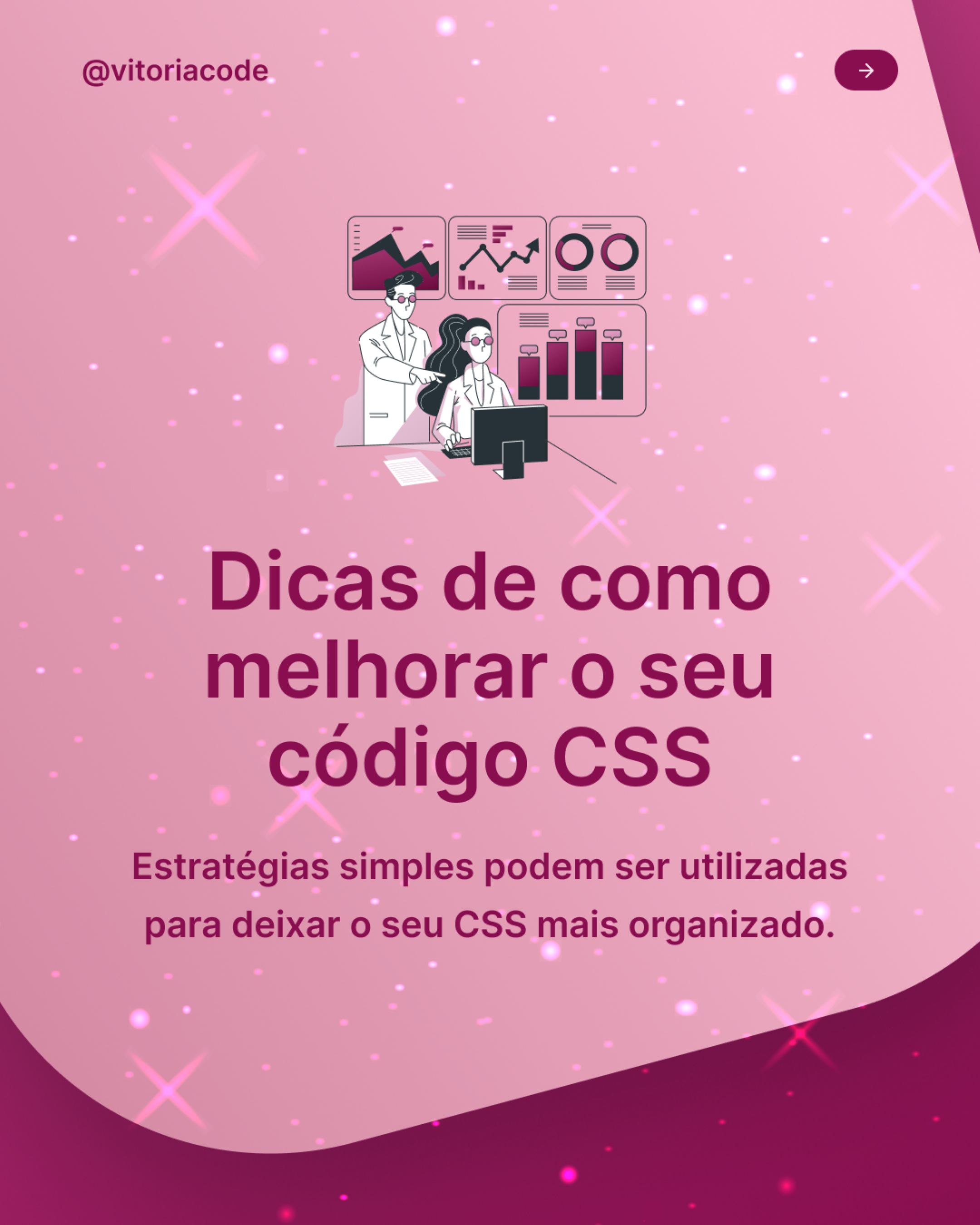@vitoriacode Dicas de como melhorar seu código CSS Estratégias simples podem ser utilizadas para deixar seu CSS mais organizado.Fonte 1 /* forma longa * / 2 font-style: italic; 3 font-weight: bold; 4 font-size: 24px; 5 font-height: 140%; 6 font-family: Arial; 7 8 /* forma curta */ 9 font: italic bold 24px/140% Arial; @vitoriacodeBorder ... 1 /* forma longa * / 2 border-width: 2px; 3 border-style: solid; 4 border-color: red; 5 6 /* forma curta / 7 border: 2px solid red;Margin 1 /* forma longa / 2 margin-top: 20px; 3 margin-right: 5px; 4 margin-bottom: 10px; 5 margin-left: 15px; 6 7 /* forma curta / 8 margin: 20px 5px 10px 15px;Padding ... 1 /* forma longa * / 2 padding-top: 20px; 3 padding-right: 5px; 4 padding-bottom: 10px; 5 padding-left: 15px; 6 7 /* forma curta */ 8 padding: 20px 5px 10px 15px;Background 1 /* forma longa */ 2 background-color: #CCC; 3 background-image: url(code.png); 4 background-repeat: no-repeat; 5 background-position: right bottom; 6 7 /* forma curta 8 background: #CCC url(code.png) 9 no-repeat right bottom; @vitoriacodecom 83% de desconto Quer trabalhar na programação? Recomendo curso FrontCode para você sair do zero R$100 R$17 LINK NA DESCRIÇÃO Voltar H Lista de Conteúdos 1 Introdução 0% HTML 2 indica CSS 3 aprender ender HTML Quiz 4 0% 5 Guia para aprender frontend 0% Guia para ingressar no mercado 6 0%O conteúdo foi útil para você? Salva aí para consultar depois. Deixa aquela curtida se te ajudei. Me fale que achou nos comentários. Compartilhe com seus amigos.