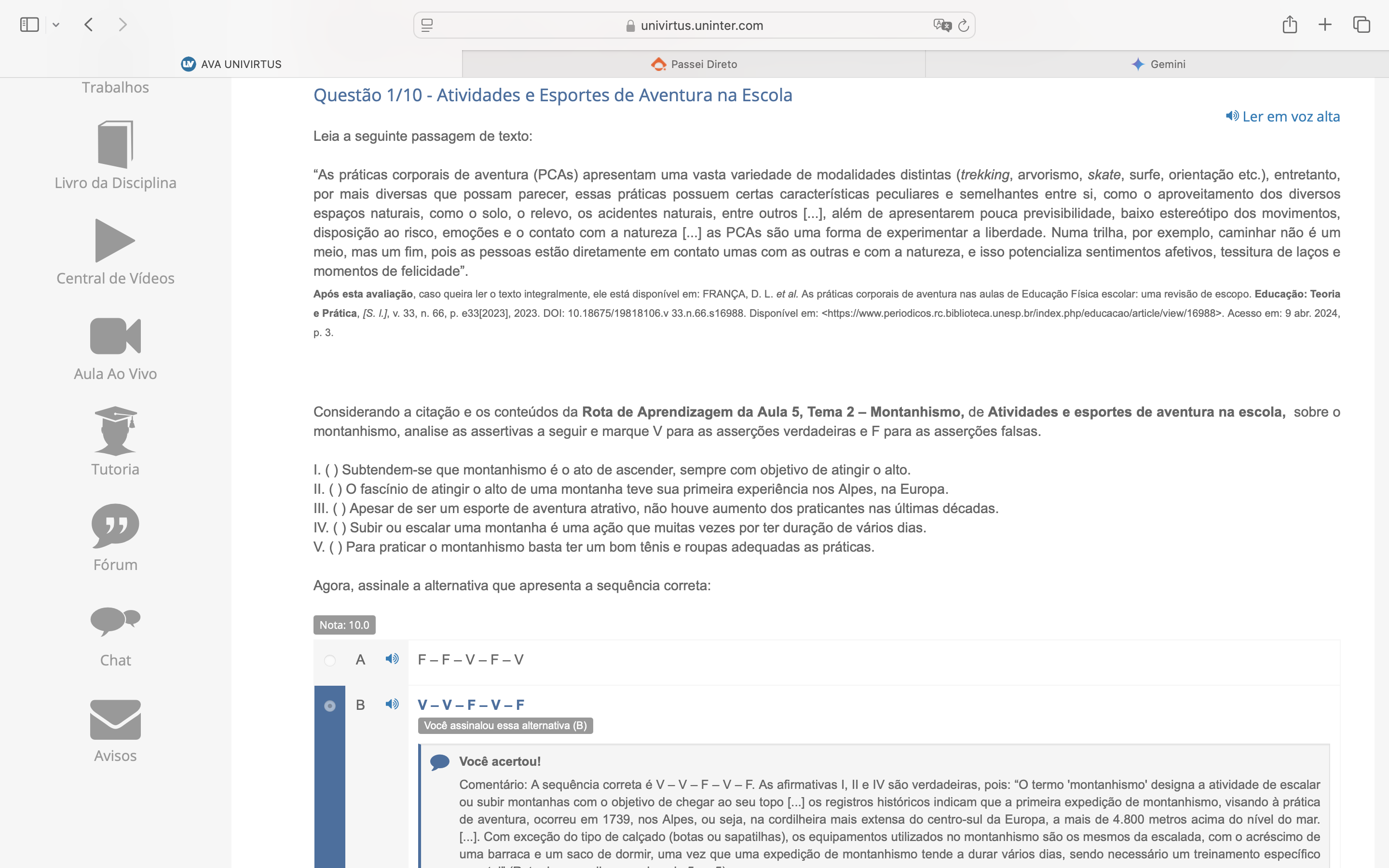 univirtus.uninter.com + AVA UNIVIRTUS Passei Direto Gemini Trabalhos Questão 1/10 Atividades e Esportes de Aventura na Escola Ler em alta Leia a seguinte passagem de texto: Livro da Disciplina "As práticas corporais de aventura (PCAs) apresentam uma vasta variedade de modalidades distintas (trekking, arvorismo, skate, surfe, orientação etc.), entretanto, por mais diversas que possam parecer, essas práticas possuem certas características peculiares e semelhantes entre si, como o aproveitamento dos diversos espaços naturais, como o solo, o relevo, os acidentes naturais, entre outros [...], além de apresentarem pouca previsibilidade, baixo estereótipo dos movimentos, disposição ao risco, emoções e o contato com a natureza [...] as PCAs são uma forma de experimentar a liberdade. Numa trilha, por exemplo, caminhar não é um meio, mas um fim, pois as pessoas estão diretamente em contato umas com as outras e com a natureza, e isso potencializa sentimentos afetivos, tessitura de laços e momentos de felicidade". Central de Vídeos Após esta avaliação, caso queira ler o texto integralmente, ele está disponível em: FRANÇA, D. L. et al. As práticas corporais de aventura nas aulas de Educação Física escolar: uma revisão de escopo. Educação: Teoria e Prática, [S. 33, n. 66, p. e33[2023], 2023. DOI: 10.18675/19818106.v 33.n.66.s16988. Disponível em: Acesso em: 9 abr. 2024, p. 3. Aula Ao Vivo Considerando a citação e os conteúdos da Rota de Aprendizagem da Aula 5, Tema 2 Montanhismo, de Atividades e esportes de aventura na escola, sobre o montanhismo, analise as assertivas a seguir e marque V para as asserções verdadeiras e F para as asserções falsas. Tutoria I. Subtendem-se que montanhismo é o ato de ascender, sempre com objetivo de atingir o alto. II. o fascínio de atingir o alto de uma montanha teve sua primeira experiência nos Alpes, na III. Apesar de ser um esporte de aventura atrativo, não houve aumento dos praticantes nas últimas décadas. " IV. Subir ou escalar uma montanha é uma ação que muitas vezes por ter duração de vários dias. V. Para praticar o montanhismo basta ter um bom tênis e roupas adequadas as práticas. Fórum Agora, assinale a alternativa que apresenta a sequência correta: Nota: 10.0 Chat A F-F-V-F-V B V-V-F-V-F Você assinalou essa alternativa (B) Avisos Você acertou! Comentário: A sequência correta é V V F V F. As afirmativas I, e IV são verdadeiras, pois: "O termo designa a atividade de escalar ou subir montanhas com o objetivo de chegar ao seu topo [...] os registros históricos indicam que a primeira expedição de montanhismo, visando à prática de aventura, ocorreu em 1739, nos Alpes, ou seja, na cordilheira mais extensa do centro-sul da Europa, a mais de 4.800 metros acima do nível do mar. [...]. Com exceção do tipo de calçado (botas ou sapatilhas), os equipamentos utilizados no montanhismo são os mesmos da escalada, com o acréscimo de uma barraca e um saco de dormir, uma vez que uma expedição de montanhismo tende a durar vários dias, sendo necessário um treinamento específico
