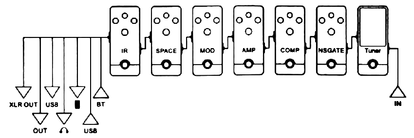 MANUAL DO USUÁRIO TANK-B (traduzido por Arthur Chaves) TANK-B é um pedal de contrabaixo portátil e multifuncional. Possui 36 Presets editáveis, os usuários também podem personalizar a cadeia de efeitos e salvar. TANK-B possui bateria embutida, possui Noise Gate, Compressor, 9 pré-amplificadores, EQ de 3 bandas, 3 modulações, 1 Delay, 1 Reverb, 8 slots IR CAB e afinador. Você pode baixar o software de computador ou APP de nossos canais oficiais, usá-lo para editar, trocar, compartilhar, importar/exportar predefinições e personalizar a cor da luz do footswitch que cada preset exibe, você pode importar os arquivos IR e restaurar as configurações de fábrica da máquina. Além disso, ele suporta tomada de gravação de telefone celular, BT, função de monitoramento de fone de ouvido, tomada de saída balanceada XLR e funciona como interface de som para computador. Integra uma variedade de funções, é fácil de transportar e tem um som excelente! Pode ser um bom parceiro para o seu baixo. I. Atenções: • A Fonte de Alimentação: Está equipado com uma bateria interna para fornecimento de energia, que pode durar 12 horas após a carga completa. Pode ser carregado com o adaptador de 5V ou o Power bank. Quando a bateria estiver fraca, você pode usar o adaptador de 5V 2A, você precisa de 4 horas para carregar completamente a bateria. Quando a bateria estiver fraca, a tela de exibição mostrará o padrão “U”. Ele aparece a cada cinco segundos. Quando a bateria estiver fraca, não a use por muito tempo para evitar um desempenho de trabalho instável, por favor, carregue-a a tempo. • A Conexão: Certifique-se de desligar a energia dos equipamentos relacionados antes de conectar ou desconectar o dispositivo. • A Interferência Elétrica: A onda eletromagnética do rádio, televisão e outros equipamentos podem causar interferência no equipamento, então por favor tente ficar longe do rádio, televisão e outros equipamentos. • A Localização: Para evitar deformação, descoloração ou outros danos graves, não exponha esta unidade às seguintes condições: a. Fontes de calor b. Campos magnéticos c. Luz solar d. Área de alta temperatura ou úmida e. Locais excessivamente empoeirados ou sujos f. Vibrações ou choques fortes II. Diagrama da cadeia de Efeitos III. Painel Traseiro 1 - IN: Entrada de áudio 1/4"MONO. 2 - Saída de áudio: Suporta gravação em celular. 3 - Saída de fone de ouvido. 4 - OUT: Saída de áudio 1/4"MONO. 5 - Interruptor de energia. 6 - Indicador de carga: Quando a bateria está sendo usada normalmente, o indicador se apaga; Durante a carga, o indicador fica vermelho, depois muda para azul após a carga completa. 7 - Porta USB Tipo C: Usada para carregar a bateria/ Para usar o TANK-B como interface de áudio/ Para conectar ao aplicativo no computador, editar os 36 grupos de predefinições e importar IRs. IV. Painel Frontal 1 - NOISE GATE: Ajuste o limite do NOISE GATE, mova para a extrema esquerda para fechar o NOISE GATE. 2 - ATTACK: Ajuste o tempo de ataque do efeito de compressão. 3 - SUSTAIN: Ajuste a taxa de compressão. 4 - TYPE: 9 slots de seleção de pré-amplificador. 5 - GAIN: Ajuste o ganho do AMP. 6 - TREBLE: Ajuste os agudos do AMP. 7 - MIDDLE: Ajuste o médio do AMP. 8 - BASS: Ajuste os graves do AMP. 9 - VOLUME: Ajuste o volume do AMP. 10 - MOD FX2: Ajuste os parâmetros de efeito da Modulação, este botão contém três processos, você pode usá-lo para selecionar um dos 3 tipos de MOD (Chorus, Phaser e Pitch) . 11 - MOD FX1: Ajuste os diferentes parâmetros para diferentes efeitos, para ajustar a VELOCIDADE do CHORUS, ajustar a VELOCIDADE do PHASER, ou ajustar o MIX de PITCH. 12 - SPACE MIX: Ajuste a proporção de seco e molhado do SPACE, este botão contém três processos, você pode usá-lo para selecionar um dos 3 tipos. 13 - SPACE TIME: Ajuste a duração ou velocidade do SPACE. 14 - IR CAB: Selecione os tipos de IR CAB. 15 - MASTER: Em qualquer caso, você pode usá-lo para controlar o volume de saída final do TANK-B, esta luz não é afetada por nenhum modo ou cenas. A luz MASTER geralmente acende depois que a energia é ligada, só se apaga quando você liga o TUNER. 16 - Indicador BT. 17 - A tela de exibição: Exibe o número do BANK, lá são 1-9 grupos; quando no modo TUNER, mostra o nome da nota; quando a bateria estiver fraca, ela mostra o padrão "U". 18 - A footswitch: Use-o para ligar/desligar A-Preset quando em PRESET modo, ou use-o para ligar/desligar o módulo SPACE quando em LIVE modo. 19 - B footswitch: Use-o para ligar/desligar B-Preset quando em modo PRESET, ou use-o para ligar/desligar o módulo MOD quando em modo LIVE. 20 - C footswitch: Use-o para ligar/desligar C-Preset quando em modo PRESET, ou use-o para ligar/desligar o módulo AMP quando em modo LIVE. 21 - D footswitch: Use-o para ligar/desligar D-Preset quando em modo PRESET, ou use-o para ligar/desligar o módulo COMP quando em modo LIVE. 22 - Use cabo XLR balanceado para conectar ao seu equipamento de estúdio, mixer, PA, ou alto-falante FRFR. V. Modulos de Efeitos Atenção: Por favor, certifique-se de que o TANK-B está no modo LIVE então você pode testar o módulo de efeitos abaixo. 1. Módulo NOISE GATE Botão NOISE GATE: Ajuste o limite do NOISE GATE, mova para a extrema esquerda para fechar o NOISE GATE. 2. Módulo COMPRESSOR ATTACK: Ajuste o tempo de ataque do efeito de compressão. SUSTAIN: Ajuste a taxa de compressão. 3. Módulo AMP Botão TYPE: Selecione os tipos de AMP, existem 9 diferentes tipos, por favor, consulte a lista. SLOT NAME 1 Baseado no Alembic F-2B preamp 2 Baseado no Fender Musicmaster Bass 3 Baseado no Marshall Super Bass Mark II 4 Baseado no Ampeg SVT 76 amp 5 Baseado no Vintage AC-100 bass amp 6 Baseado no Mesa/Boogie Bass 400 amp 7 Baseado no Ampeg B-15 Flip Top bass Amp 8 Baseado no Ampeg V-4B 9 Baseado no Fender Bassman 100 Nota: Os nomes de marcas e modelos mencionados acima são Marcas regis