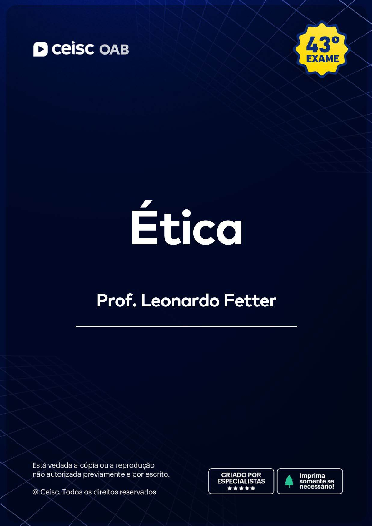 1ª Fase | 43° Exame da OAB Ética 1 1ª FASE OAB | 40° EXAME 1ª Fase | 43° Exame da OAB Ética 2 1ª Fase | 43° Exame da OAB Ética 3 1ª FASE OAB | 43° EXAME Ética Prof. Leonardo Fetter Sumário 1. Legislação da Ordem dos Advogados .................................................................................... 4 2. Órgão de Gestão da OAB ....................................................................................................... 5 3. Eleições e Mandatos na OAB ............................................................................................... 11 4. Inscrição na OAB .................................................................................................................. 13 5. Licenciamento e Cancelamento da Inscrição ........................................................................ 15 6. Estagiário ............................................................................................................................. 16 7. Advogado Empregado .......................................................................................................... 18 8. Atividades Privativas do Advogado ....................................................................................... 19 9. Sociedade de Advogados ..................................................................................................... 20 10. Procuração e Mandato ....................................................................................................... 23 11. Honorários Advocatícios ..................................................................................................... 25 12. Advocacia Pro Bono ........................................................................................................... 31 13. Direitos e Prerrogativas do Advogado ................................................................................ 32 14. Direitos da Mulher Advogada .............................................................................................. 39 15. Publicidade Profissional ...................................................................................................... 41 16. Infrações e Sanções Disciplinares ...................................................................................... 46 17. Processo Disciplinar ........................................................................................................... 48 18. Incompatibilidade e Impedimento ....................................................................................... 50 Olá, aluno(a)! Este material de apoio foi organizado com base nas aulas do curso preparatório para a 1ª Fase OAB e deve ser utilizado como um roteiro para as respectivas aulas. Além disso, reco- menda-se que o aluno assista as aulas acompanhado da legislação pertinente. Bons estudos, Equipe Ceisc. Atualizado em dezembro de 2024. 1ª Fase | 43° Exame da OAB Ética 4 1. Legislação da Ordem dos Advogados Prof. Leonardo Fetter @prof.fetter Inicialmente é importante ressaltar que é necessário estudar ética através de três normas, sendo elas: Atenção: a legislação para o estudo deve estar atualizada até a data do edital. 1.1. Natureza jurídica da OAB Os advogados que compõem os órgãos de gestão da OAB não são remunerados. Con- tudo, as pessoas contratadas para trabalharem na OAB, de acordo com a CLT, são remunera- das. Não há dúvida de que a OAB presta serviço público, com personalidade jurídica e forma federativa. A OAB tem natureza jurídica especial e única, sui generis, sendo pessoa jurídica de direito público interno, que executa serviço público federal, porém não equiparável à autarquia nem à entidade paraestatal, conforme definição do STF exarada na ADI nº 3.026/DF (rel. Min. Eros Grau – Tribunal Pleno – j. 8-6-2006 – publicado em 29-9-2006). Dentro dessa natureza jurídica diferenciada da OAB, ela tem imunidade quanto a tributos, contudo, atente-se, isso não quer dizer isenção. Dessa forma, a OAB tem uma qualidade/di- reito/prerrogativa das pessoas jurídicas de direito público, qual seja, a imunidade. Ainda, o contrato particular de honorários não exige duas testemunhas, nos termos do artigo 784, inciso III do CPC, para ser considerado título executivo extrajudicial, e isso quer dizer 1ª Fase | 43° Exame da OAB Ética 5 que o contrato de honorários é uma exceção, pois é sim possível ser executado como título executivo extrajudicial, ainda que não cumpra os requisitos de CPC. Por fim, o advogado, em uma condição de gestor da OAB, tem recebido legitimidade de interferir em processos que não são “seus”, mas que neles está ocorrendo violação de prerroga- tivas do advogado atuante. 2. Órgão de Gestão da OAB A partir da identificação dos órgãos de gestão da OAB, é possível perceber como a OAB se organiza, como a OAB é gerida e, após, entender as eleições, pois todos os órgãos de gestão são alcançados através de eleições. 1ª Fase | 43° Exame da OAB Ética 6 2.1. Conselho Federal (arts. 51 a 55 do Estatuto) O Conselho Federal é integrado por três Conselheiros Federais (a chamada delegação) oriundos dos Conselhos Seccionais (equivocadamente chamados de OAB Estadual), que são eleitos (compõem a chapa do Conselho Seccional) e têm mandato de três anos. Também são considerados membros do Conselho Federal, na forma do art. 51, inciso II do Estatuto, seus ex-presidentes (na qualidade de membros honorários vitalícios). Nas delibe- rações, os ex-presidentes têm apenas direito de manifestação (voz), não de voto (decisão). O voto no Conselho Federal é por delegação, entretanto, na escolha da Diretoria, cada membro da delegação tem um voto, na forma do art. 53, §3º do Estatuto. Para os votos, vale a maioria da delegação (se houver empate, o voto vai ser invalidado – art. 77 do Regulamento Geral). Importante! A competência do Conselho Feder