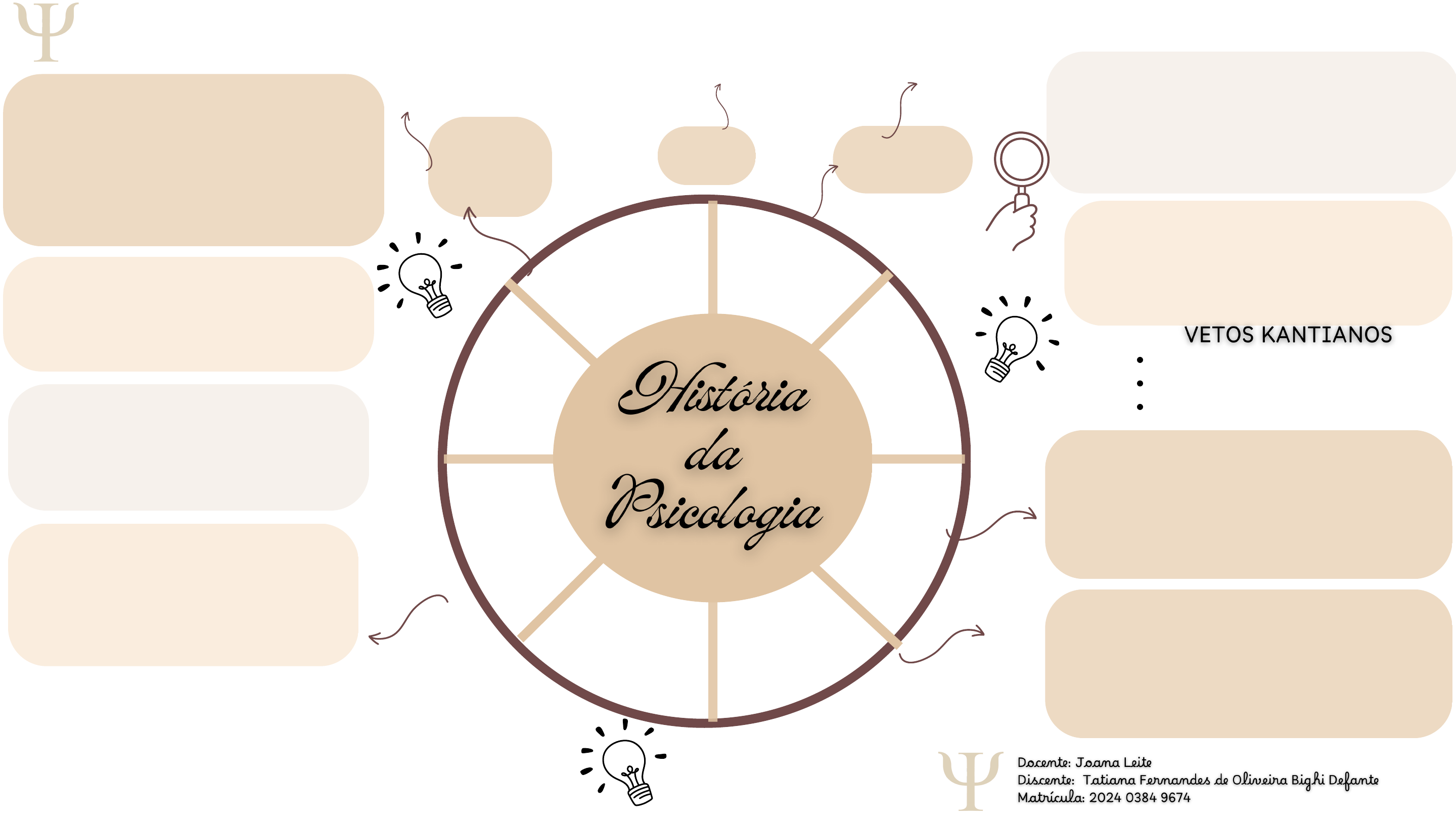 Sócrates AristótelesPlatão Para o filósofo, a alma humana tinha ligações com as partes do corpo e, portanto, três grandes partes: A cabeça, peito e arte inferior do ventre. PSICOFISIOLOGISTAS: ·Johannes Müller: Teoria das Energias Nervosas Específicas. (Sensação). ·Hermann Von Helmholtz: Introspecção experimental. ·Ernst Weber: Lei das Diferenças Apenas Percebidas (DAP). ·Gustav Fechner: Lei de Weber-Fecher(𝑆= K.logR) ·Matematização resolvida elos psicofisiologistas. ·Surgimento da Psicologia Experimental em 22 de outubro de 1850. Medicina na Grécia Antiga: Hipócrates (Quatro humores básicos: a bílis negra, a bílis amarela, o sangue e a fleuma). ROMA ANTIGA E CRISTIANISMO PRIMITIVO: Santo Agostinho (discute como o homem é um “escravo da memória”). IDADE MEDIEVAL: São Tomás de Aquino (Responsável por operar uma conciliação entre as Escrituras Sagradas cristãs e a Filosofia grega Christian Wolff Ajudou a colocar a Psicologia como disciplina da filosofia, como Psicologia Empírica. E Psicologia Racional. Foi um dos principais filósofos da Grécia antiga. IDADE MODERNA: Racionalismo (Se posiciona epistemologicamente como uma abordagem que prioriza o conhecimento adquirido pelo sujeito através do intelecto)e o Empirismo (Se posiciona epistemologicamente como uma abordagem que prioriza a obtenção do conhecimento sensível pela experiência). Estabelece que não apenas os humanos têm alma, mas todos os seres vivos. Racionalistas: René Descartes (podia duvidar de tudo, menos de que duvidava e que, portanto, pensava). Baruch Spinoza: (Conhecimento Sensível e Conhecimento obtido pela razão). Empiristas: John Locke: (a mente humana se constituía de elementos básicos que seriam as ideias, e estas, por sua vez, seriam formadas através da experiência humana./ tabula rasa). David Hume (associacionista, queria formalizar leis que explicassem como as sensações se associavam). Immanuel Kant: Diz que a Psicologia Racional não poderia virar ciência, pois seu objeto de estudo é a alma. No entanto, a Psicologia Empírica tinha possibilidade de se tornar ciência. D e s c o b r i r u m o b j e t o E s t u d a r o O b j e t o M a t e m a t i z a r o O b j e t o · W I L H E L M W U N D T : c r i o u e d i r i g i u o p r i m e i r o L a b o r a t ó r i o d e P s i c o l o g i a E x p e r i m e n t a l , s e d i a d o n a U n i v e r s i d a d e d e L e i p z i g , n a A l e m a n h a , e m 1 8 7 9 . · E d w a r d T i t c h e n e r : D i s c í p u l o d W u n d t , s e t o r n o u u m d o s m a i s i m p o r t a n t e s d i v u l g a d o r e s d a n o v a c i ê n c i a p s i c o l ó g i c a e x p e r i m e n t a l n a A m é r i c a