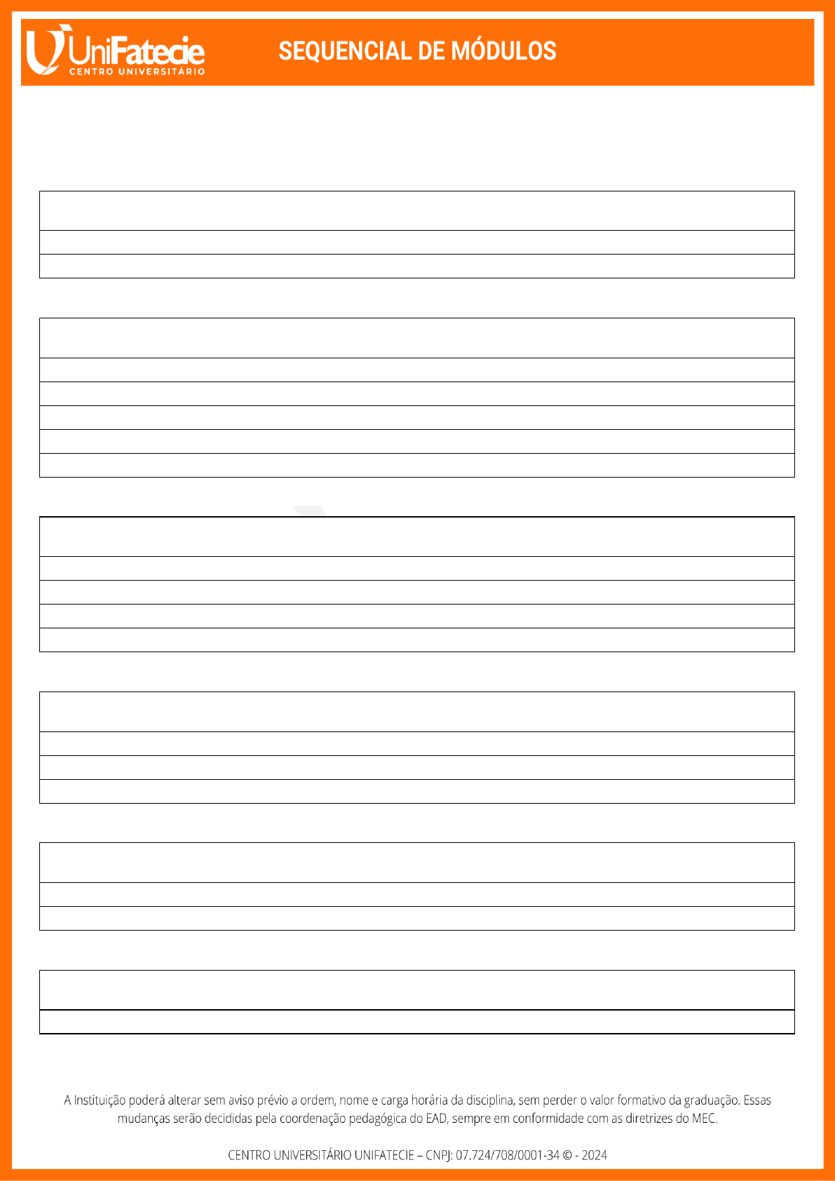 GESTÃO AMBIENTAL Alunos Ingressantes 2025/1 (01/12/2024 - 28/02/2025) 2025-1 INTRODUÇÃO AO CURSO DE GESTÃO AMBIENTAL FUNDAMENTOS DA GESTÃO AMBIENTAL 2025-2 PROJETO INTEGRADOR I BOTÂNICA FUNDAMENTOS DA ADMINISTRAÇÃO EMPREENDEDORISMO PLANEJAMENTO URBANO E MEIO AMBIENTE 2025-3 ACE - SUSTENTABILIDADE COMUNICAÇÃO E EXPRESSÃO SAÚDE E SANEAMENTO AMBIENTAL TOPOGRAFIA E GEORREFERENCIAMENTO 2025-4 EDUCAÇÃO AMBIENTAL ECOLOGIA GERAL DIREITO AMBIENTAL 2026-1 LICENCIAMENTO AMBIENTAL GERENCIAMENTO DE RECURSOS NATURAIS 2026-2 PROJETO INTEGRADOR II GESTÃO AMBIENTAL Alunos Ingressantes 2025/1 (01/12/2024 - 28/02/2025) ACE - INCLUSÃO AVALIAÇÃO INTEGRADA I - GESTÃO AMBIENTAL MARKETING AMBIENTAL GESTÃO DE PROJETOS