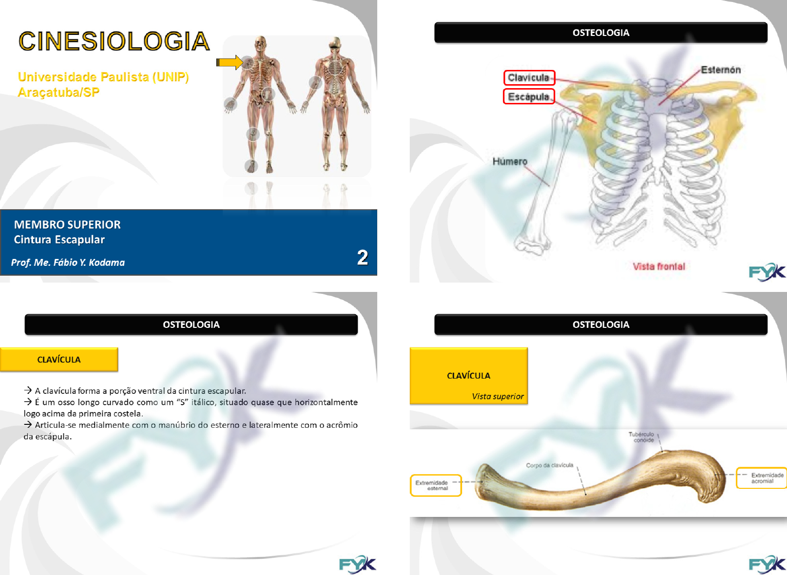 OSTEOLOGIA CINESIOLOGIA Universidade Paulista (UNIP) Araçatuba/SP Escápula Humero MEMBRO SUPERIOR Cintura Escapular 2 Prof. Me. Fábio Y. Kodama Vista frontal OSTEOLOGIA OSTEOLOGIA CLAVÍCULA CLAVÍCULA A clavícula forma a porção ventral da cintura escapular. Vista superior É um osso longo curvado como um "S" itálico, situado quase que horizontalmente logo acima da primeira costela. Articula-se medialmente com o manúbrio do esterno e lateralmente com o acrômio Tuberculo da escápula. Corpo da Extremidade acromial Extremidade esternal FYK FYKOSTEOLOGIA OSTEOLOGIA ESCÁPULA CLAVÍCULA É um osso achatado bem fino podendo ser translúcido em certos pontos. Vista inferior Forma a parte dorsal da cintura escapular. Tem a forma triangular Face articular Corpo da acromial Extremidade esternal Extremidade acromial Face articular esternal Forame nutrício Linha trapezóide Impressão do ligamento costoclavicular Sulco do subclávio FYK OSTEOLOGIA OSTEOLOGIA Proc. coracóide Incisura da Incisura da Acrômio Margem superior ESCÁPULA Ângulo superior Face articular ESCÁPULA Proc. coracóide Ângulo superior clavicular Fossa Vista anterior Margem superior Vista posterior supra-espinal Fossa Acrômio Espinha da escápula subescapular Ângulo Face lateral costal Ângulo Cavidade do acrômio glenoidal Cavidade Margem Colo da medial escápula lateral Margem Tubérculo medial infraglenoidal Margem lateral Colo da escápula Fossa infra-espinal Margem lateral FYK inferior FYK inferiorOSTEOLOGIA MOVIMENTOS Acrômio supraglenoidal ELEVAÇÃO DEPRESSÃO ESCÁPULA Proc. coracóide Movimento da escápula na direção superior. Movimento da escápula na direção inferior. Vista lateral Cavidade glenoidal infraglenoidal Face posterior Face costal Margem lateral FYK FYK MOVIMENTOS MOVIMENTOS PROTRAÇÃO RETRAÇÃO (ADUÇÃO) ROTAÇÃO PARA CIMA ROTAÇÃO PARA BAIXO Movimento da escápula de afastar-se lateralmente Movimento da escápula de avançar medialmente Afastamento do ângulo inferior da escápula, o ângulo inferior da escápula, medial e da coluna vertebral em direção à coluna vertebral superior e lateralmente em relação a coluna inferiormente em direção a coluna vertebral. vertebral. FYK FYKARTROLOGIA ARTROLOGIA AC Joint Observações Clavicle Os movimentos da cintura escapular podem ser descritos como movimentos da escápula. Ao analisar os movimentos da cintura escapular, é importante perceber que a Scapula escápula se move na caixa torácica porque o movimento articular, na verdade, ocorre na articulação esternoclavicular e, em menor amplitude, na articulação acromioclavicular. Esternoclavicular Scap Articulação acromioclavicular "Escapulotorácica" Acrômio Umero Sulco bicipital Lábio Escápulo FYK Acromioclavicular FYK ARTROLOGIA ARTROLOGIA 1. ARTICULAÇÃO ESTERNOCLAVICULAR 1. ARTICULAÇÃO ESTERNOCLAVICULAR A) Estrutura C) Ligamentos Formada pelo manúbrio do esterno e a extremidade esternal da clavícula Ligamento B) Ligamentos Esternoclavicular Ligamento Ligamento Esternoclavicular (Anterior e Posterior) Ligamento anterior Interclavicular Ligamentos Interclavicular e Costoclavicular Costoclavicular Disco articular ulo Disco articular rtilagens Sinco stais stais Man Articulação sinovial FYK Articulação sinovial FYKARTROLOGIA ARTROLOGIA 1. ARTICULAÇÃO ESTERNOCLAVICULAR 2. ARTICULAÇÃO ACROMIOCLAVICULAR C) Classificação A) Estrutura Classificada como articulação diartrodial plana. Formada pelo acrômio da escápula e pela extremidade acromial da clavícula. B) Ligamentos D) Amplitude de Movimento (ADM) Ligamento acromioclaviculares (superior e inferior) Ligamentos coracoclaviculares (trapezóide e conóide) Ligamento coracoacromial Articulação Movimento Amplitude Articulação Protração 15° acromioclavicular Acrômio Retração 15° Esternoclavicular Elevação Depressão Sulco bicipital Escápulo FYK ARTROLOGIA ARTROLOGIA 2. ARTICULAÇÃO ACROMIOCLAVICULAR 2. ARTICULAÇÃO ACROMIOCLAVICULAR C) Ligamentos B) Classificação Ligamento Classificada como articulação diartrodial plana. acromioclavicular Ligamento superior D) Amplitude de Movimento (ADM) coracoacromial Ligamento trapezóide ula Articulação Movimento Amplitude Ligamento Protração - retração 20-30° conóide Acromioclavicular Elevação - depressão 20-30° Rot. p/ cima - rot. p/ baixo 20-30° Ligamentos coracoclaviculares FYK FYKARTROLOGIA ARTROLOGIA 3. ARTICULAÇÃO ESCAPULOTORÁCICA 3. ARTICULAÇÃO ESCAPULOTORÁCICA A) Estrutura C) Amplitude de Movimento (ADM) Não é uma articulação sinovial verdadeira, pois não possui características sinoviais regulares e seu movimento é totalmente dependente das articulações esternoclavicular e acromioclavicular. Articulação Movimento Amplitude B) Ligamentos Protração retração É suportada dinamicamente por músculos e não possui suporte ligamentar, já que não Escapulotorácica Rot. p/ cima - rot. p/ baixo possui características sinoviais. AC Joint Elevação - depressão Clavicle Scapula Scap thor FYK FYK MÚSCULOS MÚSCULOS ELEVAÇÃO (Fibras superiores e médias) ELEVAÇÃO DEPRESSÃO (Fibras inferiores) Fibras superiores Origem: Processos Origem: Base do Crânio, transversos de C1 a C4 Processos espinhosos de C7 e Elevação (fibras superiores e médias) todas as vértebras (T1-T12) Elevação Inserção: ângulo Fibras Inserção: Face superior da escápula posterior do terço RETRAÇÃO lateral da clavícula, (Fibras médias) borda superior da espinha da escápula, Rotação para cima espaço triangular na médias e inferiores) base da espinha escapular Depressão (fibras inferiores) FYK Fibras inferiores MÚSC. ROTAÇÃO P/ CIMA ELEVADOR DA TRAPÉZIO (Fibras médias e inferiores) ESCÁPULAMÚSCULOS MÚSCULOS Romboides menor ELEVAÇÃO Romboides mayor PROTRAÇÃO RETRAÇÃO ROT. P/ CIMA Origem: Processos espinhosos de ROT. P/ BAIXO C7 e T1-T5 Inserção: Borda Origem: medial da Elevação Inserção: Face Abdued Superfície d