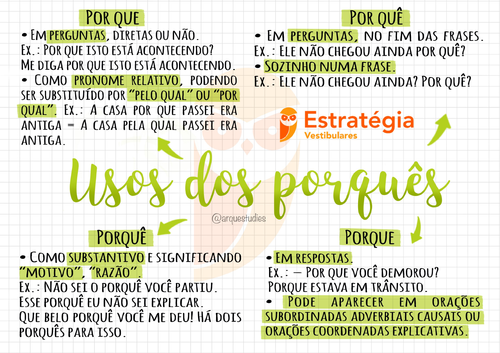 <p>POR QUE POR QUÊ EM PERGUNTAS, DIRETAS OU EM PERGUNTAS, NO FIM DAS FRASES. EX. : POR QUE ISTO ACONTECENDO? EX. : ELE NÃO CHEGOU AINDA POR QUÊ? ME DIGA POR QUE ISTO ACONTECENDO. SOZINHO NUMA FRASE. COMO PRONOME RELATIVO, PODENDO : ELE NÃO CHEGOU AINDA? POR QUÊ? SER SUBSTITUÍDO POR "PELO QUAL" OU "POR QUAL". : A CASA POR QUE PASSEI ERA ANTIGA = A CASA PELA QUAL PASSEI ERA Estratégia Vestibulares ANTIGA. Usos dos porques @arquestudies PORQUÊ PORQUE COMO SUBSTANTIVO E SIGNIFICANDO EM RESPOSTAS. "MOTIVO", - POR QUE VOCÊ DEMOROU? EX. NÃO SEI 0 VOCÊ PARTIU. PORQUE ESTAVA EM ESSE PORQUÊ EU NÃO SEI PODE AP ARECER EM ORAÇÕES QUE BELO PORQUÊ VOCÊ ME DEU! DOIS SUBORDINADAS ADVERBIAIS CAUSAIS OU PARA ISSO. ORAÇÕES COORDENADAS EXPLICATIVAS.</p>