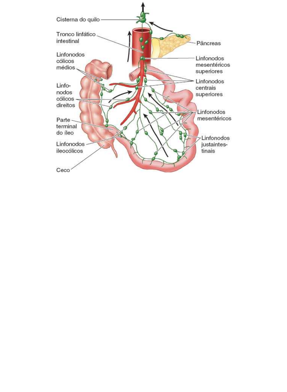 Anatomia Orientada Para Clinica, 8ª Edição file:///C/Users/Carlos Agnelo/Desktop/Passei Direto_ Anatomia Orientada para Clínica, 8ª edição_files/chapter05.html[13/08/2019 20:06:58] • • • • Figura 5.50 Linfonodos mesentéricos. Os linfonodos mesentéricos superiores formam um sistema no qual os linfonodos centrais, na raiz da artéria mesentérica superior, recebem linfa dos linfonodos mesentéricos, ileocólicos, cólicos direitos e cólicos médios, que, por sua vez, recebem linfa dos linfonodos justaintestinais. Os linfonodos justaintestinais adjacentes ao intestino são mais abundantes. Há menos linfonodos ao longo das artérias. Intestino grosso O intestino grosso é o local de absorção da água dos resíduos indigeríveis do quimo líquido, convertendo-o em fezes semissólidas, que são temporariamente armazenadas e acumuladas até que haja defecação. O intestino grosso é formado pelo ceco; apêndice vermiforme; partes ascendente, transversa, descendente e sigmoide do colo; reto e canal anal (Figura 5.52). O intestino grosso pode ser distinguido do intestino delgado por: Apêndices omentais do colo: projeções pequenas, adiposas, semelhantes ao omento Tênias do colo: três faixas longitudinais distintas: (1) tênia mesocólica, à qual se fixam os mesocolos transverso e sigmoide; (2) tênia omental, à qual se fixam os apêndices omentais; e (3) tênia livre, à qual não estão fixados mesocolos nem apêndices omentais Saculações: dilatações da parede do colo entre as pregas semilunares Calibre (diâmetro interno) muito maior. As tênias do colo (faixas espessas de músculo liso que representam a maior parte da camada longitudinal) começam na base do apêndice vermiforme como a camada longitudinal espessa do apêndice vermiforme que se divide para formar três faixas. As tênias do colo seguem por todo o comprimento do intestino grosso, com alargamento abrupto e nova fusão na junção retossigmoide, formando uma camada longitudinal contínua ao redor do reto. Como sua contração tônica encurta a parte da parede associada, o colo adquire uma aparência sacular ou “de bolsas” entre as pregas semilunares, formando as saculações. CECO E APÊNDICE VERMIFORME O ceco é a primeira parte do intestino grosso; é contínuo com o colo ascendente. É uma bolsa intestinal cega, que mede aproximadamente 7,5 cm de comprimento e largura. Situa-se na fossa ilíaca do quadrante inferior direito do abdome, inferiormente à sua junção com a parte terminal do íleo (Figuras 5.52 e 5.53). Se for distendido por fezes ou gases, o ceco pode ser palpável através da parede anterolateral do abdome. Anatomia Orientada Para Clinica, 8ª Edição file:///C/Users/Carlos Agnelo/Desktop/Passei Direto_ Anatomia Orientada para Clínica, 8ª edição_files/chapter05.html[13/08/2019 20:06:58] O ceco geralmente está situado a 2,5 cm do ligamento inguinal; é quase totalmente revestido por peritônio e pode ser levantado livremente. Entretanto, não tem mesentério. Em vista de sua relativa liberdade, pode ser deslocado da fossa ilíaca, mas costuma estar ligado à parede lateral do abdome por uma ou mais pregas cecais de peritônio (Figura 5.53B). A parte terminal do íleo entra no ceco obliquamente e invagina-se em parte para o seu interior. Na dissecção, o óstio ileal projeta-se no ceco entre os lábios ileocólico e ileocecal (superior e inferior), pregas que se encontram lateralmente e formam a crista denominada frênulo do óstio ileal (Figura 5.53A). Acreditava-se que quando o ceco fosse distendido ou quando se contraísse, ocorreria contração ativa do frênulo, que fecharia a válvula para evitar refluxo do ceco para o íleo. No entanto, a observação direta por endoscopia em pessoas vivas não confirma essa descrição. O músculo circular é mal desenvolvido ao redor do óstio; portanto, é improvável que a válvula tenha alguma ação esfincteriana que controle a passagem do conteúdo intestinal do íleo para o ceco. O óstio, porém, geralmente é fechado por contração tônica, apresentando- se como uma papila ileal no lado cecal (Figura 5.53B). A papila provavelmente atua como uma válvula unidirecional relativamente passiva, que impede o refluxo do ceco para o íleo quando houver contrações para impulsionar o conteúdo para o colo ascendente e colo transverso (Magee e Dalley, 1986). O apêndice vermiforme é um divertículo intestinal cego (6 a 10 cm de comprimento) que contém massas de tecido linfoide. Origina-se na face posteromedial do ceco, inferiormente à junção ileocecal. O apêndice vermiforme tem um mesentério triangular curto, o mesoapêndice, originado da face posterior do mesentério da parte terminal do íleo (Figura 5.52A). O mesoapêndice fixa-se ao ceco e à parte proximal do apêndice vermiforme. A posição do apêndice vermiforme é variável, mas geralmente é retrocecal (Figura 5.53C). As correlações clínicas associadas ao apêndice vermiforme são apresentadas no boxe Anatomia Clínica, mais adiante. A irrigação arterial do ceco é realizada pela artéria ileocólica, o ramo terminal da AMS (Figuras 5.54 e 5.55; Quadro 5.9). A artéria apendicular, um ramo da artéria ileocólica, irriga o apêndice vermiforme. A drenagem venosa do ceco e do apêndice vermiforme segue por uma tributária da VMS, a veia ileocólica (Figura 5.56A). Anatomia Orientada Para Clinica, 8ª Edição file:///C/Users/Carlos Agnelo/Desktop/Passei Direto_ Anatomia Orientada para Clínica, 8ª edição_files/chapter05.html[13/08/2019 20:06:58] Figura 5.51 Inervação extrínseca do intestino delgado. As fibras nervosas simpáticas pré-ganglionares originam-se dos segmentos T8 ou T9 até os segmentos T10 ou T11 da medula espinal e chegam ao plexo celíaco por intermédio dos troncos simpáticos e nervos esplâncnicos (abdominopélvicos) maior e menor. Após fazer sinapse nos gânglios celíacos e mesentéricos superiores, as fibras nervosas pós-ganglion