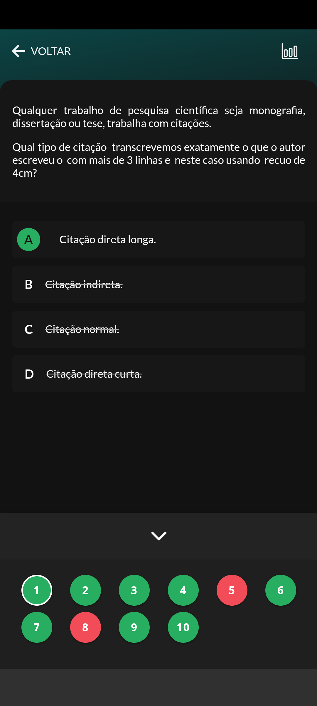 VOLTAR Qualquer trabalho de pesquisa científica seja monografia, dissertação ou tese, trabalha com citações. Qual tipo de citação transcrevemos exatamente que autor escreveu com mais de 3 linhas e neste caso usando recuo de 4cm? A Citação direta longa. B Citação indireta. Citação normal. D Citação direta curta. 1 2 3 4 5 6 7 8 9 10