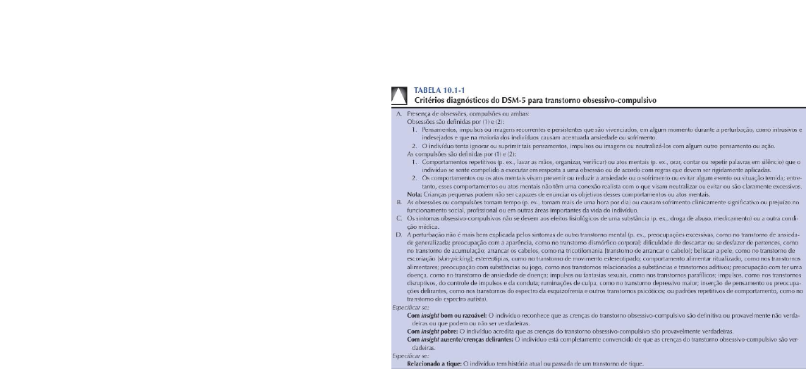 FATORES PSICOSSOCIAIS DIAGNÓSTICO Representado por um grupo diversos de sintomas que incluem pensamentos intrusivos, rituais, preocupações e compulsões. Essa obsessão e/ou compulsão recorrentes levam a um sofrimento grave. São consumidos tempo e interferem significativamente na rotina, funcionamento ocupacional, social e relacionamentos. - Obsessão: pensamento, sentimento ou ideia recorrente ou intrusiva, sendo um evento mental. - Compulsão: é um comportamento consciente, padronizado e recorrente, como contar, verificar a mesma coisa várias vezes. - Epidemiologia: homens e mulheres adultos são afetados igualmente, porém em adolescentes os meninos costumam ser mais afetados. Começa por volta dos 20 anos. Solteiros costumam ser mais afetados. - Comorbidade: geralmente são afetados por outros transtornos clínicos. A maioria terá transtorno depressivo associado e fobia social. Alguns terão abuso de álcool, TAG e transtorno de personalidade. - Sistema serotonérgico: pode ocorrer desregulação da serotonina nos sintomas de obsessão e compulsão. - Sistema noradrenérgico: não há tantas evidências de que há envolvimento. - Neuroimunologia: pode haver uma ligação entre a infecção estreptocócica e o TOC, principalmente daqueles que desenvolveram febre reumática. - Genética: familiares que possuam TOC aumentam as chances de seus filhos ou parentes próximos de terem a patologia. As obsessões podem ser estímulos condicionados, associados a medo e a ansiedade por meio de processos condicionantes, replicando um sintoma a aquele evento. Já as compulsões são estabelecidas de maneira diferente, onde quando uma ação reduz a ansiedade associada a um pensamento obsessivo, uma pessoa desenvolvera estratégias para evitar a situação, fixando padrões. - Personalidade: o TOC difere do transtorno da personalidade obsessiva-compulsiva (associado a detalhes, perfeccionismo). - Psicodinâmicos: podem ser uteis para entender a adesão ao tratamento. Uma característica é se preocuparem muito com limpeza ou com agressividade. - Ambivalência: é uma característica importante das crianças saídas durante a fase anal-sádica do desenvolvimento, sentindo amor e ódio pelo mesmo objeto. - Pensamento mágico: a regressão revela modos iniciantes de pensamentos, muitas vezes impulsivos, ou seja, funções do ego são afetadas pela regressão. Por exemplo, as pessoas acham que mesmo sem fazer ações físicas, só pelo pensamento acreditam que será realizado. TRANSTORNO OBSESSIVO-COMPULSSIVO FATORES BIOLÓGICOS ETIOLOGIA FATORES COMPORTAMENTAIS EXAME DO ESTADO MENTAL - Manifestações clínicas: obsessões e compulsões são essenciais, algumas comuns são: limpeza, como “minhas mãos estão sujas” ou dúvidas, “será que desliguei o fogão”, acompanhada de ansiedade sobre tal pensamento. - Contaminação: padrão mais comum é obsessão de contaminação, lavagem ou evitar objetos contaminados. Os pacientes podem arrancar a pele das mãos ou não conseguir sair de casa. - Dúvida patológica: o segundo padrão mais comum é a obsessão, seguida da compulsão de verificação, sendo que essa obsessão pode implicar em algum perigo de violência. Múltiplas viagens para casa, sentir- se culpado que esqueceram algo. - Pensamentos intrusivos: podem ocorrer pensamentos intrusivos sem uma compulsão. Costumam ser pensamentos repetitivos de um ato agressivo ou sexual repreensível para o paciente. - Simetria: a necessidade de simetria ou precisão, pode levar a uma compulsão de lentidão, levando horas para comer ou fazer a barba. - Outros sintomas: obsessões religiosas e acúmulo compulsivo, puxar o cabelo e roer as unhas de maneira compulsiva, além da masturbação compulsiva. Podem apresentar sintomas depressivos e podem ter traços de transtorno de personalidade obsessiva-compulsivo. A maioria tem início súbito, como uma gestação, problema sexual ou morte de alguém próximo. Cerca de 1/3 tem transtorno depressivo maior. Podem ser resistentes aos tratamentos. Os fármacos (1° linha são os ISRS ou clomipramina) começam a fazer 100% do efeito costumam ser vistos após 4 a 6 semanas PADRÃO DOS SINTOMAS CURSO E PROGNÓSTICO TRATAMENTO DIAGNÓSTICO TRATAMENTO apesar de poderem ficar 8 a 16 semanas para termos esses efeitos. Além do uso de terapias para melhoria. - ISRS: doses de fluoxetina, como 80mg/dia. - Clomipramina: é a mais seletiva para recaptação de serotonina. Devemos aumentar a dose após 2 a 3 semanas do início do tratamento. - Terapia comportamental: a terapia é tão efetiva quanto a farmacoterapia. A terapia familiar pode auxiliar. - Terapias auxiliares: a estimulação cerebral profunda é feita com eletrodos e orientadas por RM. É normal termos ansiedade, juntamente com ela sintomas gerais, como: taquicardia, diarreia, insônia, suor. Na ansiedade patológica o paciente é afetado diariamente pelos sintomas, prejudicando o social, trabalho e as relações afetivas. Envolve o medo de situações sociais, incluindo aquelas envolvendo contato com estranhos. As pessoas temem se embaraçar com situações sociais. - Epidemiologia: mulheres são mais afetadas. Tende a começar no final da infância ou início da adolescência, costuma ser crônico. - Etiologia: as crianças podem ter traços caracterizado por um padrão consistente de inibição comportamental. ● Fatores neuroquímicos: podem ter uma teoria adrenérgica, que podem liberar mais norepinefrina e epinefrina central e perifericamente. ● Fatores genéticos: tem relação com história familiar. Combinação de psicoterapia com farmacoterapia, sendo os medicamentos mais usados: ISRS, clomipramina, benzodiazepínicos, venlafaxina e buspirona, nesta ordem (fluoxetina, paroxetina, sertralina, citalopram são a primeira escolha). A resposta aos medicamentos costuma ocorrer em 4 a 6 semanas, podendo levar até 16 semanas. A terapia comportamental pode ser tão efetiva quanto a farmacológic