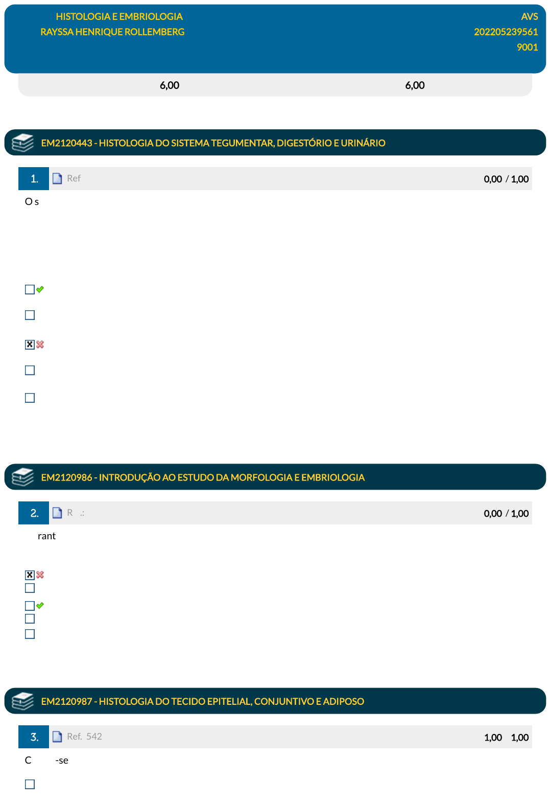 20/02/25, 16:18 EPS https://simulado.estacio.br/alunos/ 1/4 Disciplina: HISTOLOGIA E EMBRIOLOGIA AVS Aluno: RAYSSA HENRIQUE ROLLEMBERG 202205239561 Turma: 9001 DGT0943_AVS_202205239561 (AG) 27/03/2023 22:31:16 (F) Avaliação: 6,00 pts Nota SIA: 6,00 pts EM2120443 - HISTOLOGIA DO SISTEMA TEGUMENTAR, DIGESTÓRIO E URINÁRIO 1. Ref.: 5420293 Pontos: 0,00 / 1,00 O sistema digestório consiste no trato digestório, composto por: cavidade oral, esôfago, estômago, intestino delgado, intestino grosso, reto e anus. Temos ainda as glândulas associadas, as glândulas salivares, o fígado e o pâncreas. A principal função do sistema digestório é realizar o processo de digestão, que quebra as grandes moléculas em moléculas menores, transformando os alimentos em seus componentes básicos, que são absorvíveis pelo organismo. Sobre a histologia do sistema digestório analise as a�rmativas a seguir e marque a alternativa correta: A camada muscular é composta por células musculares lisas orientadas em espiral, composta de duas subcamadas. A camada mucosa é composta por tecido conjuntivo não modelado ricamente irrigado de vasos sanguíneos e linfáticos, além do plexo nervoso submucoso. A camada serosa, uma camada �na de tecido conjuntivo denso pobre em vasos sanguíneos e linfáticos, além de tecido adiposo. O revestimento da camada serosa é um epitélio pseudoestrati�cado queratinizado pavimentoso, denominado de mesotélio. A camada submucosa é composta por um revestimento epitelial, uma lâmina própria formanda de tecido conjuntivo frouxo rica em vasos sanguíneos e linfáticos e uma camada muscular. EM2120986 - INTRODUÇÃO AO ESTUDO DA MORFOLOGIA E EMBRIOLOGIA 2. Ref.: 5420213 Pontos: 0,00 / 1,00 Durante a quarta semana do desenvolvimento, uma parte da placa neural sobre alongamento convergente do neuroepitélio. Durante esse processo uma parte importante do sistema nervoso é formada. Que parte e essa? Tubo neural. Cérebro. Medula espinhal. Encéfalo. Placa neural. EM2120987 - HISTOLOGIA DO TECIDO EPITELIAL, CONJUNTIVO E ADIPOSO 3. Ref.: 5420193 Pontos: 1,00 / 1,00 Chama-se de endotélio o epitélio que reveste o lúmen do vaso sanguíneo. O endotélio é classi�cado como: Epitélio estrati�cado pavimentoso javascript:alert('C%C3%B3digo da quest%C3%A3o: 5420293.'); javascript:alert('C%C3%B3digo da quest%C3%A3o: 5420213.'); javascript:alert('C%C3%B3digo da quest%C3%A3o: 5420193.'); 20/02/25, 16:18 EPS https://simulado.estacio.br/alunos/ 2/4 Epitélio estrati�cado cúbico Epitélio estrati�cado de transição Epitélio simples pavimentoso Epitélio simples colunar 4. Ref.: 5420169 Pontos: 1,00 / 1,00 Além da sua função energética, o tecido adiposo unilocular também é um órgão secretor e sintetiza moléculas. A seguir são listadas algumas moléculas. Assinale a alternativa que indica de forma correta as substâncias secretadas pelo tecido adiposo unilocular. Leptina e lipase lipoproteica Insulina e leptina Norepinefrina e glucagon Termogenina e lipase lipoproteica Glucagon e insulina EM2120988 - HISTOLOGIA DO TECIDO CARTILAGINOSO, ÓSSEO E MUSCULAR 5. Ref.: 5420243 Pontos: 1,00 / 1,00 Os folhetos embrionários são conjuntos de células encontrados durante o desenvolvimento embrionário, que darão origem aos tecidos do nosso corpo. O tecido muscular tem origem a partir de qual folheto embrionário? Endoderma. Ectoderma. Epiderme. Hipoderma. Mesoderma. 6. Ref.: 5420146 Pontos: 1,00 / 1,00 Os ossos têm como funções sustentar o organismo, servir de alavancas movidas pelos músculos para os movimentos, proteger certas estruturas como o sistema nervoso central e servir de reservatório de íons de cálcio para o organismo. O osso cresce em comprimento e espessura, para mulheres o crescimento se completa aos 20 anos e para os homens, aos 23, sendo in�uenciado pelos hormônios produzidos pela hipó�se, tireoide e paratireoides. Sobre o tecido ósseo assinale a alternativa correta: Pode derivar-se embrionariamente da ectoderme, da mesoderme ou da endoderme e, com algumas exceções, é vascular. Tecido de origem mesodérmica, avascular; suas células, os condroblastos, produzem abundante material intercelular. Constituído de células alongadas, plurinucleadas, envolvidas por bainha de tecido conjuntivo; tem origem mesodérmica. Constituído de células arredondadas, com núcleo e grande parte do citoplasma restritos à periferia das mesmas pelo acúmulo de gordura. Tecido conjuntivo com matriz calci�cada composta por �bras orgânicas e sais inorgânicos; vascularizado. 7. Ref.: 5420144 Pontos: 1,00 / 1,00 javascript:alert('C%C3%B3digo da quest%C3%A3o: 5420169.'); javascript:alert('C%C3%B3digo da quest%C3%A3o: 5420243.'); javascript:alert('C%C3%B3digo da quest%C3%A3o: 5420146.'); javascript:alert('C%C3%B3digo da quest%C3%A3o: 5420144.'); 20/02/25, 16:18 EPS https://simulado.estacio.br/alunos/ 3/4 ''As pericondrites são infecções de evolução lenta, localizadas na cartilagem auricular. Resultam de lacerações, contusões, cirurgias e outras afecções. A pericondrite do pavilhão auricular induzida por piercing é uma afecção frequente entre jovens. O agente etiológico mais encontrado é a Pseudomonas aeruginosa e sua inoculação decorre da exposição do pericôndrio e cartilagens do pavilhão, durante ou após procedimento'' (PENA, F.M. et al. Pericondrite auricular por piercing complicada com infecção por Pseudomonas. Rev. Bras. Otorrinolaringol. 2006;72(5):717). Sabe-se que os componentes do tecido cartilaginoso - células e matriz extracelular - são envolvidos pelo pericôndrio. Sobre o pericôndrio, analise as a�rmativas a seguir: I. As células do pericôndrio são capazes de se multiplicar e dar origem aos condroblastos. II. É responsável pela nutrição, oxigenação e eliminação dos resíduos do metabolismo da cartilagem e é rico em �bras de colágeno do tipo I na parte mais super�cial. III. Está presente na cartilagem hi