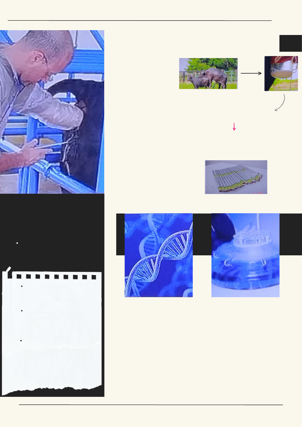 Maior aproveitamento dos reprodutores: -Com a inseminação artificial, é possível aproveitar os melhores reprodutores, mesmo que estejam distantes geograficamente. Isso significa que animais de elite, com características genéticas desejáveis, podem ser usados para reprodução em diferentes partes do mundo, maximizando seu potencial de contribuição para a próxima geração. -Potencializa o potencial genético do animal utilizando seu sêmen VANTAGENS -Melhoramento genético -Cruzamento entre raças -Reduz custos com touros O sêmen pode ser congelado e armazenado por períodos prolongados, muitas vezes por anos, sem comprometer sua viabilidade. Isso permite que o material genético de reprodutores valiosos seja preservado e utilizado em inseminações futuras, mesmo que o reprodutor não esteja mais disponível ou tenha falecido. Fichas individuais são registros que contêm informações essenciais sobre cada animal, incluindo identificação, histórico de saúde, reprodução, desempenho zootécnico e manejo. Esses registros são fundamentais para o controle zootécnico INSEMINAÇAO ARTIFICIAL Deposição mecânica do sêmen no sistema genital feminino Transporte e estocagem por tempo indeterminado Thalita P.B. - resumo 2 biotecnicas (IA) Objetivo da inseminação artificial: E o melhoramento genético, aumentar os lucros Inseminação: é a deposição mecânica do sêmen para conservação do sêmen para fim de inseminar a fêmea no cio Inseminação convencional: insemina o animal que teve o cio natural. É muito utilizada em animais leiteiros. Para sincronizar os animais é preciso usar hormônios. Para induzir o cio da vaca é possível usar Prostaglandina VANTANGENS DA ( IA ) Volume do ejaculado = 10 ml + Diluente = 90 ml 100ml/ 0,25 ml (volume de envase=palhetas) = 400 DOSES Controle e sanitário e reprodutor Controle zootécnico fichas individuais- datas IA e parto -Teste de doenças: E fundamental realizar testes para garantir que ele esteja livre de doenças infecciosas que possam ser transmitidas através do sêmen. -Manutenção da qualidade do sêmen: Para garantir a eficácia da inseminação Limitações da Inseminação Artificial (IA) 1. Mão-de-obra Especializada: Requer profissionais treinados para realizar a IA corretamente. Detecção do Cio: Identificar o momento correto do ciclo estral é crucial e pode ser desafiador, exigindo conhecimento e observação cuidadosa.. 2. Disseminação de Características Indesejáveis e Doenças: Risco de propagação rápida de genes desfavoráveis e doenças genéticas. 3. Aquisição de Nitrogênio Líquido: Necessidade contínua e cara de nitrogênio líquido para armazenar sêmen congelado. LIMITAÇÕES DA IA Thalita P.B. - resumo 2 biotecnicas (IA) CONDIÇÕES NECESSÁRIAS PARA IA Infra-estrutura 1. **Pastagens e/ou Capineiras de Boa Qualidade** - Prover alimentação adequada e de alta qualidade para garantir a saúde e a fertilidade dos animais. 2. **Local Sombreado** - Oferecer sombra para proteger os animais do estresse térmico, o que pode afetar a eficácia da IA. 3. **Tronco de Contenção** - Dispor de um tronco de contenção para imobilizar o animal de forma segura durante o procedimento, garantindo a segurança do animal e do inseminador. 4. **Segurança para Animal e Inseminador** - Assegurar um ambiente seguro para prevenir acidentes e facilitar o trabalho do inseminador. 5. **Local para Guardar Materiais** - Ter um espaço apropriado para armazenar os equipamentos e materiais necessários para a IA, mantendo-os organizados e em boas condições de uso. II - Animais Melhoradores1. Utilizar animais geneticamente superiores para melhorar a qualidade do rebanho e os resultados da IA. Bom Manejo Sanitário, Nutricional e Ambiental2. Garantir práticas adequadas de manejo sanitário para prevenir doenças. Fornecer uma nutrição balanceada e de alta qualidade para manter a saúde e a fertilidade dos animais. Assegurar um ambiente adequado, reduzindo o estresse e melhorando o bem-estar geral dos animais. III - Inseminador Noções sobre Manejo do Sêmen e Materiais1. Ter conhecimento sobre como manipular e preparar o sêmen e os materiais utilizados na IA. Boas Práticas de Higiene2. Manter rigorosas práticas de higiene para evitar contaminação e garantir o sucesso do procedimento. Honesto com as Dificuldades3. Ser transparente sobre possíveis dificuldades e limitações, buscando sempre a melhor solução para cada situação. Medir Sempre Nível do Nitrogênio4. Monitorar constantemente o nível de nitrogênio líquido para garantir a viabilidade do sêmen armazenado. Zelar pelo Material5. Cuidar e manter os equipamentos e materiais em boas condições, assegurando sua durabilidade e eficácia. IV - Sêmen 1.Verificar sua Procedência Garantir que o sêmen utilizado seja de alta qualidade e proveniente de fontes confiáveis. 2.Identificação Correta na Palheta Certificar-se de que cada palheta de sêmen esteja devidamente identificada para evitar confusões durante o processo de inseminação. 3.Manuseio Adequado das Doses Manipular as doses de sêmen com cuidado, mantendo- as sempre abaixo da boca do botijão para evitar a exposição a temperaturas mais elevadas. 4;Nunca Expor Palhetas à Temperatura Ambiente Evitar deixar as palhetas de sêmen expostas à temperatura ambiente, pois isso pode comprometer a viabilidade dos espermatozoides. CIO OU ESTRO Thalita P.B. - resumo 2 biotecnicas (IA)O cio, também conhecido como estro, é o período do ciclo estral em que uma fêmea está receptiva à monta pelo macho e é mais fértil. Durante o cio, há várias mudanças físicas e comportamentais que podem ser observadas, incluindo: Muco Cristalino na Vulva: A presença de muco claro e elástico na vulva da fêmea é um sinal de que ela está no cio. Esse muco facilita a passagem dos espermatozoides para o trato reprodutivo. 1. Vulva Edemaciada: A vulva da fêmea pode estar edemaciada, ou seja, inchada 