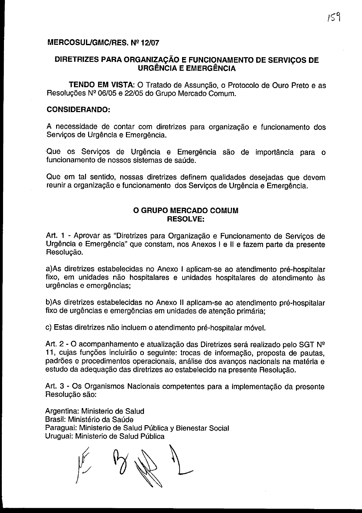 159 N° 12/07 DIRETRIZES PARA ORGANIZAÇÃO E FUNCIONAMENTO DE SERVIÇOS DE URGÊNCIA E EMERGÊNCIA TENDO EM VISTA: O Tratado de Assunção, o Protocolo de Ouro Preto e as Resoluções N° 06/05 e 22/05 do Grupo Mercado Comum. CONSIDERANDO: A necessidade de contar com diretrizes para organização e funcionamento dos Serviços de Urgência e Emergência. Que os Serviços de Urgência e Emergência são de importância para o funcionamento de nossos sistemas de saúde. Que em tal sentido, nossas diretrizes definem qualidades desejadas que devem reunir a organização e funcionamento dos Serviços de Urgência e Emergência. o GRUPO MERCADO COMUM RESOLVE: Art. 1 - Aprovar as "Diretrizes para Organização e Funcionamento de Serviços de Urgência e Emergência" que constam, nos Anexos I e e fazem parte da presente Resolução. a)As diretrizes estabelecidas no Anexo I aplicam-se ao atendimento pré-hospitalar fixo, em unidades não hospitalares e unidades hospitalares de atendimento às urgências e emergências; b)As diretrizes estabelecidas no Anexo II aplicam-se ao atendimento pré-hospitalar fixo de urgências e emergências em unidades de atenção primária; c) Estas diretrizes não incluem o atendimento pré-hospitalar móvel. Art. 2 - O acompanhamento e atualização das Diretrizes será realizado pelo SGT N° 11, cujas funções incluirão o seguinte: trocas de informação, proposta de pautas, padrões e procedimentos operacionais, análise dos avanços nacionais na matéria e estudo da adequação das diretrizes ao estabelecido na presente Resolução. Art. 3 - Os Organismos Nacionais competentes para a implementação da presente Resolução são: Argentina: Ministerio de Salud Brasil: Ministério da Saúde Paraguai: Ministerio de Salud Pública y Bienestar Social Uruguai: Ministerio de Salud Pública160 Art. 4 - Esta Resolução não necessita ser incorporada ao ordenamento jurídico dos Estados Partes. LXVIII GMC- Assunção, 21/VI/07 2161 ANEXO I DIRETRIZES PARA ORGANIZAÇÃO E FUNCIONAMENTO DE SERVIÇOS DE URGÊNCIA E EMERGÊNCIA 1. OBJETIVO Estabelecer diretrizes para organização e funcionamento de Serviços de Urgência e Emergência. 2. DEFINIÇÃO 2.1 Emergência: constatação médica de condições de agravo à saúde que impliquem em risco iminente de morte ou sofrimento intenso, exigindo, portanto, tratamento médico imediato. 2.2 Diretrizes: conjunto de instruções ou pautas para orientar ações que qualifiquem os serviços de saúde. 2.3 Urgência: ocorrência imprevista de agravo à saúde com ou sem risco potencial à vida, cujo portador necessita de assistência médica imediata. 3. REQUISITOS 3.1 O Serviço de Urgência e Emergência fixo pode funcionar como um serviço de saúde independente ou inserido em estabelecimento com internação e maior capacidade de resolução. 3.1.1 Serviço de Urgência e Emergência devem estar organizados e estruturado considerando a rede de atenção à saúde existente. 3.2 Todo Serviço de Urgência e Emergência, público ou privado, deve possuir ou estar inserido em um serviço de saúde que possua organização ou licença de funcionamento, atualizada periodicamente, expedida pelo órgão sanitário competente, de acordo com a normativa de cada Estado Parte. 3.3 A construção, reforma ou adaptação na estrutura física do Serviço de Urgência e Emergência deve ser precedida de análise e aprovação do projeto junto ao órgão competente, assim como verificação da execução das obras conforme aprovado. 3.4 É de responsabilidade da administração do serviço de saúde prever e prover os recursos humanos, equipamentos, materiais e medicamentos necessários à operacionalização dos Serviços de Urgência e Emergência. 3.5 A direção e o responsável técnico do Serviço de Urgência e Emergência têm a responsabilidade de planejar, implementar e garantir a qualidade dos processos. 3.6 O Serviço de Urgência e Emergência deve dispor de instruções escritas e atualizadas das rotinas técnicas implantadas. 3162 3.7 As rotinas técnicas devem ser elaboradas em conjunto com as áreas envolvidas na assistência ao paciente, assegurando a assistência integral e a interdisciplinaridade. 3.8 O Serviço de Urgência e Emergência deve: 3.8.1 possuir estrutura organizacional documentada; 3.8.2 preservar a identidade e a privacidade do paciente, assegurando um ambiente de respeito e dignidade; 3.8.3 promover ambiência acolhedora; 3.8.4 incentivar e promover a participação da família na atenção ao paciente; 3.8.5 fornecer orientações ao paciente e aos familiares em linguagem clara, sobre o estado de saúde e a assistência a ser prestada, desde a admissão até a alta. 4. RECURSOS HUMANOS 4.1 Todo Serviço de Urgência e Emergência deve dispor dos seguintes profissionais de saúde: 4.1.1 Um Responsável Técnico com formação médica, legalmente habilitado. 4.1.1.1 médico responsável técnico pode assumir a responsabilidade por 01 (um) Serviço de Urgência e Emergência; 4.1.1.2 Em caso de ausência do responsável técnico, o serviço deve contar com um profissional legalmente habilitado para substituí-lo; 4.1.1.3 O médico responsável técnico deve estar capacitado em administração em saúde; 4.1.1.4 No caso do médico responsável técnico não possuir esta capacitação, ele deve contar com suporte de uma equipe do serviço de saúde que seja capacitada em administração em saúde. 4.1.1.5 No Serviço de Urgência e Emergência hospitalar, o responsável técnico deve possuir título de especialista em sua área de atuação profissional. 4.1.2 Todo Serviço de Urgência e Emergência deve dispor de equipe médica em quantitativo suficiente para atendimento 24 horas das situações de urgências e emergências e todas as atividades dele decorrentes. 4.1.2.1 O serviço deve contar, com clínico geral, pediatra, cirurgião geral e ginecologista-obstetra, capacitados para atendimento às urgência