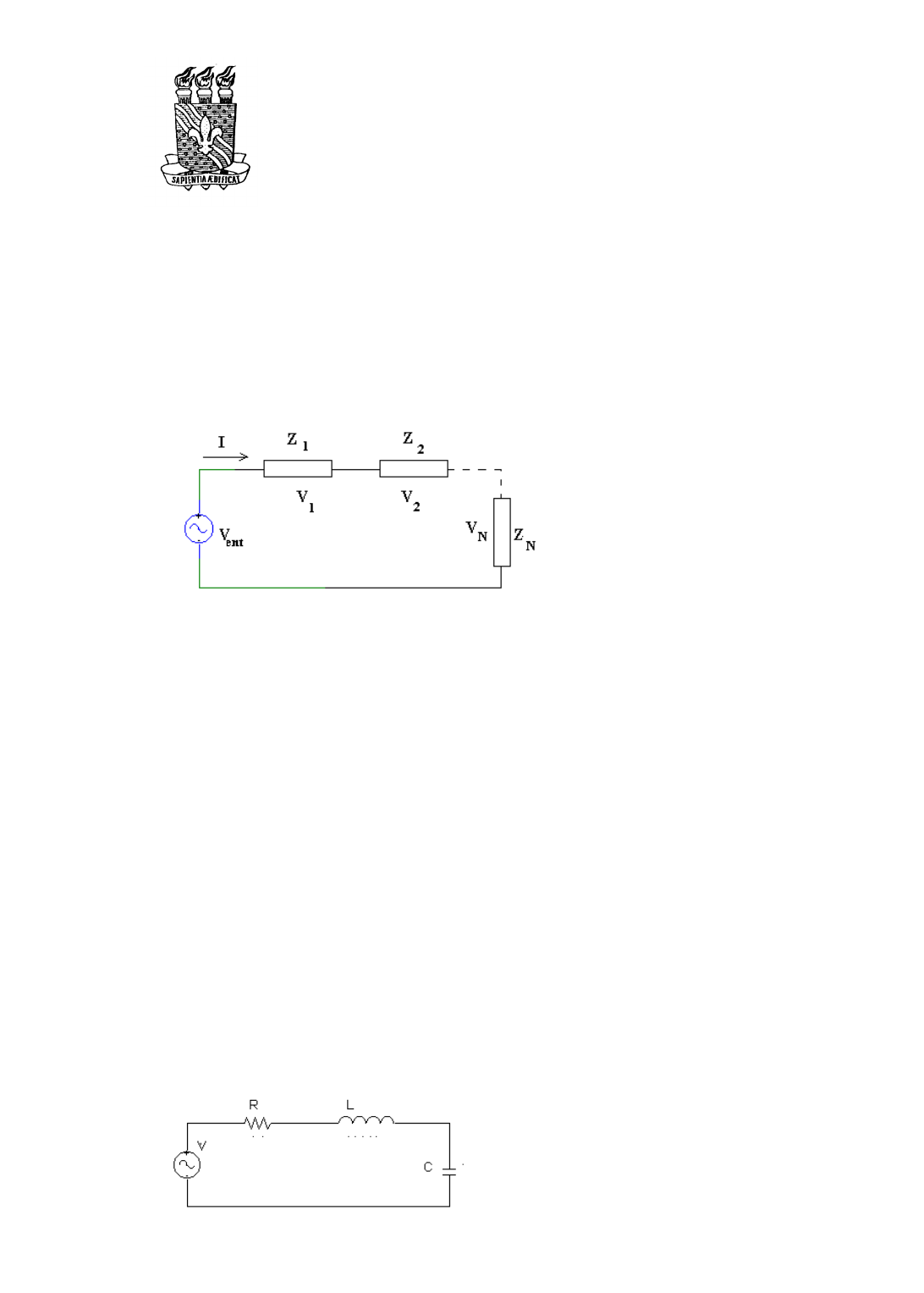 1 • CIRCUITO SÉRIE/PARALELO Prof. Antonio Sergio-D.E.E-CEAR-UFPB. Os circuito reativos são classificados, assim como os resistivos, em a) Circuitos série. b) Circuitos paralelo c) Circuito série-paralelo. Em qualquer caso acima, vale tanto as Leis de Kirchhoff nos circuitos resistivos quanto nos reativos, só que no domínio dos números complexos. Seja um circuito série composto de duas ou mais impedâncias complexas como mostrado na figura abaixo. Fig. 1 - Circuito reativo série Como se sabe, num circuito série a corrente que circula por um elemento é a mesma que circula pelos demais. A corrente ao circular por uma impedância provoca nele uma queda de voltagem representada por V1, V2 e VN, aonde tem-se: V1 = I.Z1 V2 = I.Z2 e .... VN = I.ZN (1) Fasorialmente falando, tem-se para a lei das malhas: Vent = V1 +V2 + ...VN (2) Em outras palavras, a soma do fasores de tensão do circuito é igual ao fasor de tensão de entrada. Por outro lado, a impedância equivalente do circuito é a soma das impedâncias presentes no mesmo. Assim ZT=Z1 + Z2 + ...+ZN (3) Exemplo 1: Circuito RLC série. Fig. 2 – Circuito RLC série 1 • CIRCUITO SÉRIE/PARALELO Prof. Antonio Sergio-D.E.E-CEAR-UFPB. Os circuito reativos são classificados, assim como os resistivos, em a) Circuitos série. b) Circuitos paralelo c) Circuito série-paralelo. Em qualquer caso acima, vale tanto as Leis de Kirchhoff nos circuitos resistivos quanto nos reativos, só que no domínio dos números complexos. Seja um circuito série composto de duas ou mais impedâncias complexas como mostrado na figura abaixo. Fig. 1 - Circuito reativo série Como se sabe, num circuito série a corrente que circula por um elemento é a mesma que circula pelos demais. A corrente ao circular por uma impedância provoca nele uma queda de voltagem representada por V1, V2 e VN, aonde tem-se: V1 = I.Z1 V2 = I.Z2 e .... VN = I.ZN (1) Fasorialmente falando, tem-se para a lei das malhas: Vent = V1 +V2 + ...VN (2) Em outras palavras, a soma do fasores de tensão do circuito é igual ao fasor de tensão de entrada. Por outro lado, a impedância equivalente do circuito é a soma das impedâncias presentes no mesmo. Assim ZT=Z1 + Z2 + ...+ZN (3) Exemplo 1: Circuito RLC série. Fig. 2 – Circuito RLC série - -> - > = EZi -> - - - - - - - XL XC 2 Num circuito RLC série a impedância é dada por Z= (4) A equação acima nos leva a pensar que um circuito RLC tem três comportamentos aparentes: a) Indutivo: Quando a reatância indutiva prevalece sobre a capacitiva, isto é, (5.1) Desta forma, a parte imaginária da impedância é positiva e o circuito fica aparentemente indutivo. A corrente que circula pelo circuito fica atrasada em relação à tensão de entrada. b) Capacitivo: Quando a reatância capacitiva prevalece sobre a indutiva , isto é, (5.2) Desta forma, a parte imaginária da impedância é negativa e o circuito fica aparentemente capacitivo. A corrente que circula pelo circuito fica adiantada em relação à tensão de entrada. c) Resistivo. Quando a reatância indutiva se iguala à capacitiva, isto é, (5.3) Desta forma, a parte imaginária da impedância se anula e o circuito fica aparentemente resistivo. A corrente que circula pelo circuito fica em fase em com a tensão de entrada. Fasorialmente, tem-se: Fig. 3 – Diagrama fasorial da tensão de entrada e da corrente no circuito RLC série De acordo com a Eq. (2.3), tem-se: Considerando que w = 2.p.f, tem-se finalmente: ÷ ø ö ç è æ w -w+= w -w+ C 1L.jR C 1jLjR C 1L w >w C 1L w +JxXc X * XeX i ↑ xiu w= 2i · 3 fo= (6) Exemplo 2: Considere o circuito abaixo: Onde V = 100Ð00. Determinar a impedância equivalente, a corrente que circula pelo circuito e as quedas de voltagem em casa um dos seus elementos. Solução: Zeq = 4 + j.3 – j.6 = 4 – j.3 = 5Ð-36,90 I = = 20Ð+36,90 LC..2 1 p o o 9,365 0100 -Ð Ð M = 1 LiTf[ = afl fo = R + i(X, - Xd fo - = 1 - & L -> R C um · -> -> = Zeq 4 Seja V1 a queda de voltagem no resistor; seja V2 a queda de voltagem no indutor e V3 a queda de voltagem no capacitor. V1 = 20Ð+36,90 x 4 = 80Ð+36,90 = 63,97 + j.48,03 V2 = 20Ð+36,90 x 3Ð900 = 60Ð+126,90 = -36,03 + j.47,98 V3 = 20Ð+36,90 x 6Ð-900 = 120Ð-53,10 = 72,05 - j.95,96 V1 + V2 + V3 = 99,99 + j.0,05 ≈ 100Ð0o Observa-se neste exemplo que a lei das malhas num circuito série é válida no domínio dos números complexos. Somando-se apenas os módulos das voltagens, tem-se: 80 + 60 + 120 = 260V, bem diferente de 100. No circuito abaixo, no entanto, temos um comportamento aparentemente resistivo. Toda a voltagem de entrada está no resistor. Exemplo 3 No circuito da Fig. 2 considere R = 100W , L = 0,01H e C = 3µF a) Determinar a frequência de ressonância fo. b) Determinar a impedância vista pela fonte de entrada com f = fo, f = 0,1fo e f = 10fo c) Repetir (b) para corrente que circula pelo circuito. 5 Solução. a) Usando os dados dos componentes na Eq. (6), tem-se para a frequência de ressonância: Hz b) A impedância indutiva é: XL = 2.p.f.L E a capacitiva é: Na frequência de ressonância, tem-se: XL = 6,2832x918,88x0,01 = 57,735 W XC = W Considerando, como foi dito acima, V1 = I.Z1 V2 = I.Z2 e .... VN = I.ZN, tem-se: Z = 100 + j0 Isto é, a impedância geral do circuito é um numero real. Nesta freqüência a impe- dância capacitiva de iguala em módulo à impedância indutiva. Só em módulo, por que em termos de impedância complexa, elas estão no eixo imaginário do plano complexo com sinais contrários. Nesta freqüência o circuito entra em ressonância. Para f = 0,1.fo = 91,9 Hz, tem-se: Z = 580,7Ð-800 Para f = 10.fo = 9,19 KHz, tem-se: Z = 580,7Ð+800 É interessante calcular a tensão em cada elemento do circuito na ressonância. Antes disso é preciso determinara corrente que circula pelo circuito. Esta corrente é dada por: = (7) Supondo-se que a tensão de entrada seja 10 VRMS e com ângulo supostamente zero, tem-se: 88,918 01,0x10x3.2832,6 1f 6o == - C.f.2 1XC