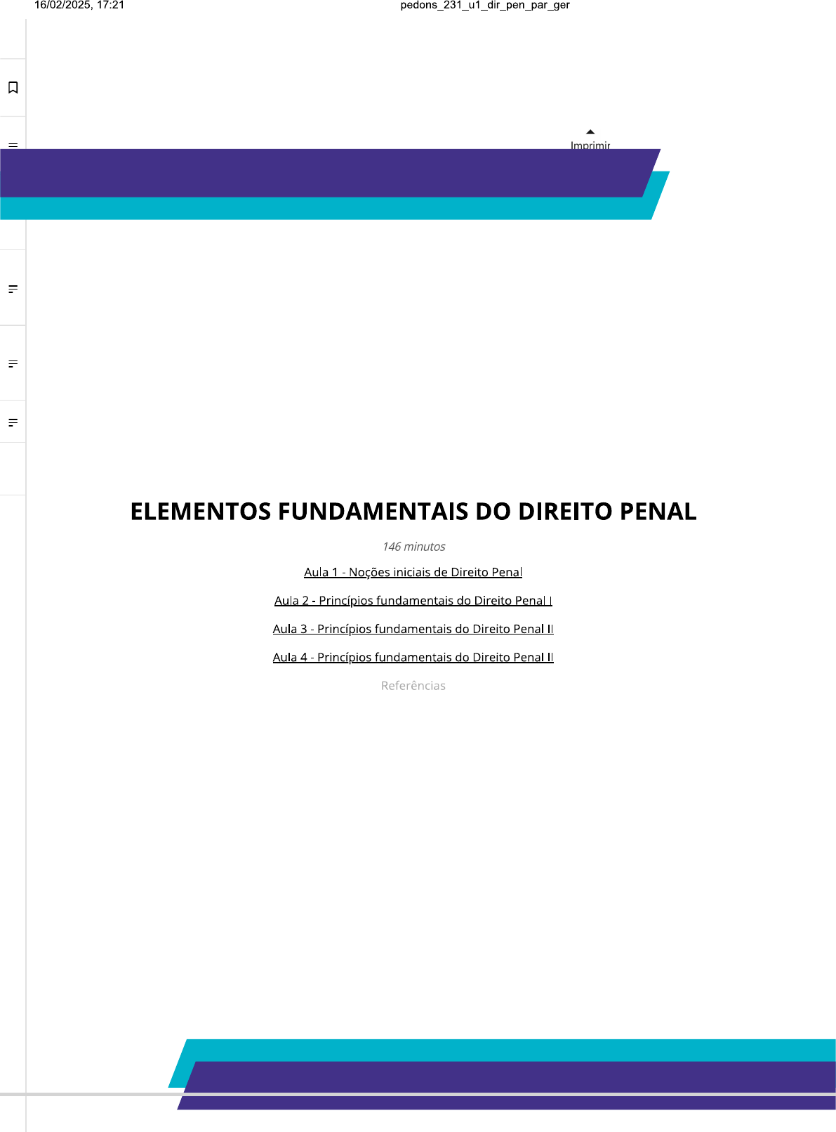 16/02/2025, 17:21 = Imprimir ELEMENTOS FUNDAMENTAIS DO DIREITO PENAL 146 minutos Aula 1 - Noções iniciais de Direito Penal Aula 2 - Princípios fundamentais do Direito Penal Aula 3 - Princípios fundamentais do Direito Penal Aula 4 - Princípios fundamentais do Direito Penal Referências16/02/2025, 17:21 Aula 1 NOÇÕES INICIAIS DE DIREITO PENAL = Nessa aula, vamos estudar o tema "Introdução ao Direito Penal". 36 minutos = INTRODUÇÃO AO DIREITO PENAL o que é a Introdução ao Direito Penal? Introdução ao Direito Penal, como o próprio nome diz são os primeiros passos para o estudo do Direito = Penal, o qual analisa os comportamentos humanos mais perniciosos à sociedade, capazes de gerar uma sanção, que tem por fim corrigir o erro cometido. Direito Penal tem a função de proteger os valores humanos, como a vida, a integridade física, a saúde, a liberdade etc, bem como de alertar sobre as condutas que são reprováveis à coletividade, e que se o indivíduo ao menos tentar praticá-las, será ele punido com sanções variáveis sendo a mais grave a restrição de liberdade em regime fechado. Além disso, o direito penal também apresenta um conjunto de valorações e princípios que orientam a própria aplicação e interpretação dessas normas, tendo em vista, que deve ser uma ciência jurídica equilibrada para que haja harmonia na aplicação dessas leis. Onde encontrar a "Introdução ao Direito Penal" no Código Penal? Decreto-Lei n° 2.848/1940 Mas onde podemos encontrar a "Introdução ao Direito Penal" no Código Penal? Confira a tabela a seguir! Dec-Lei n° 2.848/1940 (CÓDIGO PENAL) PARTE LIVRO TÍTULO CAPÍTULO ARTIGO Título Da Parte geral aplicação da lei penal E qual importância desse para16/02/2025. 17:21 pedons 231 u1 dir pen par_ger Para que você consiga completar seus estudos, sobre a Introdução ao Direito Penal é necessário que se atente para as regras do Código Penal, da Constituição Federal e leis federais. É um tema importante, pois é o pontapé inicial para o estudo do Direito Penal e as suas implicações na sociedade brasileira. 6d Onde estudar a "Introdução ao Direito Penal"? = Para te ajudar em seus estudos sobre esse tema, sugerimos que você leia as seguintes obras: CAPEZ, F. Curso de direito penal. 24. ed. São Paulo: Saraiva, 2020 BITENCOURT, C.R. Tratado de direito penal - parte geral. 26. ed. São Paulo: Saraiva, 2020 Vamos começar? Agora que já entendemos o tema em linhas gerais, que tal começarmos nossos estudos e compreendê-lo em mais detalhes? = Bons estudos! MAPA MENTAL INTRODUÇÃO AO DIREITO PENAL Olá! A seguir, apresentamos um mapa mental animado que resume o conceito de "Introdução ao Direito Penal" e será essencial nos seus estudos. Para visualizar o objeto, acesse seu material digital. Agora que você já viu a versão animada do mapa mental, que tal fazer download da versão estática do mapa? Essa versão resume para você, em uma imagem construída em formato de organograma, os principais conceitos do tema e como eles estão relacionados. Basta clicar aqui para fazer download do arquivo. CONCEITO DE DIREITO PENAL Olá! Ao final dessa leitura, esperamos que você seja capaz de: 1 - Definir o Direito Penal; 2 Explicar o que compreende o estudo do Direito Penal; 3 Interpretar o sentido do Direito Penal no contexto do Estado Democrático de Direito. Quer baixar a versão em PDF desse texto? Basta clicar aqui nesse link. Boa leitura!16/02/2025. 17:21 pedons 231 u1 dir pen_par_ger Vamos aprender um pouco sobre o conceito de Direito Penal? O Direito Penal é um ramo do Direito Público que dispõe sobre o poder punitivo do Estado, selecionando as condutas humanas indesejáveis, graves e reprováveis, capazes colocar em risco a vida em sociedade. Para essas condutas, ele prevê sanções específicas e proporcionais aos danos ocasionados. De acordo com = Fernando Capez (2020, = " O Direito Penal é o segmento do ordenamento jurídico que detém a função de selecionar os comportamentos humanos mais graves e perniciosos à coletividade, capazes de colocar em risco valores fundamentais para a convivência social, e descrevê-los como infrações = penais, cominando-lhes, em consequência, as respectivas sanções, além de estabelecer todas as regras complementares e gerais complementares e gerais necessárias à sua correta e justa aplicação. Representação de um crime de homicídio Fonte: "The Public Domain Review". Disponível em: https://the-public-domain-review.imgix.net/collections/the-newgate-calendar- 1795/newgate-thumb.jpg?w=640. Acesso em: out. 2020. o QUE É o DIREITO PENAL? Vamos conhecer o Direito Penal no ordenamento jurídico brasileiro?16/02/2025. 17:21 231 u1 dir pen par_ger O Direito Penal se apresenta em nosso ordenamento jurídico de duas maneiras distintas: 1) Conjunto de normas jurídicas: Determinam infrações de natureza penal e as sanções correspondentes (penas restritivas de liberdade, restritiva de direito, multa e medidas de segurança). O Código Penal é a norma geral, mas não o único diploma legal que tipifica crimes e estabelece penas, existindo uma vasta legislação = penal especial, como, por exemplo, a Lei 11.340/06, a Lei 11.343/06 e a Lei 10.826/03. 2) Conjunto de valorações e princípios: Orientam a aplicação e interpretação das normas penais. Nesse sentido, vale destacar a importância de princípios penais e constitucionais como o da anterioridade, da = legalidade e da intranscendência da pena. A criação das normas penais incriminadoras acontece a partir da escolha dos bens jurídicos mais relevantes, que não são suficientemente tutelados por outros ramos do direito (civil, administrativo, econômico, tributário, etc.). Tais normas buscam fixar limites às punições estatais, equilibrando os direitos e as liberdades individuais com as restrições necessárias à convivência humana. O legislador, responsável por eleger os bens jurídicos a serem prot
