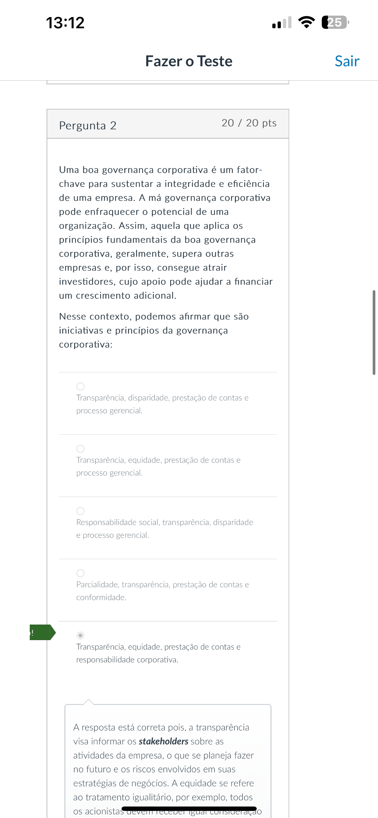 13:12 25 Fazer Teste Sair Pergunta 2 20 / 20 pts Uma boa governança corporativa é um fator- chave para sustentar a integridade e eficiência de uma empresa. A má governança corporativa pode enfraquecer o potencial de uma organização. Assim, aquela que aplica os princípios fundamentais da boa governança corporativa, geralmente, supera outras empresas e, por isso, consegue atrair investidores, cujo apoio pode ajudar a financiar um crescimento adicional. Nesse contexto, podemos afirmar que são iniciativas e princípios da governança corporativa: Transparência, disparidade, prestação de contas e processo gerencial. Transparência, equidade, prestação de contas e processo gerencial. Responsabilidade social, transparência, disparidade e processo gerencial. Parcialidade, transparência, prestação de contas e conformidade. ! Transparência, equidade, prestação de contas e responsabilidade corporativa. A resposta está correta pois, a transparência visa informar os stakeholders sobre as atividades da empresa, que se planeja fazer no futuro e os riscos envolvidos em suas estratégias de negócios. A equidade se refere ao tratamento igualitário, por exemplo, todos os acionistas igual