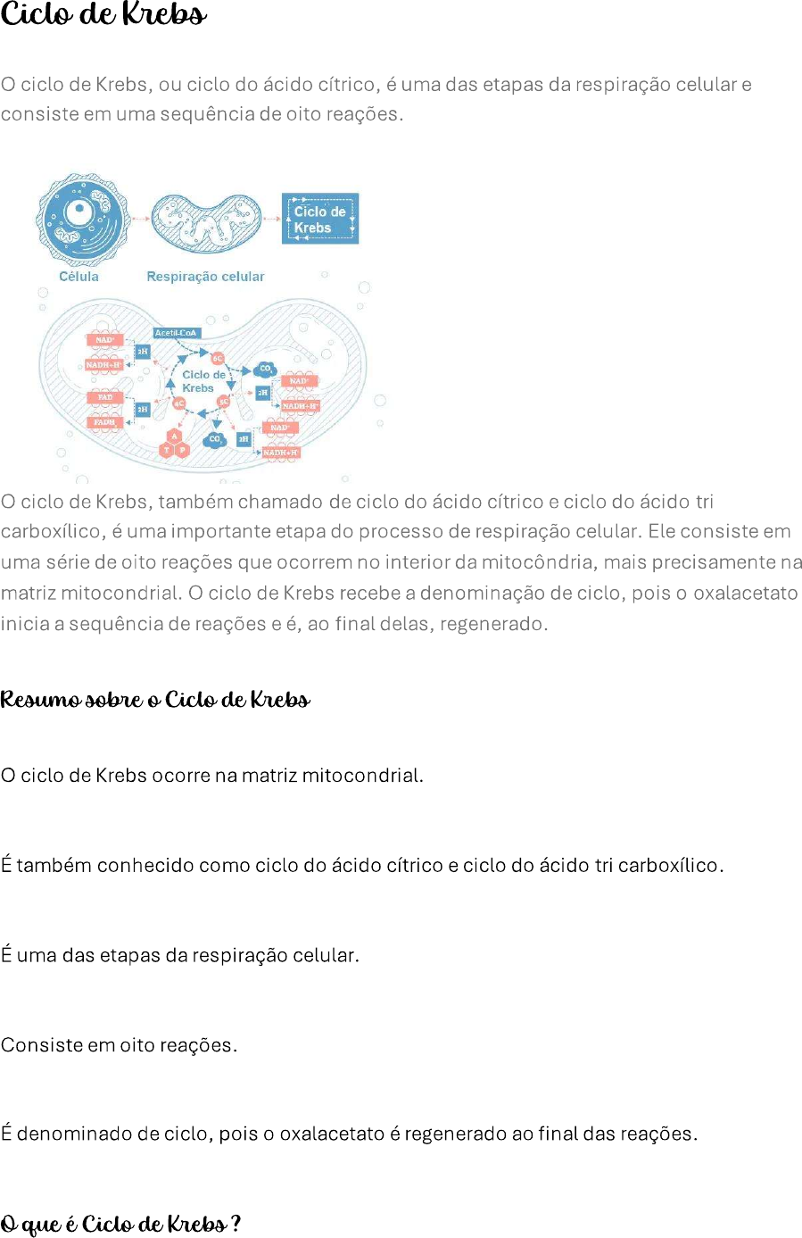 Ciclo de Krebs O ciclo de Krebs, ou ciclo do ácido cítrico, é uma das etapas da respiração celular e consiste em uma sequência de oito reações. Ciclo de Krebs W Célula Respiração celular NAD Ciclo de NAD Krebs 2H FAD 2H is NAD 2H O ciclo de Krebs, também chamado de ciclo do ácido cítrico e ciclo do ácido tri carboxílico, é uma importante etapa do processo de respiração celular. Ele consiste em uma série de oito reações que ocorrem no interior da mitocôndria, mais precisamente na matriz mitocondrial. O ciclo de Krebs recebe a denominação de ciclo, pois oxalacetato inicia a sequência de reações e é, ao final delas, regenerado. Resumo sobre o Ciclo de Krebs O ciclo de Krebs ocorre na matriz mitocondrial. É também conhecido como ciclo do ácido cítrico e ciclo do ácido tri carboxílico. É uma das etapas da respiração celular. Consiste em oito reações. É denominado de ciclo, pois O oxalacetato é regenerado ao final das reações. o que é Ciclo de Krebs ?O ciclo de Krebs é uma etapa da respiração celular que ocorre na mitocôndria, mais precisamente na matriz mitocondrial. Também chamado de ciclo do ácido cítrico e ciclo do ácido tri carboxílico, esse transcurso foi descrito por Hans Krebs no começo da década de 1930. Etapas do ciclo de Krebs O ciclo de Krebs ou ciclo do ácido cítrico ocorre em oito etapas distintas. Cada uma das etapas é catalisada por uma enzima diferente. O ciclo tem início após processo de glicólise, com a entrada do piruvato na mitocôndria. O piruvato é convertido em um composto denominado acetil-CoA ou acetil coenzima A. S-CoA Acetil-CoA CoA-SH COO COO CH Citrato NADH HO HO - CH, H.O H.O COO COO Isocitrato COO Oxaloacetato CH HO CH Malato HC CH CH, COO CO. COO COO COO I I CH CH I HC CH Fumarato a cetoglutarato COO COO COO CoA-SH CH. COO CH, CH. FAD GTP GDP Succinato S-CoA ADP Succinil-CoA ATP Primeira etapa do ciclo de Krebs Na primeira etapa, o grupo acetila do acetil-CoA é transferido a uma molécula de quatro carbonos, o oxaloacetato, produzindo o citrato, forma ionizada do ácido cítrico. O ácido cítrico é um ácido tricarboxílico de seis carbonos, motivo pelo qual o ciclo de Krebs é também chamado de ciclo do ácido cítrico e ciclo do ácido tricarboxílico. Segunda etapa do ciclo de Krebs Na segunda etapa, o citrato é convertido em isocitrato, seu isômero, por meio de uma reação na qual ocorre a remoção de uma molécula de água e adição de uma outra. Terceira etapa do ciclo de KrebsNa terceira etapa, a primeira de quatro etapas de oxidação, o isocitrato é oxidado, e NaD+ é reduzido a NADH. O composto resultante é instável e perde uma molécula de gás carbônico. Quarta etapa do ciclo de Krebs Na quarta etapa, ocorre uma oxidação que produz gás carbônico e reduz NAD+ a NADH. A molécula restante é anexada à coenzima A por meio de uma ligação instável. Quinta etapa do ciclo de Krebs Na quinta etapa, a coenzima A é substituída por um grupo fosfato, formando uma ligação fosfato a succinato de alta energia. O fosfato é transferido ao GDP, formando GTP. O GTP, ou trifosfato de guanosina, é uma molécula parecida em estrutura e função com o ATP. Ele pode ser usado pela célula para produzir ATP ou então diretamente para realização de trabalho. Em bactérias e plantas, há formação de ATP no lugar de GTP. Sexta etapa do ciclo de Krebs Na sexta etapa, terceira etapa de oxidação do ciclo de Krebs, a FAD remove dois átomos de hidrogênio do succinato, levando à formação de FADH2. Sétima etapa do ciclo de Krebs Na sétima etapa, uma molécula de água é adicionada ao fumarato. Oitava etapa do ciclo de Krebs Na oitava etapa, última das quatro etapas de oxidação do ciclo, o substrato é oxidado, reduzindo NAD+ a NADH e regenerando o oxalacetato. Como o oxaloacetato inicia o processo e é regenerado ao fim das oito etapas, dizemos que essa sequência de reações forma um ciclo. mental do ciclo de KrebsCiclo No de Krebs ocorre de Krebs oxidação do uma das etapas No ado da respiração celular na matriz de 1FADH, NADH Krebs 1 Malato 8 2 constituido por the 7 8 etapas Isocitrato FADH ^ 6 3 Cada etapa e'catalisada FAD Succinate CoA-SH CO2 por uma enzima especifica 5 4 GTP GDP ® NADH ESCOLA Rendimento total do ciclo de Krebs No tópico anterior, analisamos os produtos formados em uma única volta no ciclo de Krebs. Entretanto, devemos ter em mente que a glicose origina dois acetil-CoA, portanto, o rendimento total do ciclo por glicose é de 6 NADH, 2 FADH2 e o equivalente a 2 ATP. Ciclo de Krebse a respiração celular O ciclo de Krebs, ou ciclo do ácido cítrico, é uma das etapas do processo de respiração celular. Logo, como uma das etapas da respiração da célula, ocorre após a glicólise, um processo que acontece no citosol e consiste na quebra da glicose em duas moléculas de piruvato. piruvato segue para a mitocôndria, onde é convertido em acetil-CoA, que entra no ciclo de Krebs. Assim, ao final do ciclo, dá-se início à fosforilação oxidativa, a terceira etapa da respiração celular, a qual também ocorre na mitocôndria."