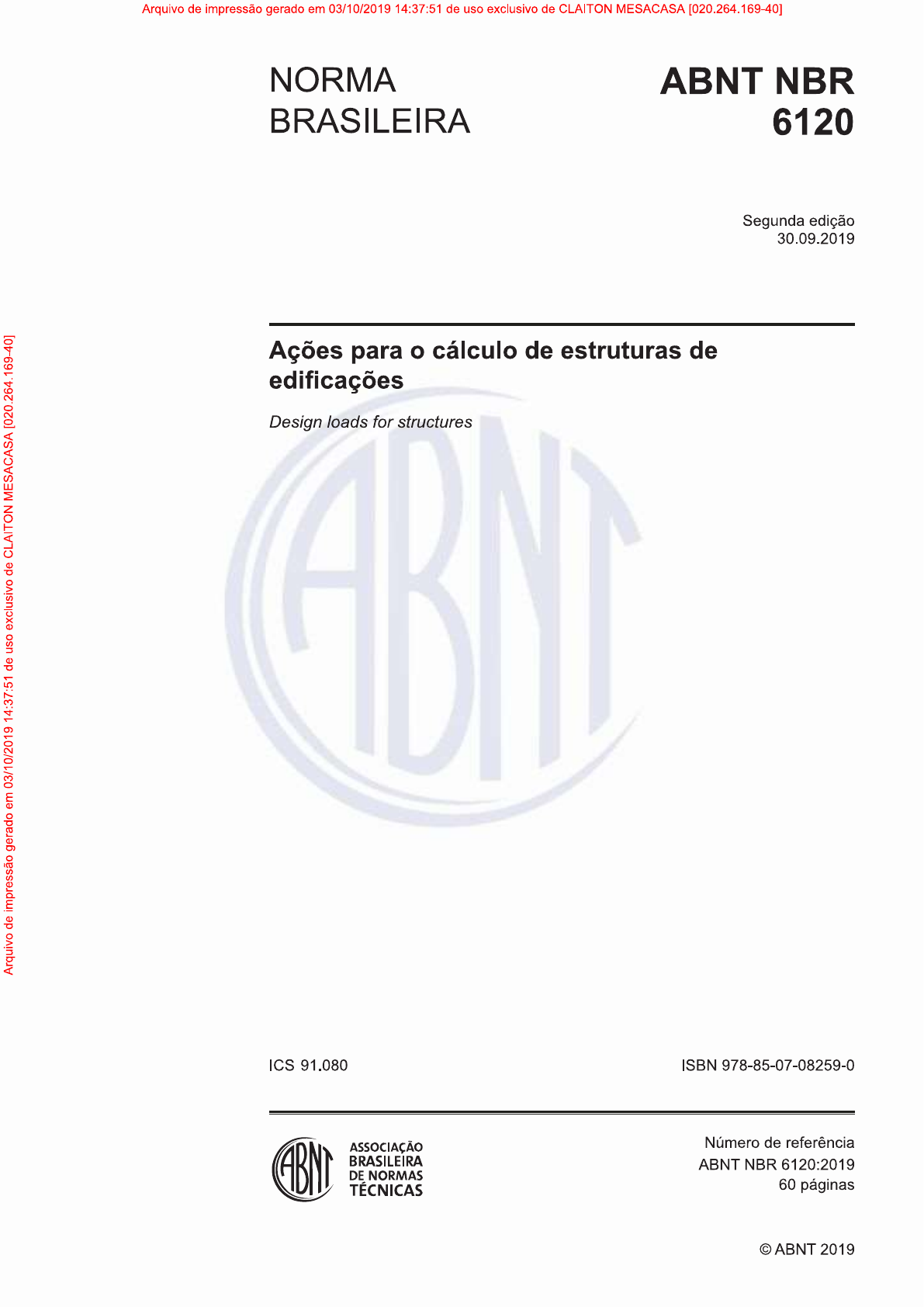 Arquivo de impressão gerado em 03/10/2019 14:37:51 de uso exclusivo de CLAITON MESACASA [020.264.169-40] NORMA ABNT NBR BRASILEIRA 6120 Segunda edição 30.09.2019 Ações para o cálculo de estruturas de edificações Design loads for structures de de de ICS 91.080 ISBN 978-85-07-08259-0 ASSOCIAÇÃO Número de referência ABNT BRASILEIRA ABNT NBR 6120:2019 DE NORMAS TÉCNICAS 60 páginas ABNT 2019Arquivo de impressão gerado em 03/10/2019 14:37:51 de uso exclusivo de CLAITON MESACASA [020.264.169-40] ABNT NBR 6120:2019 de de de ABNT 2019 Todos os direitos reservados. A menos que especificado de outro modo, nenhuma parte desta publicação pode ser reproduzida ou utilizada por qualquer meio, eletrônico ou mecânico, incluindo fotocópia e microfilme, sem permissão por escrito da ABNT. ABNT Av. Treze de Maio, 13 - andar 20031-901 - Rio de Janeiro - RJ Tel.: + 55 21 3974-2300 Fax: + 55 21 3974-2346 abnt@abnt.org.br www.abnt.org.br ii ABNT 2019 - Todos os direitos reservadosArquivo de impressão gerado em 03/10/2019 14:37:51 de uso exclusivo de CLAITON MESACASA [020.264.169-40] ABNT NBR 6120:2019 Sumário Página Prefácio vi 1 Escopo 1 2 Referências normativas 1 3 Termos e definições 2 4 Simbologia 5 4.1 Generalidades 5 4.2 Símbolos 5 4.2.1 Letras minúsculas 5 4.2.2 Letras maiúsculas 6 4.2.3 Letras gregas 6 4.3 Símbolos subscritos 7 4.3.1 Letras minúsculas e abreviaturas 7 4.3.2 Letras maiúsculas 7 5 Ações permanentes 8 5.1 Generalidades 8 de 5.2 Peso próprio da estrutura 8 5.3 Peso específico dos materiais de construção 8 5.4 Peso de componentes construtivos 10 5.5 Ações permanentes devido a materiais de armazenagem 15 de 5.6 Empuxos e pressões hidrostáticas 15 6 Ações variáveis 16 6.1 Generalidades 16 6.2 Cargas variáveis 16 Forças horizontais variáveis 27 6.4 Cargas variáveis em coberturas 29 6.5 Ações de construção 30 6.6 Ações de veículos 31 6.6.1 Ações em garagens e demais áreas de circulação de veículos 31 6.6.2 Empilhadeiras e minicarregadeiras 36 de 6.7 Helipontos 38 6.8 Cargas em fábricas e armazéns 39 6.9 Peso específico de materiais de armazenagem 39 6.10 Ações para pisos e pavimentos de galpões, depósitos e centros de distribuição 39 6.11 Outras ações variáveis 40 6.12 Redução de cargas variáveis 41 Anexo A (normativo) Peso específico aparente médio de materiais de armazenagem 44 Anexo B (informativo) Exemplos de sinalização de garagens e demais áreas de circulação de veículos 50 Anexo C (normativo) Pontes rolantes 51 C.1 Forças verticais 52 C.2 Forças horizontais 53 ABNT 2019 - Todos os direitos reservados iiiArquivo de impressão gerado em 03/10/2019 14:37:51 de uso exclusivo de CLAITON MESACASA [020.264.169-40] ABNT NBR 6120:2019 C.3 Atuação conjunta de pontes rolantes 54 C.3.1 Edificações com um caminho de rolamento e uma nave 54 C.3.2 Edificações com múltiplos caminhos de rolamento e uma ou mais naves, com uma ponte rolante por caminho de rolamento 55 C.3.3 Edificações com múltiplos caminhos de rolamento e uma ou mais naves, com mais de uma ponte rolante por caminho de rolamento 55 C.4 Fadiga 57 Anexo D (normativo) Coberturas - Requisitos contra o fenômeno do empoçamento progressivo 58 Bibliografia 60 Figuras Figura 1 - Forças em pontos de ancoragem 28 Figura 2 - Valores característicos nominais das cargas variáveis para coberturas 30 Figura 3 - Eixo-tipo simples para verificação de cargas concentradas - Categoria II 32 Figura 4 - Eixo-tipo simples para verificação de forças concentradas - Categoria III 33 Figura 5 - Eixo-tipo duplo para verificação de forças concentradas - Categorias IV e V 33 de Figura 6 - Eixo-tipo triplo para verificação de forças concentradas - Categoria IV 34 Figura 7 - Forças horizontais devido ao impacto acidental de veículos 34 Figura 8 - Pilares próximos a descidas de rampas 35 de Figura 9 - Dimensões de empilhadeiras ou minicarregadeiras 37 Figura 10 - Cargas uniformemente distribuídas ao redor de empilhadeiras ou minicarregadeiras 37 Figura 11 - Cargas concentradas para projeto de helipontos 38 Figura 12 - Multiplicadores das cargas variáveis - Exemplos para edificações com um tipo de uso 42 Figura 13 - Multiplicadores das cargas variáveis - Exemplos para edificações com dois e três tipos de uso 42 Figura 14 - Multiplicadores das cargas variáveis - Exemplo de edificação com grupos de pavimentos com diferentes áreas e mesmo tipo de uso 43 Figura B.1 - Exemplos de sinalização - Velocidade máxima permitida 50 de Figura B.2 - Exemplos de sinalização - Altura máxima permitida 50 Figura C.1 - Sistema de ponte rolante típico 51 Figura C.2 - Convenção de direções em planta para pontes rolantes 52 Figura C.3 - Convenção de forças para pontes rolantes 52 Figura C.4 - Convenção de naves e caminhos de rolamento 54 Figura D.1 - Fenômeno do empoçamento progressivo 58 Tabelas Tabela 1 - Peso específico aparente dos materiais de construção 8 Tabela 2 - Alvenarias 11 Tabela 3 - Divisórias e caixilhos 12 Tabela 4 - Revestimentos de pisos e impermeabilizações 12 iv ABNT 2019 - Todos os direitos reservadosArquivo de impressão gerado em 03/10/2019 14:37:51 de uso exclusivo de CLAITON MESACASA [020.264.169-40] ABNT NBR 6120:2019 Tabela 5 - Telhas 13 Tabela 6 - Telhados 13 Tabela 7 - Enchimentos 14 Tabela 8 Forros, dutos e sprinkler 14 Tabela 9 - Tubos de aço cheios d'água 14 Tabela 10 - Valores característicos nominais das cargas variáveis 17 Tabela 11 - Cargas variáveis adicionais para consideração de paredes divisórias sem posição definida em projeto 27 Tabela 12 - Forças horizontais em guarda-corpos e outras barreiras destinadas à proteção de pessoas (continua) 27 Tabela 13 - Ações em garagens e demais áreas de circulação de veículos 32 Tabela 14 - Forças horizontais devido ao impacto em pilares adjacentes a vias públicas ou particulares 36 Tabela 15 - Classes de empilhadeiras e minicarregadeiras 36 Tabela 1