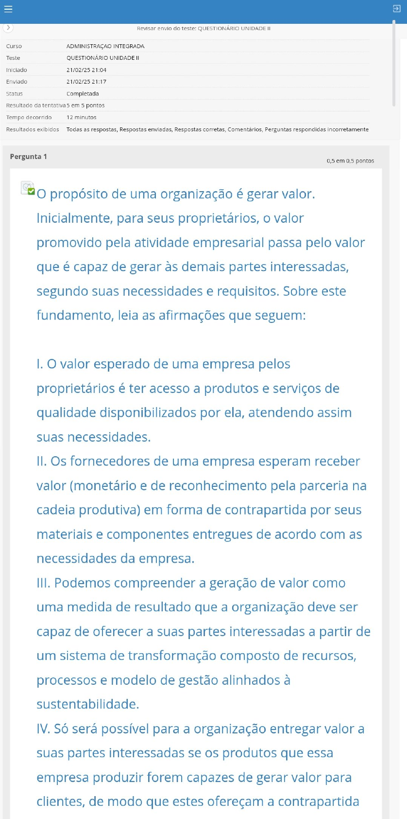 Revisar envio do teste: QUESTIONÁRIO UNIDADE Curso ADMINISTRAÇÃO INTEGRADA Teste QUESTIONÁRIO UNIDADE Iniciado 21/02/25 21:04 Enviado 21/02/25 21:17 Status Completada Resultado da tentativa 5 em 5 pontos Tempo decorrido 12 minutos Resultados exibidos Todas as respostas, Respostas enviadas, Respostas corretas, Comentários, Perguntas respondidas incorretamente Pergunta 1 0,5 em 0,5 pontos propósito de uma organização é gerar valor. Inicialmente, para seus proprietários, o valor promovido pela atividade empresarial passa pelo valor que é capaz de gerar às demais partes interessadas, segundo suas necessidades e requisitos. Sobre este fundamento, leia as afirmações que seguem: I. valor esperado de uma empresa pelos proprietários é ter acesso a produtos e serviços de qualidade disponibilizados por ela, atendendo assim suas necessidades. II. Os fornecedores de uma empresa esperam receber valor (monetário e de reconhecimento pela parceria na cadeia produtiva) em forma de contrapartida por seus materiais e componentes entregues de acordo com as necessidades da empresa. III. Podemos compreender a geração de valor como uma medida de resultado que a organização deve ser capaz de oferecer a suas partes interessadas a partir de um sistema de transformação composto de recursos, processos e modelo de gestão alinhados à sustentabilidade. IV. Só será possível para a organização entregar valor a suas partes interessadas se os produtos que essa empresa produzir forem capazes de gerar valor para clientes, de modo que estes ofereçam a contrapartidaRevisar envio do teste: QUESTIONÁRIO UNIDADE II propósito de uma organização é gerar valor. Inicialmente, para seus proprietários, o valor promovido pela atividade empresarial passa pelo valor que é capaz de gerar às demais partes interessadas, segundo suas necessidades e requisitos. Sobre este fundamento, leia as afirmações que seguem: I. valor esperado de uma empresa pelos proprietários é ter acesso a produtos e serviços de qualidade disponibilizados por ela, atendendo assim suas necessidades. II. Os fornecedores de uma empresa esperam receber valor (monetário e de reconhecimento pela parceria na cadeia produtiva) em forma de contrapartida por seus materiais e componentes entregues de acordo com as necessidades da empresa. III. Podemos compreender a geração de valor como uma medida de resultado que a organização deve ser capaz de oferecer a suas partes interessadas a partir de um sistema de transformação composto de recursos, processos e modelo de gestão alinhados à sustentabilidade. IV. Só será possível para a organização entregar valor a suas partes interessadas se os produtos que essa empresa produzir forem capazes de gerar valor para clientes, de modo que estes ofereçam a contrapartida esperada pela empresa por meio da comercialização de seus produtos. Da análise das afirmações, são verdadeiras somente as afirmações: Resposta Selecionada: d. II, IV.Revisar envio do teste: QUESTIONÁRIO UNIDADE Produtividade, lançado pelo Governo Federal em 1990, foi criado com o objetivo de promover a qualidade e produtividade com vistas a aumentar a competitividade dos bens e serviços produzidos no país. Por meio da mobilização da sociedade para a questão da qualidade e da produtividade, este programa serviu como base para outras ações nesse sentido, em especial a criação da atual Fundação Nacional da Qualidade. Como política industrial, foi responsável pela aceleração no país dos conceitos ligados à qualidade, reduzindo a importância que se dava exclusivamente aos resultados financeiros, que passam a ser vistos como uma consequência de um adequado modelo de gestão organizacional que atenda aos requisitos das partes interessadas da organização. Nesse sentido, analise as duas afirmações a seguir e sua inter-relação: I. A competitividade de uma organização passa pela sua capacidade de entregar valor para suas partes interessadas, especialmente seus clientes, e para isso ter excelência em sua gestão é fator primordial. PORQUE II. A busca permanente pela excelência é ter qualidade na interação com o seu ecossistema, velocidade de aprendizado e capacidade de adaptação diante de novos cenários imprevistos e incontroláveis. Assinale a alternativa Resposta Selecionada: a. As duas afirmações são verdadeiras e a segunda justifica da primeira.Revisar envio do teste: QUESTIONÁRIO UNIDADE Pergunta 3 0,5 em 0,5 pontos A entrega de resultados é intrínseca às organizações. Cabe definir quais serão os resultados a serem entregues. Há resultados compatíveis com expectativas de partes interessadas, assim como há resultados involuntários e até mesmo indesejados que as organizações produzem em função de sua atuação. A capacidade da liderança definir o resultado que será entregue é discutida em relação ao grau de protagonismo que possui o administrador nessa situação. Neste sentido, analise as afirmações a seguir: I. Para ser capaz de exercer influência, é necessário controlar os resultados das decisões, produtos e processos da organização. II. As restrições ambientais limitam a ação gerencial do administrador, impedindo-o de alcançar os objetivos organizacionais diante de fatores externos desfavoráveis. III. controle dos resultados da organização se faz por meio de indicadores de desempenho adequadamente selecionados. Da análise das afirmações, são corretas somente as corretas: Resposta Selecionada: C. Respostas: a. b. C. III.> Revisar envio do teste: QUESTIONÁRIO UNIDADE II Pergunta 4 0,5 em 0,5 pontos Fatores críticos de sucesso para a gestão organizacional são aspectos-chave que permitem que um produto ou negócio seja preferido em relação aos concorrentes. Eles podem ser obtidos a partir de: I. Atributos de produtos e serviços. II. Atividades de um processo organizacional. III. Relações sociais ou empresariais, inclusive parcerias