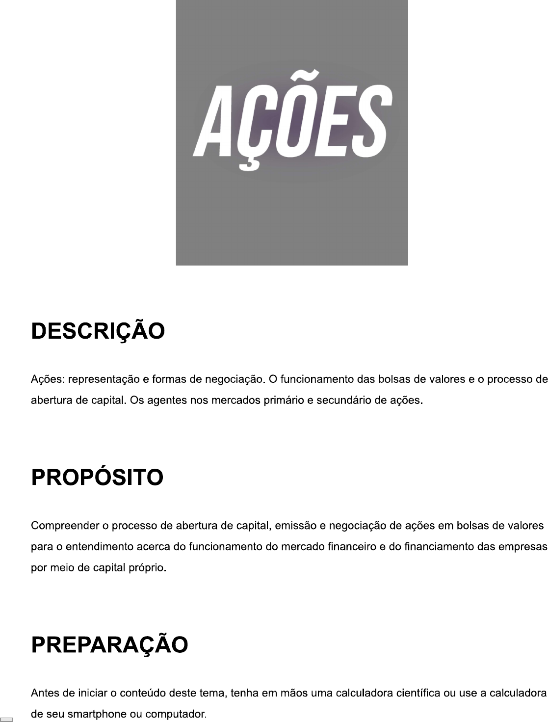 AÇOES DESCRIÇÃO Ações: representação e formas de negociação. funcionamento das bolsas de valores e o processo de abertura de capital. Os agentes nos mercados primário e secundário de ações. PROPÓSITO Compreender o processo de abertura de capital, emissão e negociação de ações em bolsas de valores para o entendimento acerca do funcionamento do mercado financeiro e do financiamento das empresas por meio de capital próprio. PREPARAÇÃO Antes de iniciar o conteúdo deste tema, tenha em mãos uma calculadora científica ou use a calculadora de seu smartphone ou computador.OBJETIVOS MÓDULO 1 Descrever o funcionamento da bolsa de valores MÓDULO 2 Reconhecer as principais etapas do processo de abertura de capital MÓDULO 3 Identificar o papel dos diversos agentes do mercado secundário e sua dinâmica INTRODUÇÃO As ações constituem-se em títulos de propriedade de uma empresa, com a remuneração de seus detentores - os acionistas - vinculada aos resultados da empresa na proporção de sua participação. São, portanto, um importante instrumento de que dispõem as empresas para financiar seus projetos. Esse benefício se torna mais evidente para companhias de capital aberto, que podem ter suas ações negociadas em bolsas de valores, cuja principal no Brasil é a B3 S.A. Neste tema, exploraremos em detalhes o processo de abertura de capital e listagem de ações na B3, suas vantagens e desvantagens, o funcionamento da principal bolsa de valores brasileira e a dinâmica dos mercados primário e secundário deMÓDULO 1 Descrever o funcionamento da bolsa de valores LIGANDO os PONTOS AGE Medical Care Foto: Shutterstock.com Investir no mercado de ações é investir na economia real. E como fazer para investir em economias que estão com altas taxas de crescimento? Vamos descobrir. Os retornos do mercado de ações possuem grande correlação com o crescimento de uma economia. Atualmente, a China é um dos países que apresenta uma das maiores - se não a maior - taxas de crescimento econômico global. Assim, muitos gestores de investimento gostariam de investir no mercado acionário chinês. Apesar de a China possuir 3 das maiores bolsas de valores do mundo: a Shanghai Stock Exchange, a Hong Kong Stock Exchange e a Shenzen Stock Exchange, investir naquele país apresenta alguns desafios. As bolsas de Shanghai e de Shenzen são reguladas pela CSRC - o equivalente à CVM para omercado chinês - e não são abertas totalmente ao público. Por isso, muitas vezes a bolsa de Hong Kong, bem mais aberta, costuma ser a mais procurada por investidores estrangeiros. Felizmente, investir diretamente nas bolsas chinesas não é o único caminho para buscar as rentabilidades que o mercado desse país asiático proporciona. A própria bolsa brasileira dispõe de papéis de algumas empresas chinesas, que podem ser negociados aqui mesmo na B3. São Alibaba (plataforma de e-commerce), Baidu (motor de busca), JD.com (plataforma de e-commerce), Netease (desenvolvedora de jogos), PetroChina (petrolífera) e Trip.com (agência de viagens online). Os negócios envolvendo as ações dessas companhias na B3 utilizam-se de papéis denominados de BDRs - Brazilian Depositary Receipts, que funcionam como certificados que representam ações de empresas listadas em bolsas de outros países. Caso o investidor entenda que são poucas as opções disponíveis na bolsa brasileira, ele ainda tem à sua disposição mais de 100 empresas chinesas listadas nos Estados Unidos, por meio dos ADRs - American Depositary Receipts. Algumas dessas empresas apresentaram crescimentos de até 300% em 2020. Como exemplos, podemos citar a NIO, montadora de veículos elétricos, e a Pinduoduo, plataforma de e-commerce que permite aos usuários participar de transações de compra em grupo. APÓS A LEITURA DO CASE, É HORA DE APLICAR SEUS CONHECIMENTOS! VAMOS LIGAR ESSES PONTOS? 1. COMO VOCÊ VIU, É POSSÍVEL INVESTIR EM MERCADOS EMERGENTES POR MEIO DE PAPÉIS NEGOCIADOS NA BOLSA BRASILEIRA. E PARA AS EMPRESAS LISTADAS NO BRASIL, QUAIS SERIAM AS VANTAGENS DE TEREM SEUS PAPÉIS NEGOCIADOS EM OUTROS MERCADOS? A) Maior liquidez e melhor formação de preços no mercado secundário. B) Capacidade de financiamento de projetos por meio de emissão de novas ações. C) Promoção da marca. D) Aumento das exportações. E) Redução do risco político.2. os CRESCIMENTOS DE ATÉ 300% DE ALGUMAS AÇÕES DE COMPANHIAS CHINESAS NEGOCIADAS NAS BOLSAS AMERICANAS POR MEIO DE ADRS IMPRESSIONAM. NO ENTANTO, SABEMOS QUE HÁ UMA RELAÇÃO ENTRE RETORNO E RISCO. QUAIS DESSES RISCOS UM INVESTIDOR AMERICANO PODERIA INCORRER AO COMPRAR ADRS DE EMPRESAS CHINESAS? A) Risco B) Risco de crédito. C) Risco operacional. D) Risco cibernético. E) Risco cambial. GABARITO 1. Como você viu, é possível investir em mercados emergentes por meio de papéis negociados na bolsa brasileira. E para as empresas listadas no Brasil, quais seriam as vantagens de terem seus papéis negociados em outros mercados? A alternativa "A " está correta. Alcançar um leque maior de investidores com a emissão de depositary receipts em outros mercados, em que pese não representar novos ingressos de recursos na empresa (pois não é uma emissão primária de ações), tem o condão de aumentar o volume de negócios com os papéis no mercado secundário, aumentando a liquidez e melhorando a formação de preços. 2. Os crescimentos de até 300% de algumas ações de companhias chinesas negociadas nas bolsas americanas por meio de ADRs impressionam. No entanto, sabemos que há uma relação entre retorno e risco. Quais desses riscos um investidor americano poderia incorrer ao comprar ADRs de empresas chinesas? A alternativa "E " está correta. Ao investir em ativos do exterior, um investidor fica sujeito ao risco cambial, uma vez que a moeda estrangeira pode apreciar ou depreciar, influenciando o retorno total daquele ativo.3. A NEGOCIAÇÃO DE AÇÕES DE EMPRESAS CHINESAS NA 