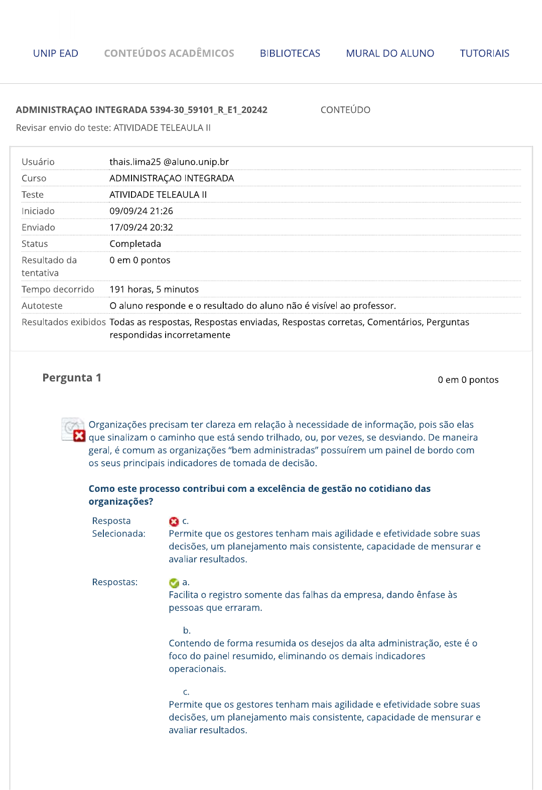 UNIP EAD CONTEÚDOS ACADÊMICOS BIBLIOTECAS MURAL DO ALUNO TUTORIAIS ADMINISTRAÇÃO INTEGRADA 5394-30_59101_R_E1_20242 CONTEÚDO Revisar envio do teste: ATIVIDADE TELEAULA Usuário Curso ADMINISTRAÇÃO INTEGRADA Teste ATIVIDADE TELEAULA Iniciado 09/09/24 21:26 Enviado 17/09/24 20:32 Status Completada Resultado da 0 em 0 pontos tentativa Tempo decorrido 191 horas, 5 minutos Autoteste O aluno responde e o resultado do aluno não é visível ao professor. Resultados exibidos Todas as respostas, Respostas enviadas, Respostas corretas, Comentários, Perguntas respondidas incorretamente Pergunta 1 0 em 0 pontos Organizações precisam ter clareza em relação à necessidade de informação, pois são elas que sinalizam o caminho que está sendo trilhado, ou, por vezes, se desviando. De maneira geral, é comum as organizações "bem administradas" possuírem um painel de bordo com os seus principais indicadores de tomada de decisão. Como este processo contribui com a excelência de gestão no cotidiano das organizações? Resposta C. Selecionada: Permite que os gestores tenham mais agilidade e efetividade sobre suas decisões, um planejamento mais consistente, capacidade de mensurar e avaliar resultados. Respostas: a. Facilita o registro somente das falhas da empresa, dando ênfase às pessoas que erraram. b. Contendo de forma resumida os desejos da alta administração, este é o foco do painel resumido, eliminando os demais indicadores operacionais. C. Permite que os gestores tenham mais agilidade e efetividade sobre suas decisões, um planejamento mais consistente, capacidade de mensurar e avaliar resultados.d. A entrega de resultados é intrínseca às organizações. Cabe somente ao gestor financeiro definir quais serão as métricas e metas, e todos da organização passam a segui-las. e. Os resultados compatíveis com expectativas de partes interessadas são sempre involuntários, e até mesmo indesejados, por isso basta medi- los. Pergunta 2 0 em 0 pontos A gestão de pessoas, ou gestão de recursos humanos, evoluiu muito desde o final do século XX, principalmente com a expansão das telecomunicações, da internet e da globalização. São pessoas indo e vindo diariamente de diversos pontos do planeta, e isso contribuiu para o desenvolvimento econômico, social e maior atenção ao meio ambiente. E, claro, para não ficarem estagnadas, as organizações abusaram do uso de teorias administrativas e modelos de excelência de gestão. Qual é o impacto positivo que as organizações tiveram ao colocar uma lupa sobre seus talentos organizacionais? Resposta a. Selecionada: Entender como está sua força de trabalho e quais são as competências de sua equipe, proporcionando um ambiente mais harmonioso e propício para a busca dos resultados estabelecidos. Respostas: a. Entender como está sua força de trabalho e quais são as competências de sua equipe, proporcionando um ambiente mais harmonioso e propício para a busca dos resultados estabelecidos. b. A alta administração passa a ter indicadores comportamentais, que facilita a tomada de decisão em momentos de crise, resultando em corte de pessoas na equipe. C. Começa a enxergar a dimensão operacional das atividades burocráticas da organização. d. É único caminho que a organização tem para forçar os seus líderes a implantarem um processo de ouvidoria e de melhoria contínua. e. Quebrar os processos gerenciais que se utilizam da estrutura de governança e estabelecer novas diretrizes ocupacionais. Comentário da resposta: Resposta: a) Pergunta 3 0 em 0 pontosTer um sistema de gestão definido colabora diretamente para o bom desempenho da organização, isto porque mantém uma linguagem comum nos processos, nas tarefas e nas atividades diárias. Contudo, a evolução do sistema de gestão também passa pelo aprendizado da organização e pela vivência com outras partes interessadas (benchmarking), ou seja, as pessoas precisam praticar o modelo e ter a capacidade de se ajustar em seu propósito básico. Indique a alternativa correta que pode influenciar na evolução do sistema de gestão. Resposta d. Selecionada: A interação das pessoas e da organização com os elementos do ambiente externo e interno, sempre observando e aprendendo com erros e acertos. Respostas: a. Basta criar uma etapa de Verificação ("Check") que envolve as atividades, os processos de medição ou a avaliação dos resultados, isto vale para os produtos e serviços. b. A partir das informações obtidas dos ambientes interno e externo, criar um painel que force as pessoas a cumprirem os objetivos e as metas definidas pela área de PCP (Produção). C. Avaliar e controlar a gestão por meio, exclusivamente, da área da qualidade, pois é sempre bom ter um especialista. d. A interação das pessoas e da organização com os elementos do ambiente externo e interno, sempre observando e aprendendo com erros e acertos. e. Criar uma área/setor com uma estrutura de monitoramento dos processos e se utilizar de inúmeras práticas de gestão. Comentário da resposta: Resposta: d) Pergunta 4 0 em 0 pontos Ao definir a gestão de riscos da organização, o superintendente determinou que o diretor administrativo passe a usar um modelo de gestão que seja compreendido por toda a organização. De forma célere, o diretor adotou um modelo com três linhas de atuação: 1. Capacitação de todos os colaboradores sobre o modelo de gestão 2. Unificou a metodologia de captar os dados e alimentar o painel de indicadores. 3. Embutiu na cabeça das pessoas que a avaliação de risco deve estar no desenvolvimento do planejamento estratégico. Como ele evoluiu de forma célere e correta este processo na organização?Resposta e. Selecionada: Identificou os riscos aos quais a organização estava sujeita e investiu na realização de oficinas com a participação das áreas, a fim de identificar as causas dos riscos e a definição dos controles internos para mitigaçã