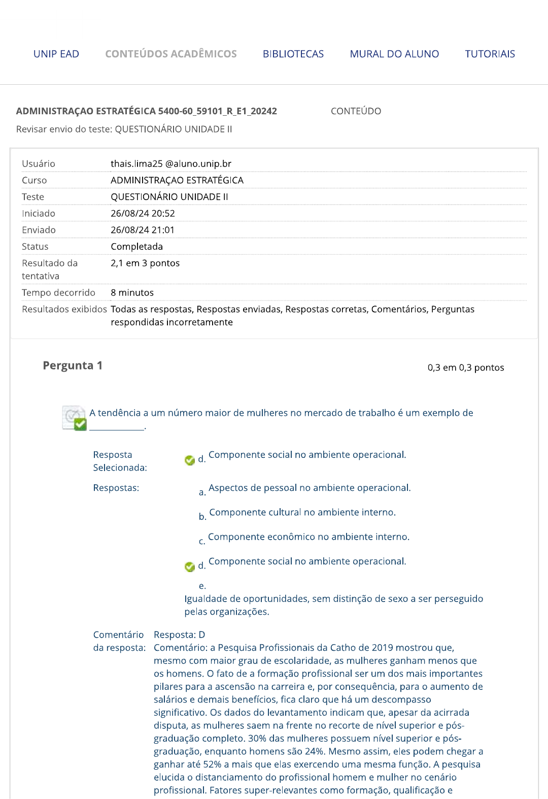 UNIP EAD CONTEÚDOS ACADÊMICOS BIBLIOTECAS MURAL DO ALUNO TUTORIAIS ADMINISTRAÇÃO ESTRATÉGICA 5400-60_59101_R_E1_20242 CONTEÚDO Revisar envio do teste: QUESTIONÁRIO UNIDADE II Usuário Curso ADMINISTRAÇÃO ESTRATÉGICA Teste QUESTIONÁRIO UNIDADE Iniciado 26/08/24 20:52 Enviado 26/08/24 21:01 Status Completada Resultado da 2,1 em 3 pontos tentativa Tempo decorrido 8 minutos Resultados exibidos Todas as respostas, Respostas enviadas, Respostas corretas, Comentários, Perguntas respondidas incorretamente Pergunta 1 0,3 em 0,3 pontos A tendência a um número maior de mulheres no mercado de trabalho é um exemplo de Resposta d. Componente social no ambiente operacional. Selecionada: Respostas: a. Aspectos de pessoal no ambiente operacional. b. Componente cultural no ambiente interno. C. Componente econômico no ambiente interno. d. Componente social no ambiente operacional. e. Igualdade de oportunidades, sem distinção de sexo a ser perseguido pelas organizações. Comentário Resposta: D da resposta: Comentário: a Pesquisa Profissionais da Catho de 2019 mostrou que, mesmo com maior grau de escolaridade, as mulheres ganham menos que os homens. fato de a formação profissional ser um dos mais importantes pilares para a ascensão na carreira e, por consequência, para o aumento de salários e demais benefícios, fica claro que há um descompasso significativo. Os dados do levantamento indicam que, apesar da acirrada disputa, as mulheres saem na frente no recorte de nível superior e pós- graduação completo. 30% das mulheres possuem nível superior e pós- graduação, enquanto homens são 24%. Mesmo assim, eles podem chegar a ganhar até 52% a mais que elas exercendo uma mesma função. A pesquisa elucida o distanciamento do profissional homem e mulher no cenário profissional. Fatores super-relevantes como formação, qualificação eexperiência profissional não bastam para igualar a balança. Apesar dos perceptíveis avanços, ainda há obstáculos a serem superados. 52% é a maior disparidade nas médias salariais entre homens e mulheres identificada por nível de cargo. São nas ocupações de profissional especialista e graduado que as remunerações por gênero mais se distanciam, seguidos de profissional especialista técnico com 47% de diferença. Em outras posições que costumam ter mais participação de mulheres, a diferença salarial tem menor expressividade. As mulheres ocupam 66% dos cargos de assistente e/ou auxiliar e a diferença salarial é de Já em relação aos cargos de analista, 53% são ocupados por mulheres e a diferença salarial é de 14%. Pergunta 2 0 em 0,3 pontos Segundo Michael Porter, as empresas precisam fazer uma opção entre três estratégias genéricas para alcançar desempenho acima da média na indústria. São elas: Resposta Selecionada: [Sem Resposta] Respostas: Liderança em produto, diferenciação e foco. a. b. Pontos fortes e fracos, ameaças e oportunidades. C. Liderança em produto, diferenciação e segmentação. d. Liderança em custo, diferenciação e foco. Nenhuma das alternativas está correta. e. Pergunta 3 0,3 em 0,3 pontos Com base nas afirmações, identifique a sequência correta: I. Um bom planejamento estratégico não deve se envolver com questões menores, tais como objetivos, metas e desafios, qualitativos ou quantitativos para a entidade, que serão objeto de um detalhamento operacional do dia a dia. II. Os principais aspectos do negócio que devem ser abordados num bom plano estratégico são os aspectos institucionais, comerciais, financeiros, tecnológicos, de informática, de capacitação e de motivação de recursos humanos da instituição. III. As transformações estratégicas devem ser realizadas por meio da contínua adequação das estratégias, da capacitação, da estrutura e da infraestrutura física e logística da empresa ou entidade. IV. Uma boa metodologia de gestão estratégica deve dar ênfase, além de boa conceituação e formulação de estratégicas, na implementação das estratégias e dos planos de ação, sem descurar dos mecanismos formais de acompanhamento dos resultados e da eficácia das implantações. V. A implantação da gestão estratégia numa organização pode realmente, assegurar seu crescimento, continuidade e sobrevivência no longo prazo.Resposta Selecionada: a. Respostas: a. b. FVFVF. VFVFV. C. d. FVVVV. e. Comentário Resposta: A da resposta: Comentário: as empresas buscaram uma forma de equilibrar objetivos, aumentar a participação, descentralizar decisões, permitir autocontrole e autoavaliação, maior liberdade e relaxamento de controles. Surgiu a descentralização e a administração por resultados para reverter o processo: fixação de objetivos para cada área-chave da empresa, descentralização das decisões e centralização de controles. Cada departamento escolheria como atingir os resultados. Aboliram-se os órgãos de staff, ficando a cargo de cada departamento a criação de serviços de que necessitasse para atingir seus objetivos, o que fortaleceu a posição de autoridade dos respectivos gerentes (CHIAVENATO, 2004, p. 228). Pergunta 4 0,3 em 0,3 pontos As maiores responsabilidades que os dirigentes das instituições têm, com os futuros dirigentes que virão sucedê-los um dia, são: Resposta C. Selecionada: Construir e manter uma instituição saudável e com um futuro claro e delineado. Respostas: Garantir a rentabilidade e a lucratividade do negócio. a. b. Manter uma boa imagem da entidade no mercado. C. Construir e manter uma instituição saudável e com um futuro claro e delineado. d. Recrutar e manter pessoal capacitado e treinado. Nenhuma alternativa está correta. e. Comentário da Resposta: C resposta: Comentário: empresas comprometidas com pessoas e ambiente se mantêm saudáveis e dessa forma precisam ter objetivos e metas estruturadas. Pergunta 5 0,3 em 0,3 pontosA cadeia de valor é um modelo desenvolvido por Michael Poter nos 
